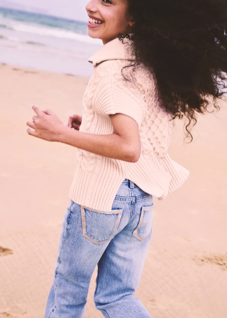 Kolekcja Powrót do szkoły. Dzianina ze splotem. Model prosty. Półgolf na zamek. Bez rękawów. Bawełna 100%.