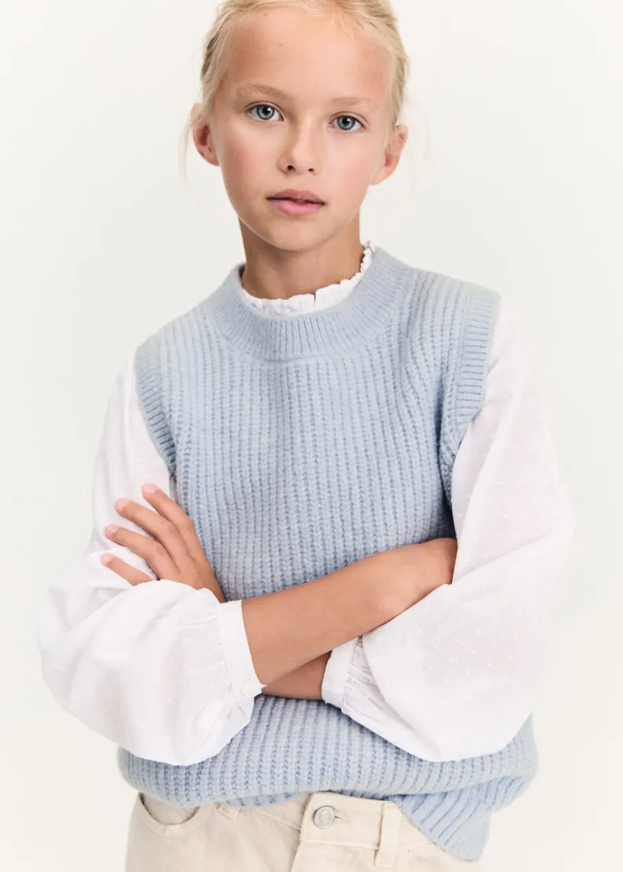 Kolekcja Powrót do szkoły. Model prosty. Tkanina z grubej dzianiny. Bez rękawów. Okrągły dekolt.