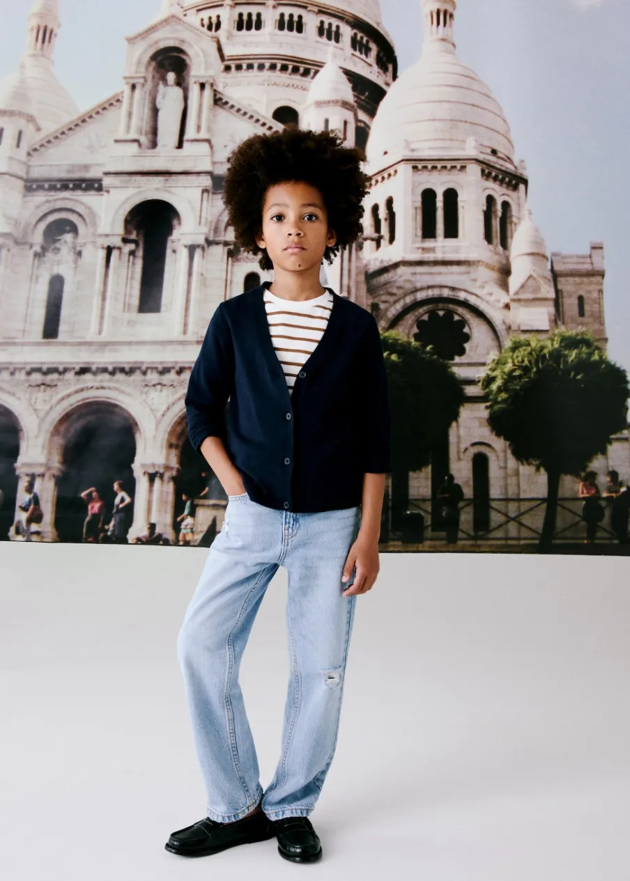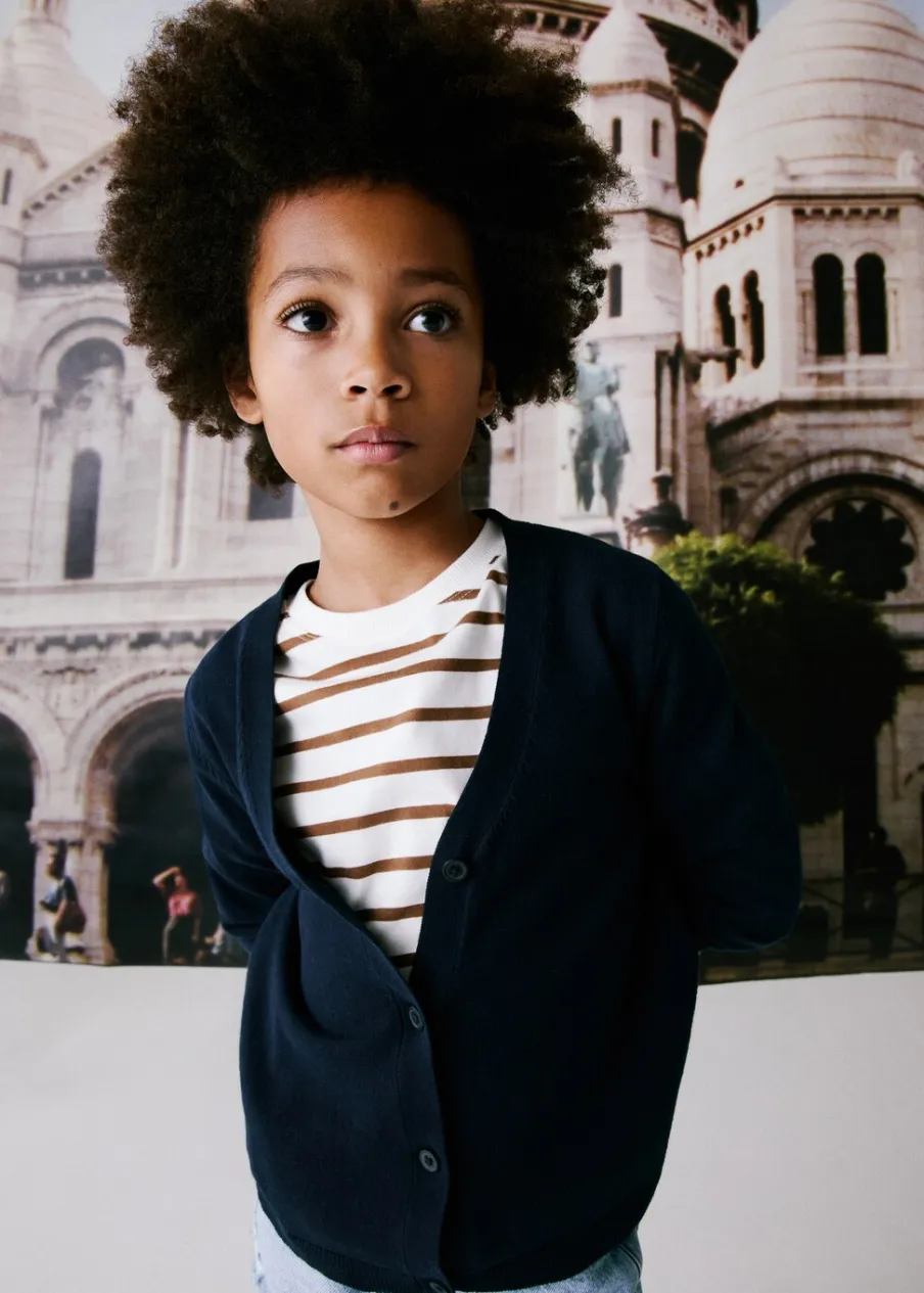 Kolekcja Powrót do szkoły. Tkanina z bawełną. Tkanina z cienkiej dzianiny. Dekolt V. Długi rękaw. Model prosty. Zapięcie na guziki.