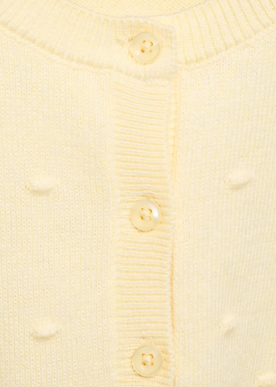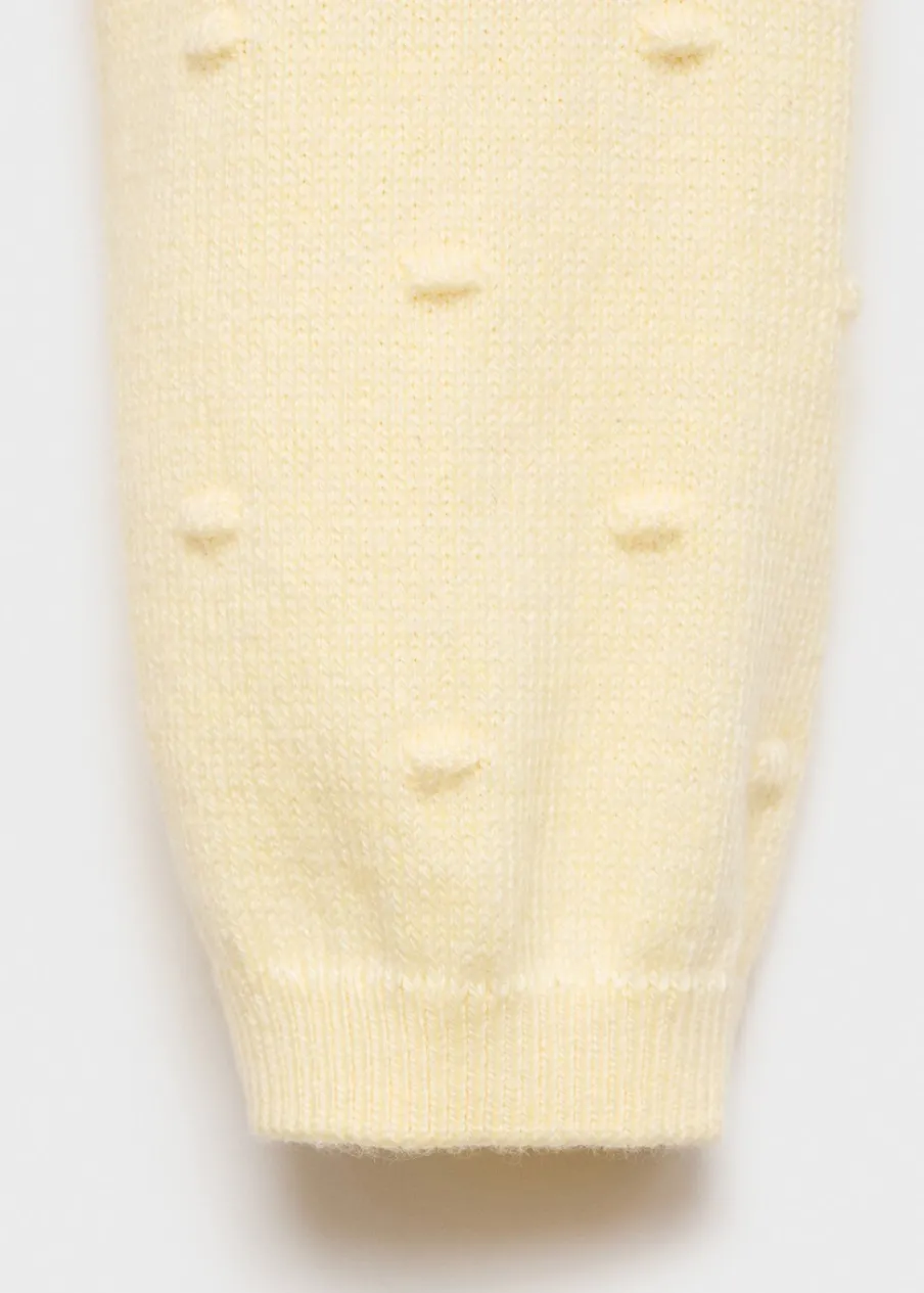 Bawełniana tkanina. Ogrodniczki z dzianiny. Okrągły dekolt. Kołnierz, mankiety i dół z prążkowanej dzianiny. Zapięcie na guziki z przodu.