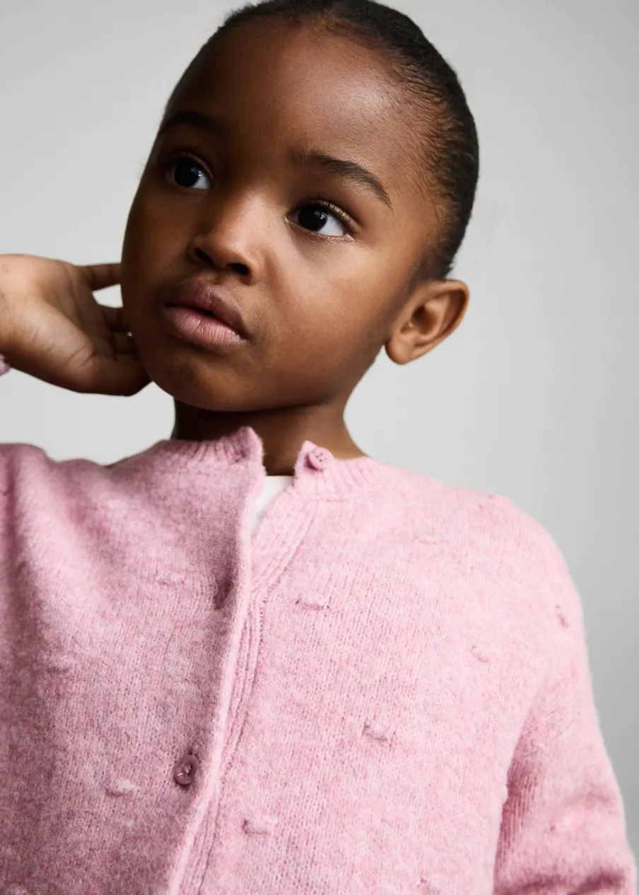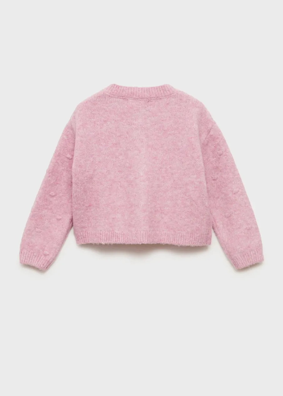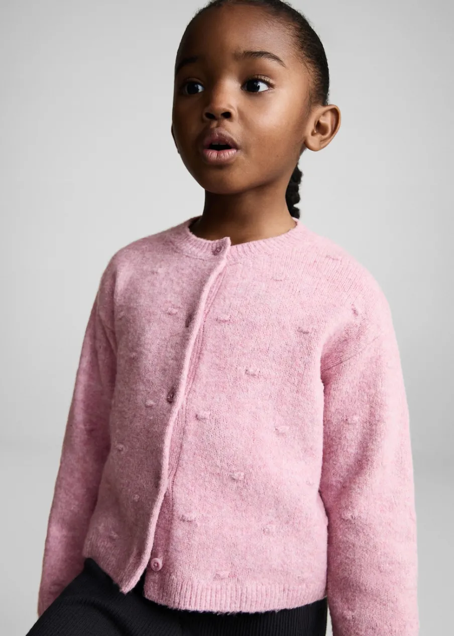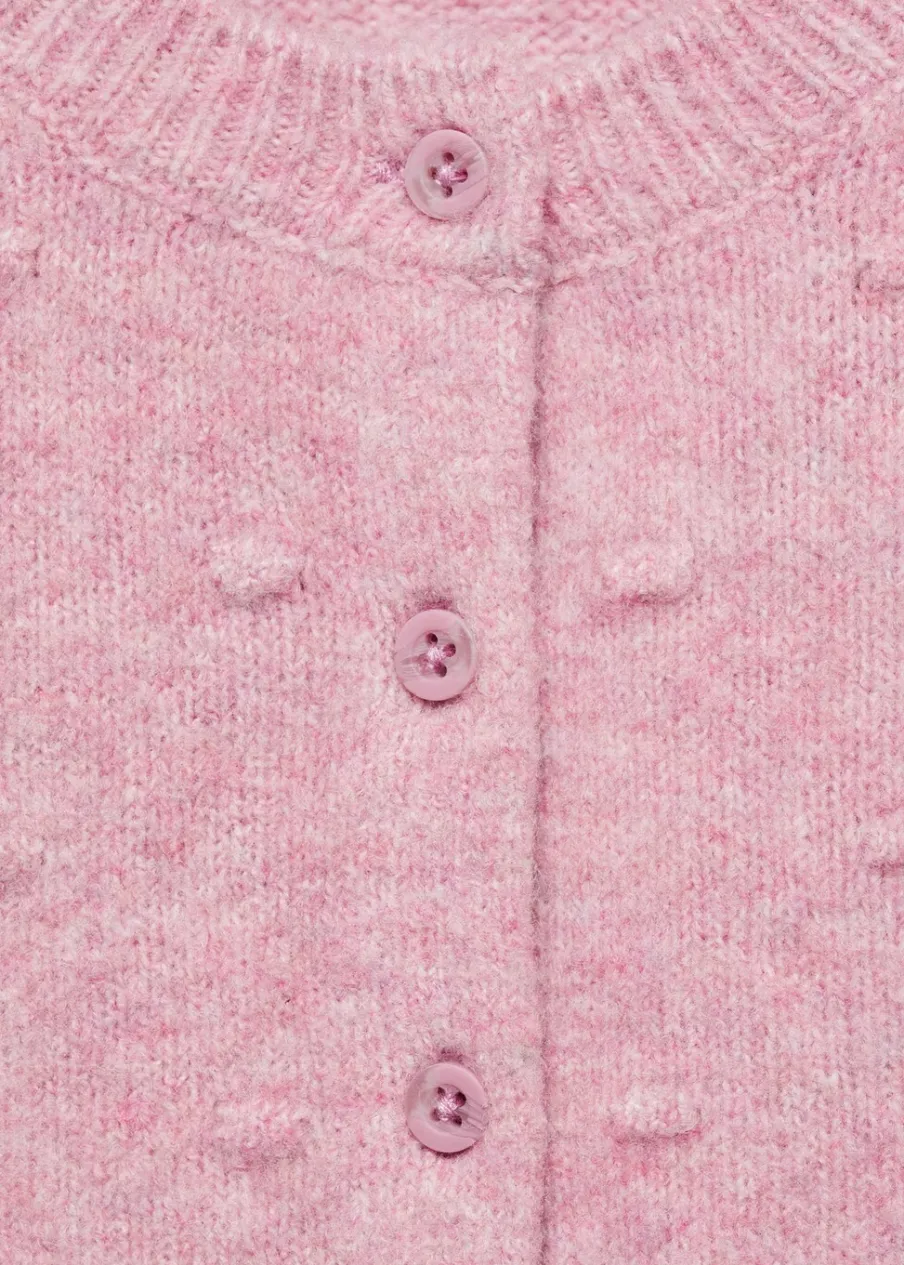 OpisTkanina z cienkiej dzianiny. Ozdoba z frędzli. Okrągły dekolt. Długi rękaw. Zapięcie na guziki z przodu.