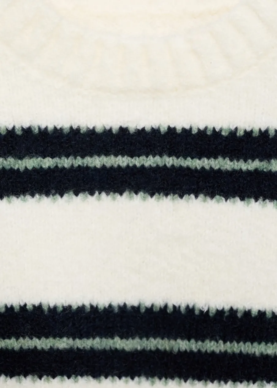 OpisDzianinowa tkanina. Model prosty. Wzór w paski. Okrągły dekolt. Model standardowy. Długi rękaw. Bez zapięcia.