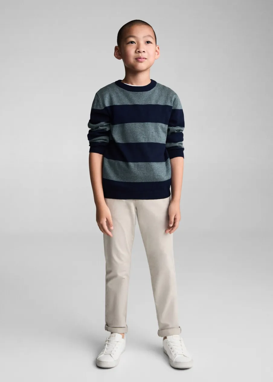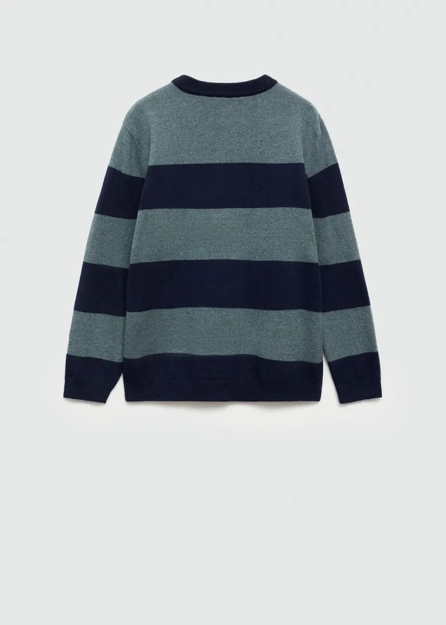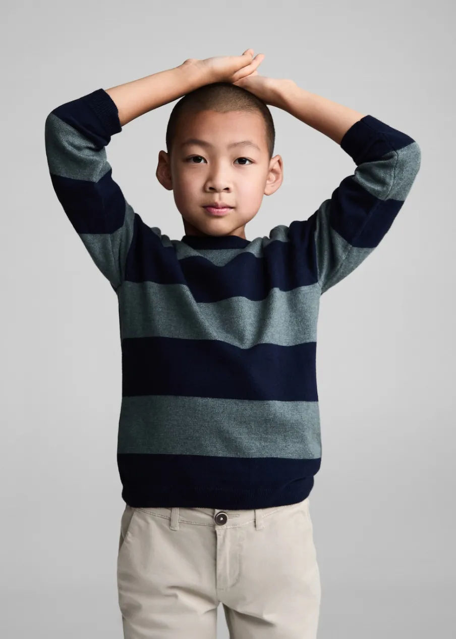 OpisTkanina z cienkiej dzianiny. Model prosty. Okrągły dekolt. Długi rękaw. Wzór w paski.
