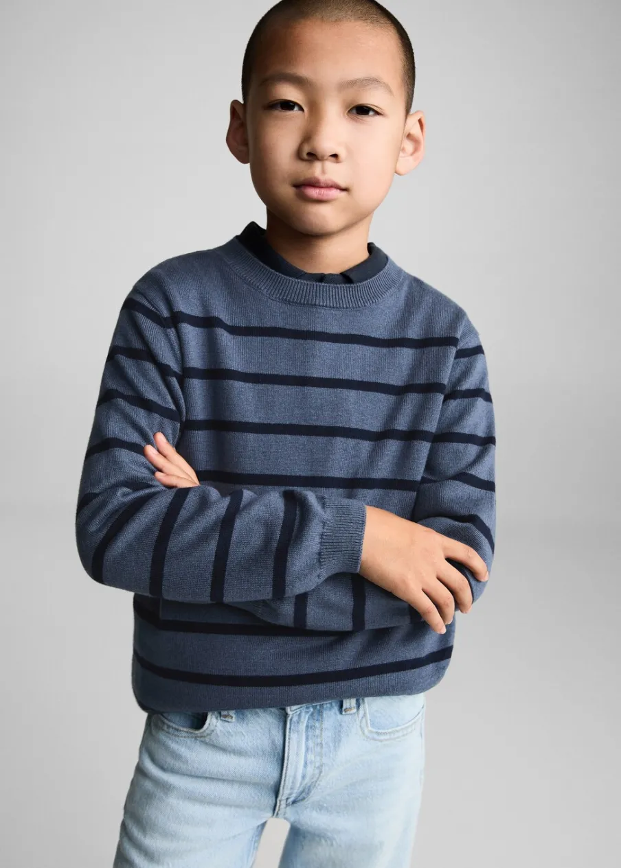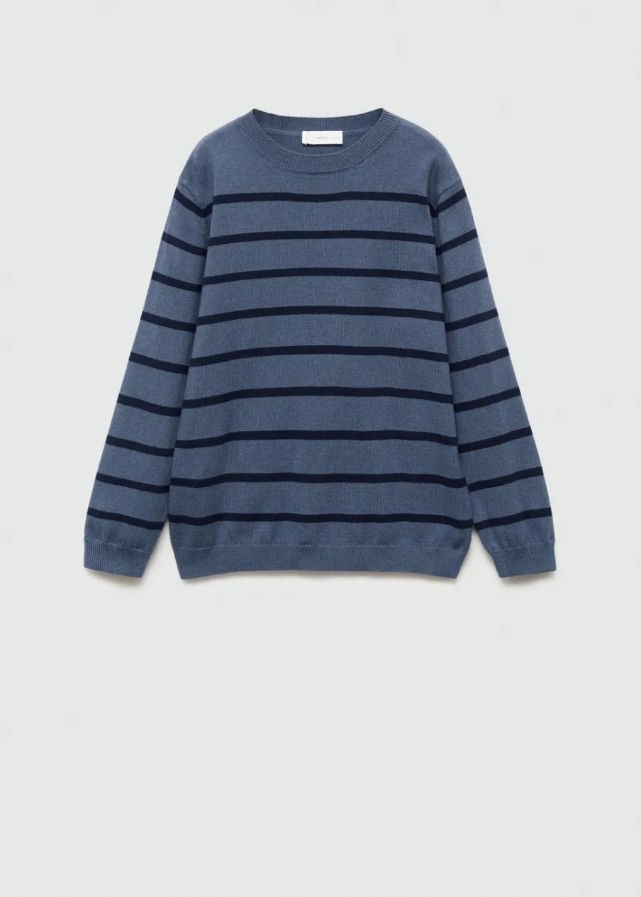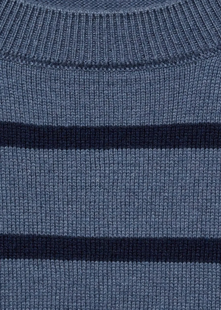 Model prosty. Dzianinowa tkanina. Okrągły dekolt. Długi rękaw. Bez zapięcia. Wzór w paski.
