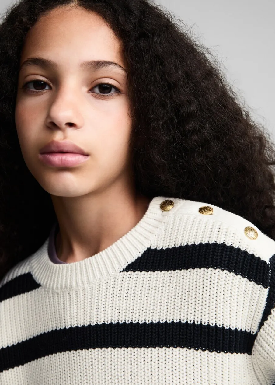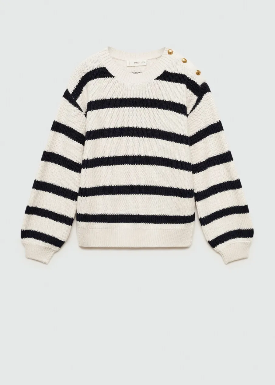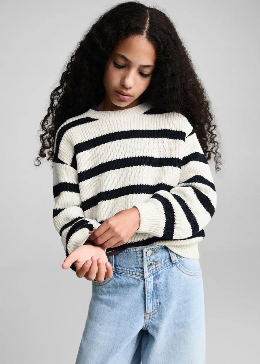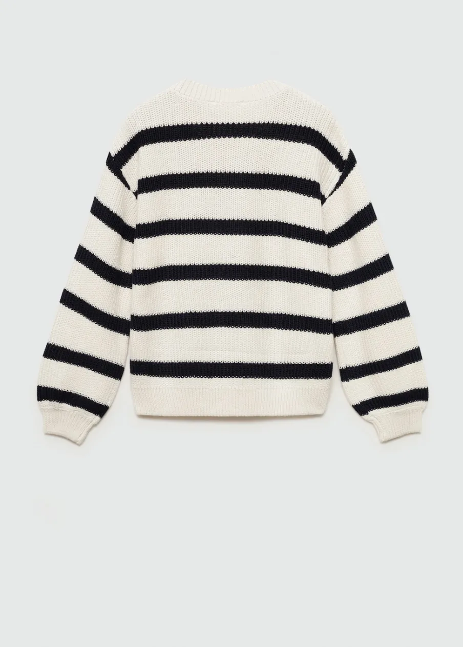 Dzianinowa tkanina. Okrągły dekolt. Bez zapięcia. Długi rękaw. Model prosty. Wzór w paski.