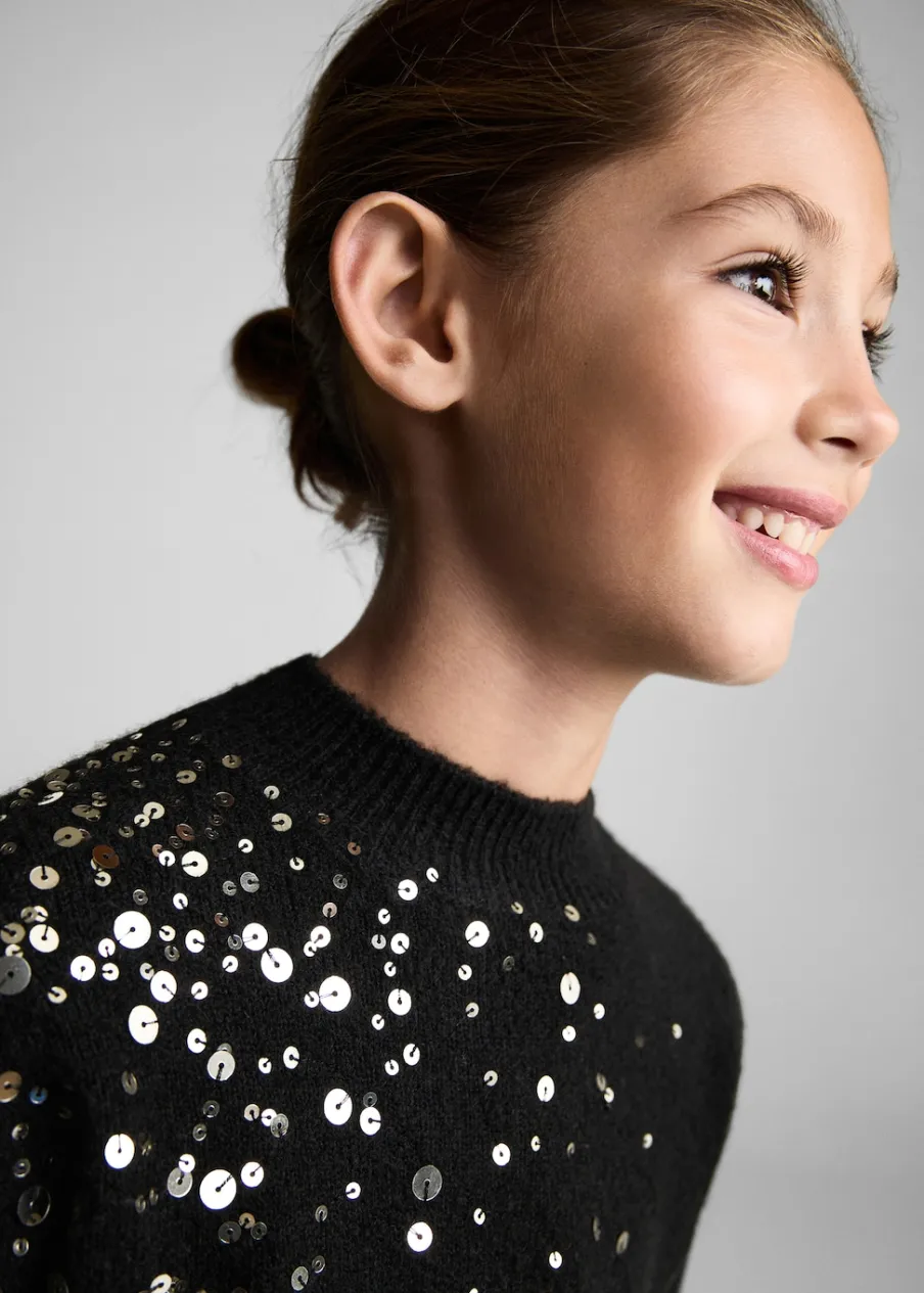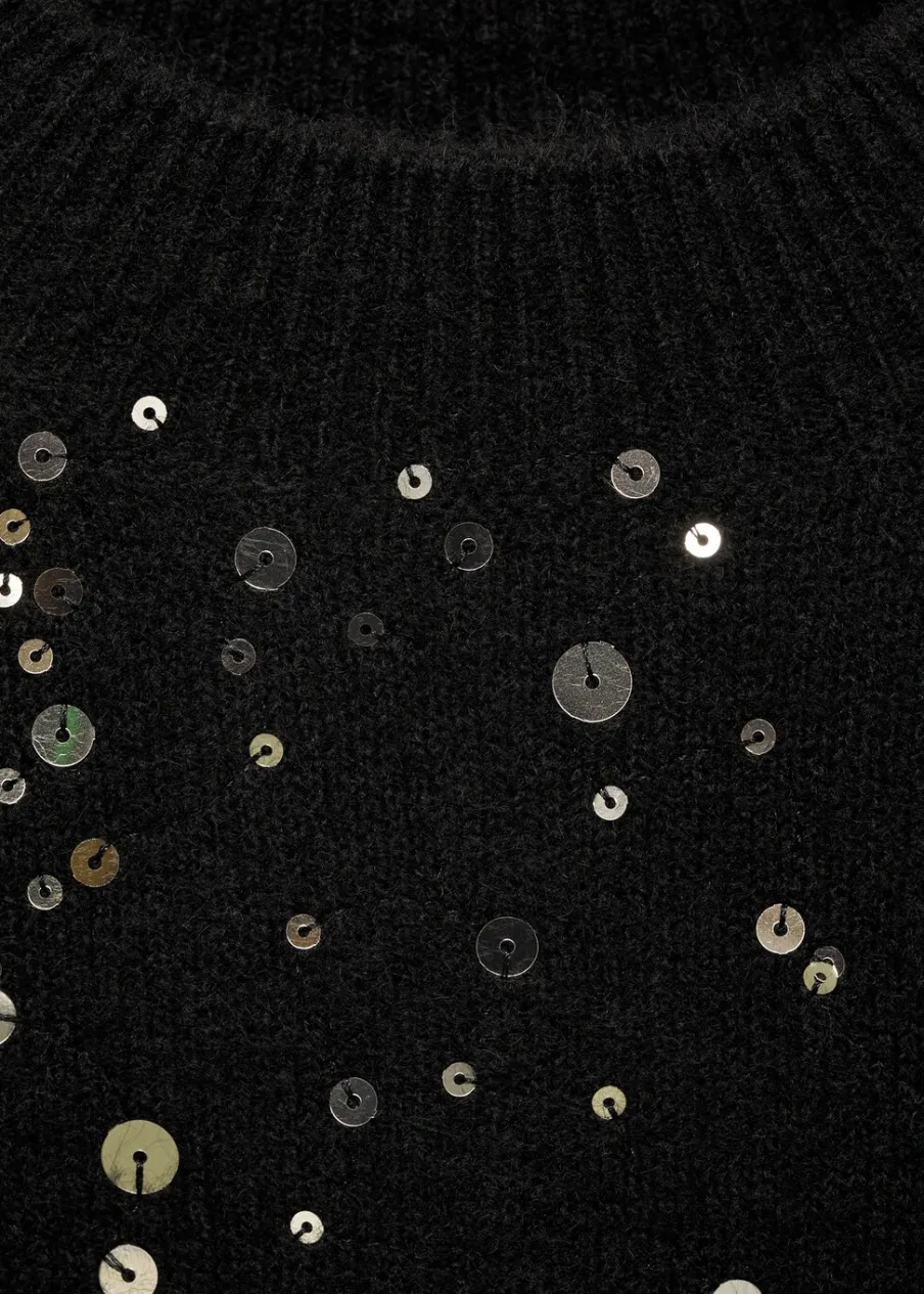 Długi rękaw. Model prosty. Dzianinowa tkanina. Ozdobna aplikacja z cekinów. Kolekcja wieczorowa i imprezowa. Okrągły dekolt.