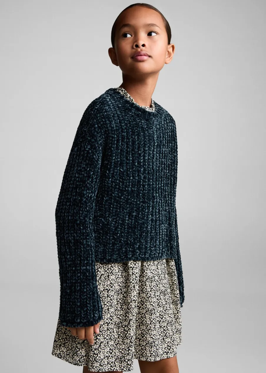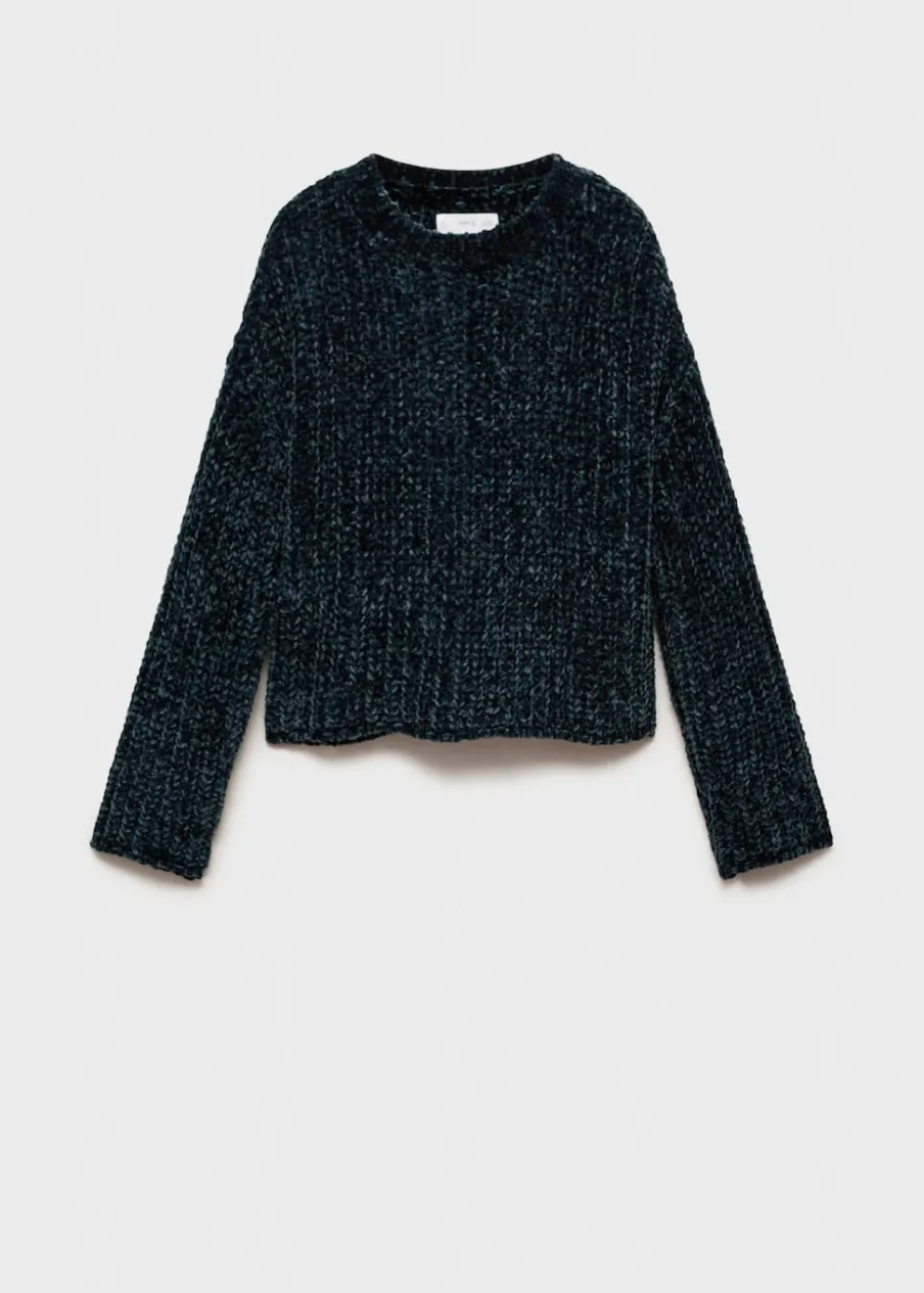 Tkanina z grubej dzianiny. Model prosty. Okrągły dekolt. Długi rękaw. Bez zapięcia.