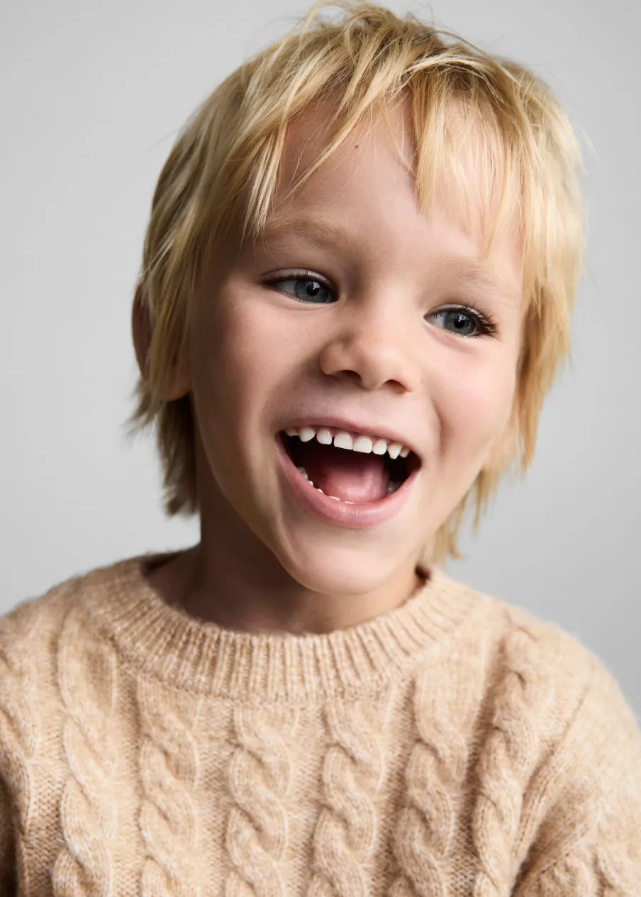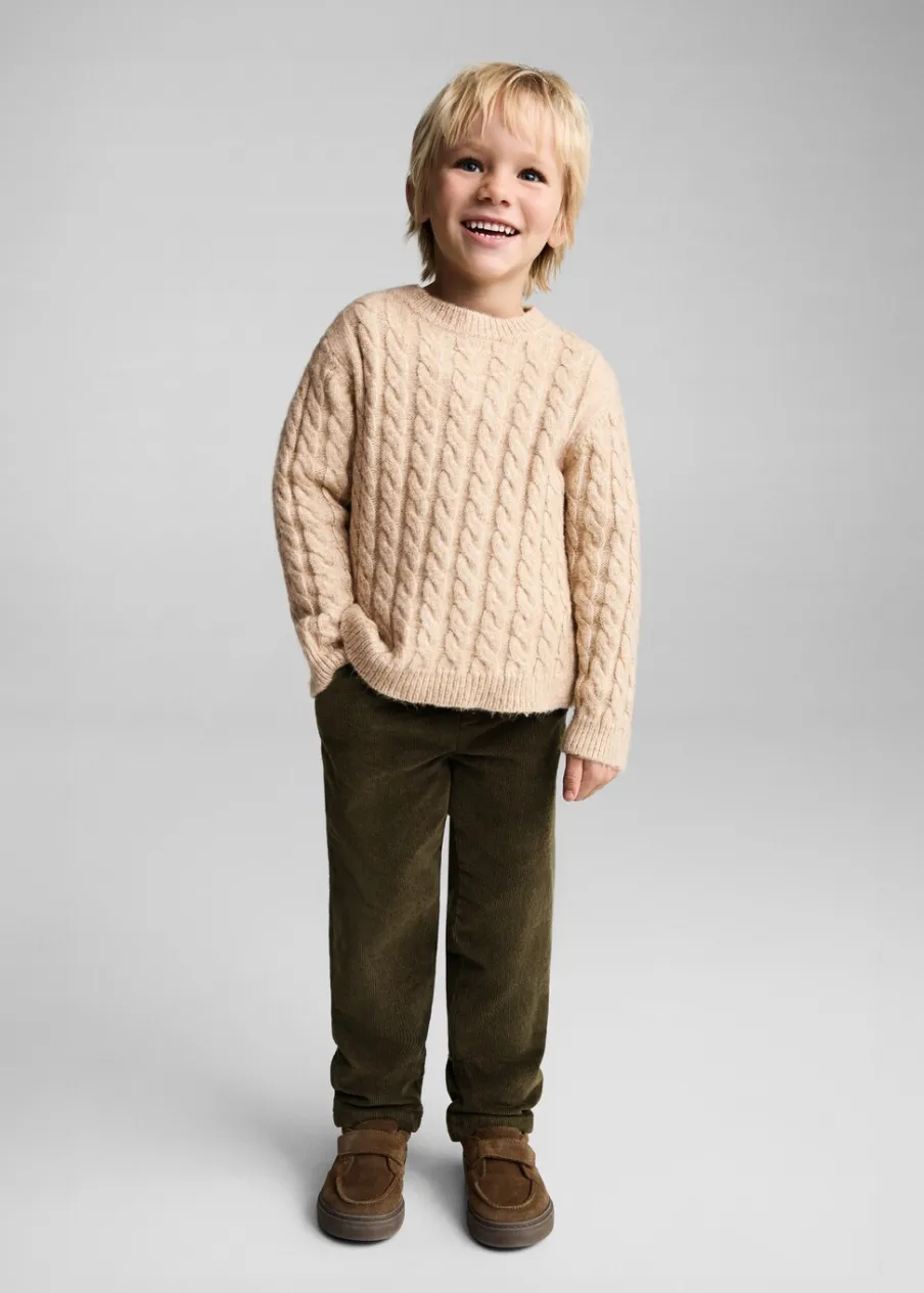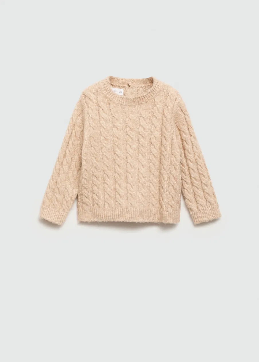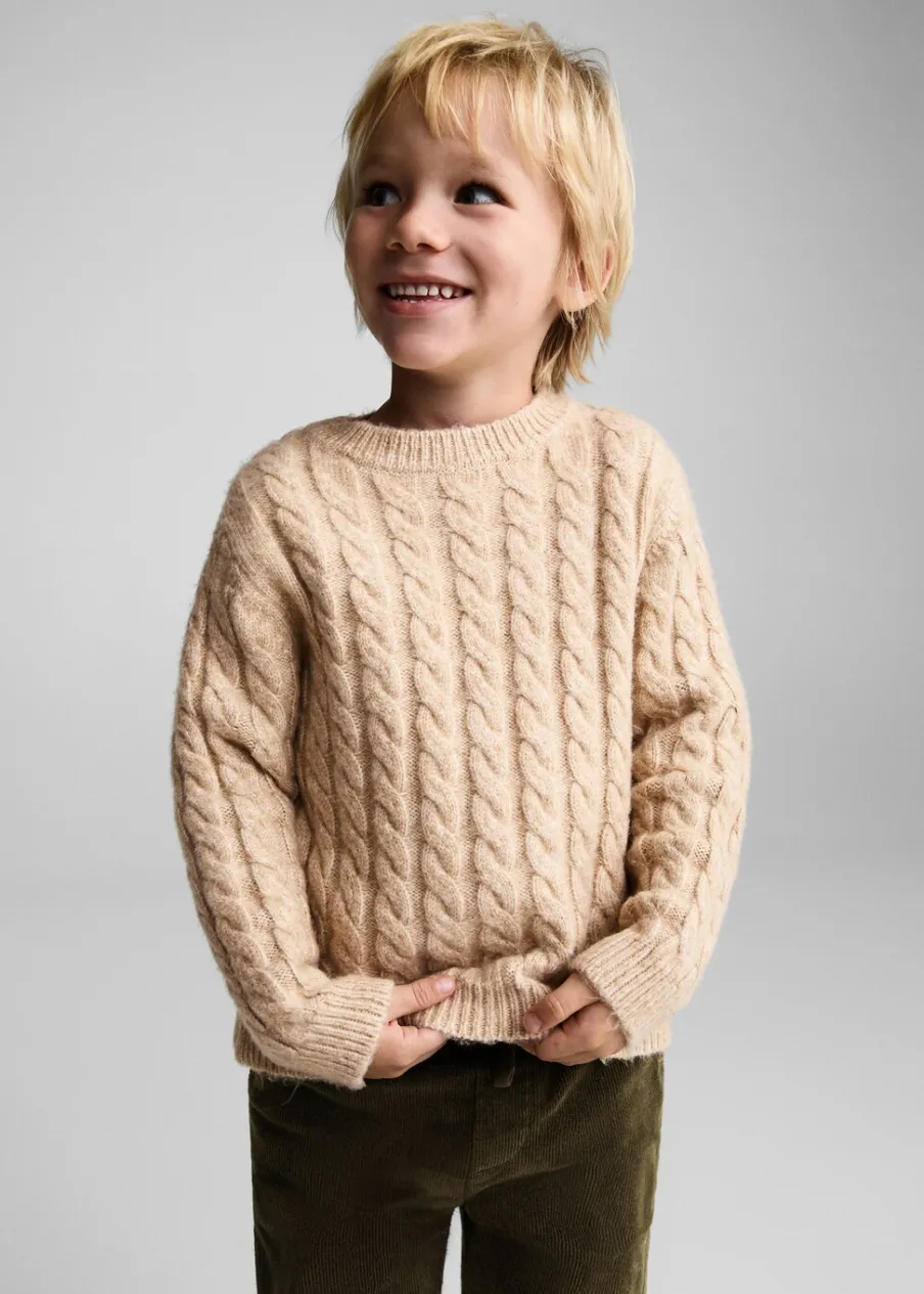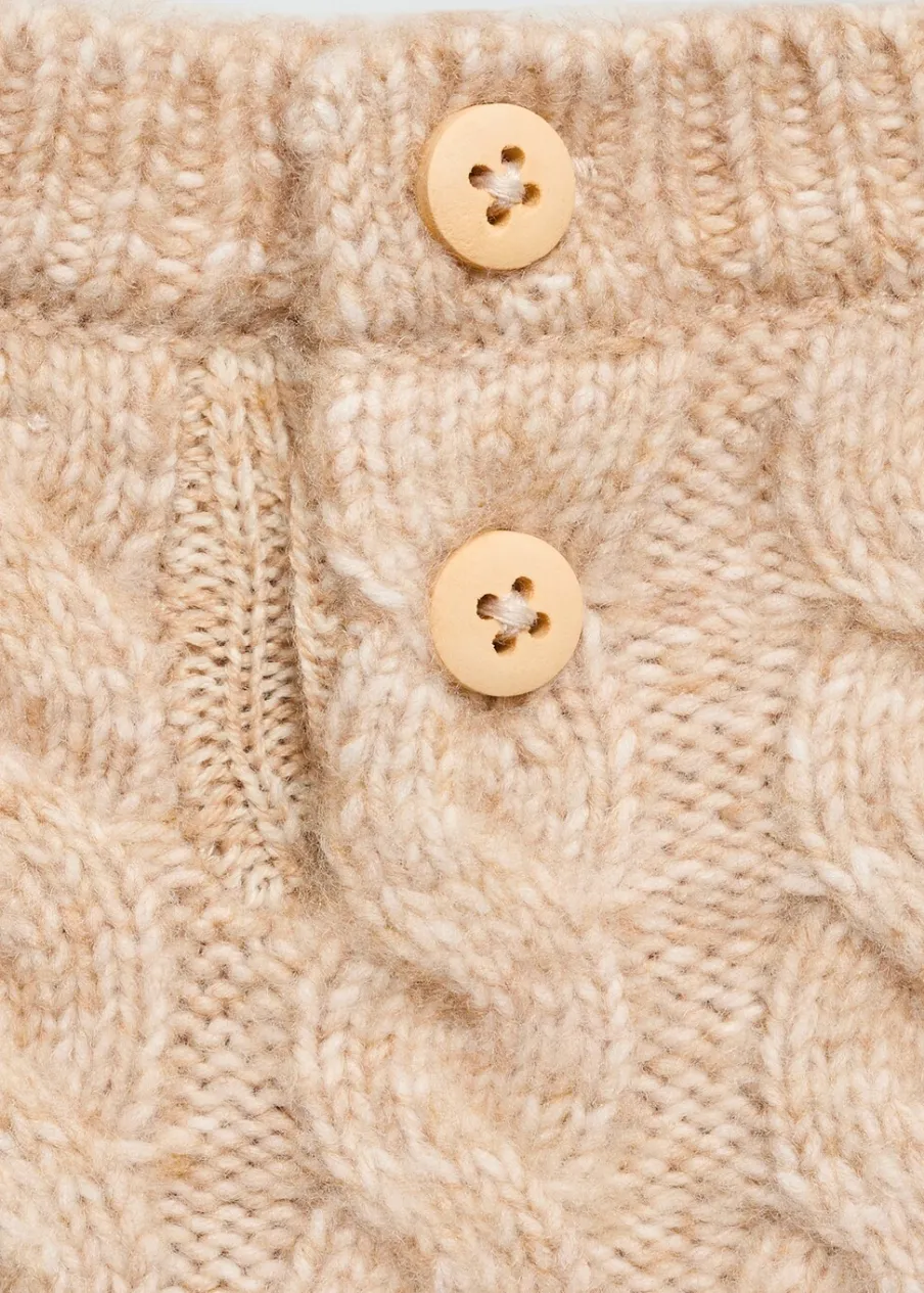 Normál fazon, iskolakezdés, kerek nyakkivágás, durva kötésű anyag, egyenes kialakítás, fonott mintás kötött anyag, kerek nyak, hosszú ujj, gombos záródás.