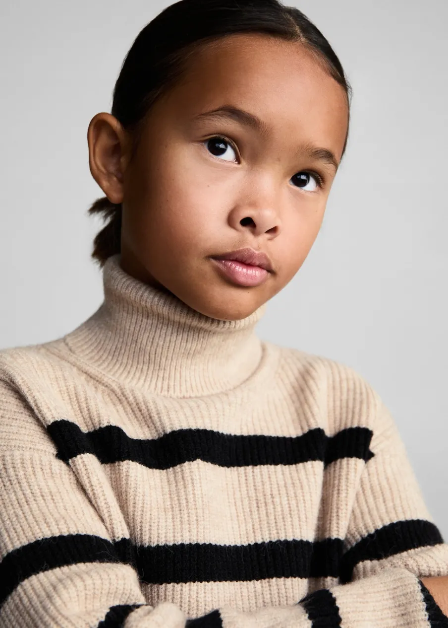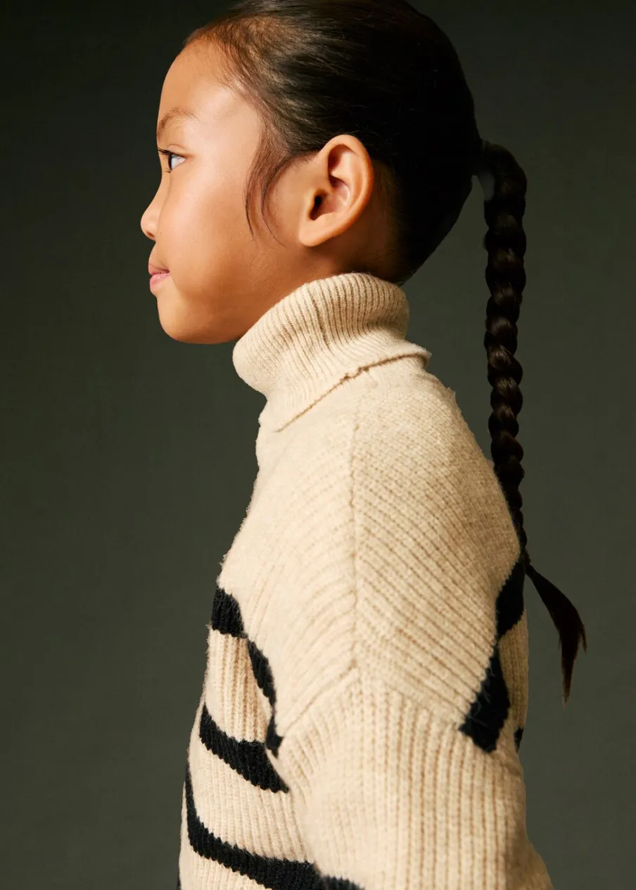 OpisTkanina z grubej dzianiny. Model prosty. Wzór w paski. Golf. Długi rękaw.
