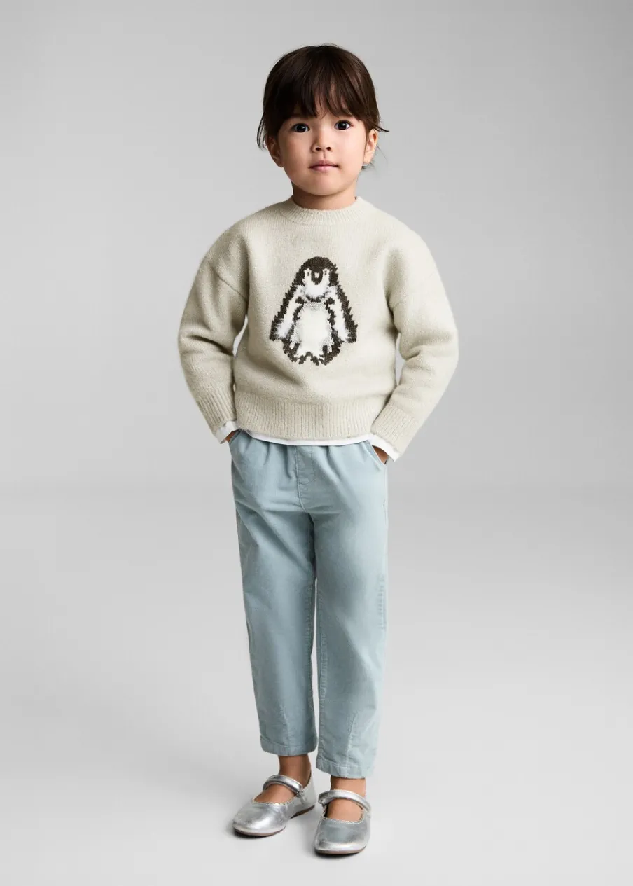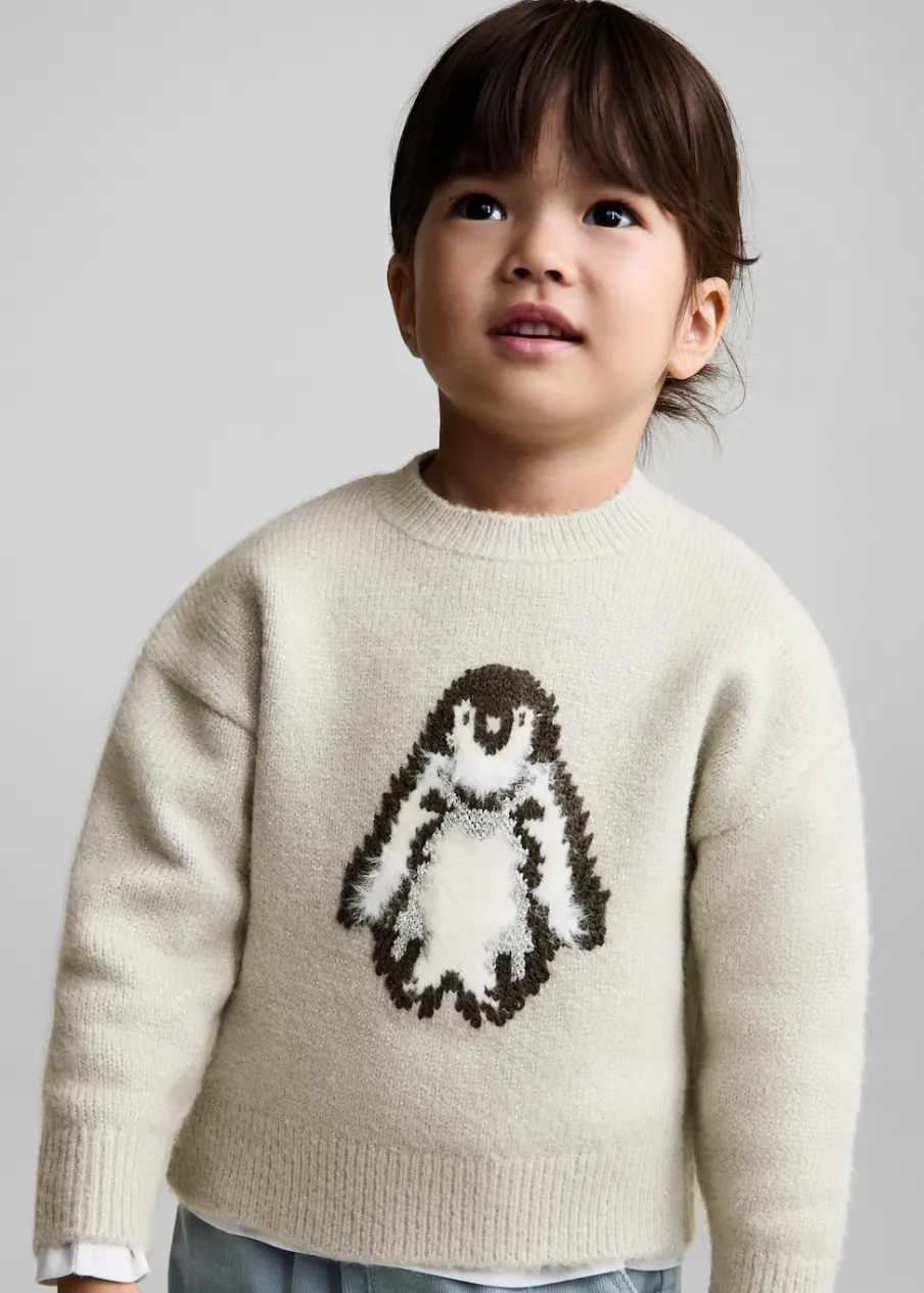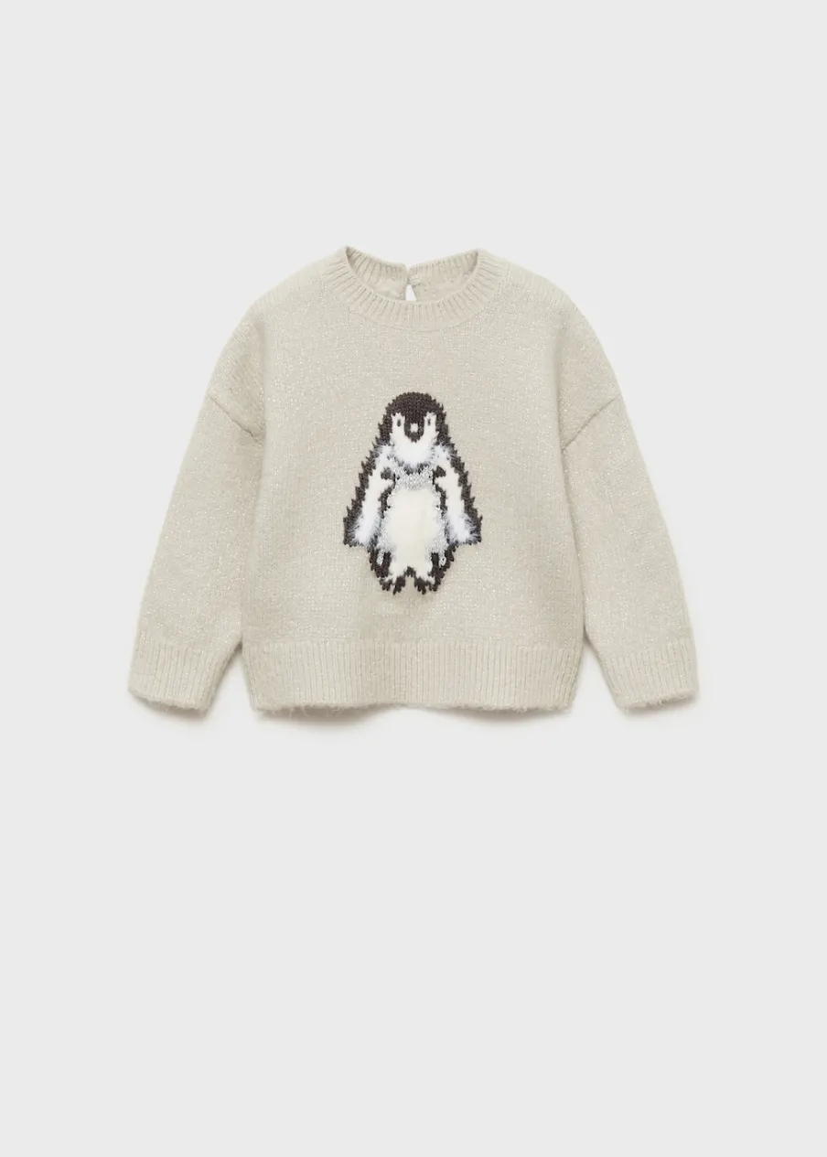 Dzianinowa tkanina. Model prosty. Wyhaftowany pingwin. Okrągły dekolt. Długi rękaw. Bez zapięcia. Kolekcja Bożonarodzeniowa.