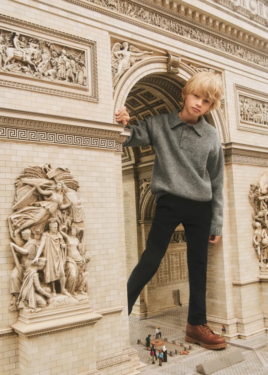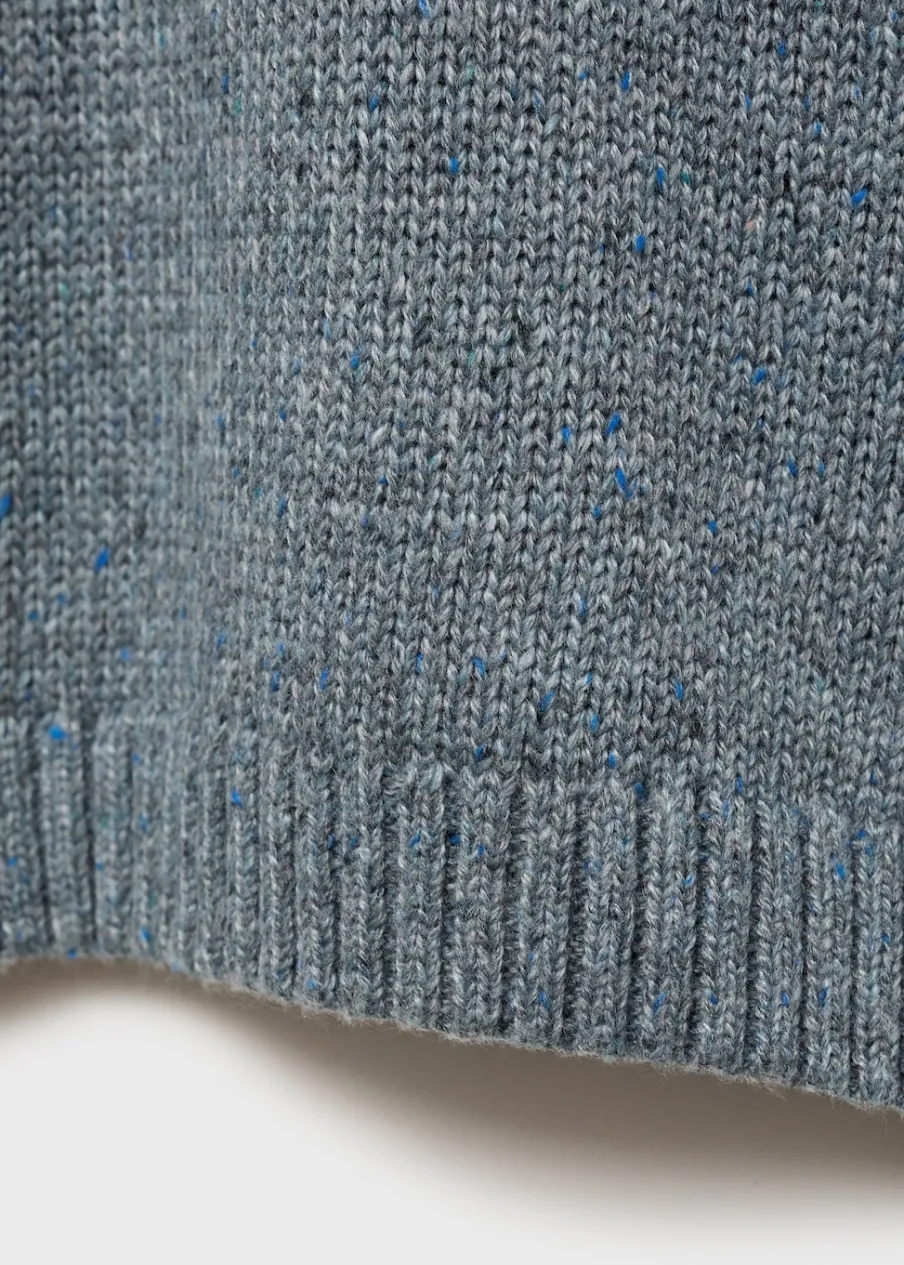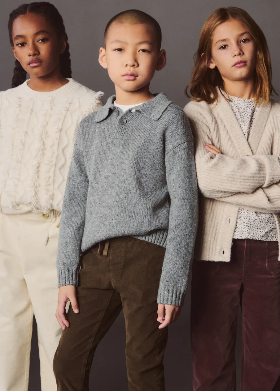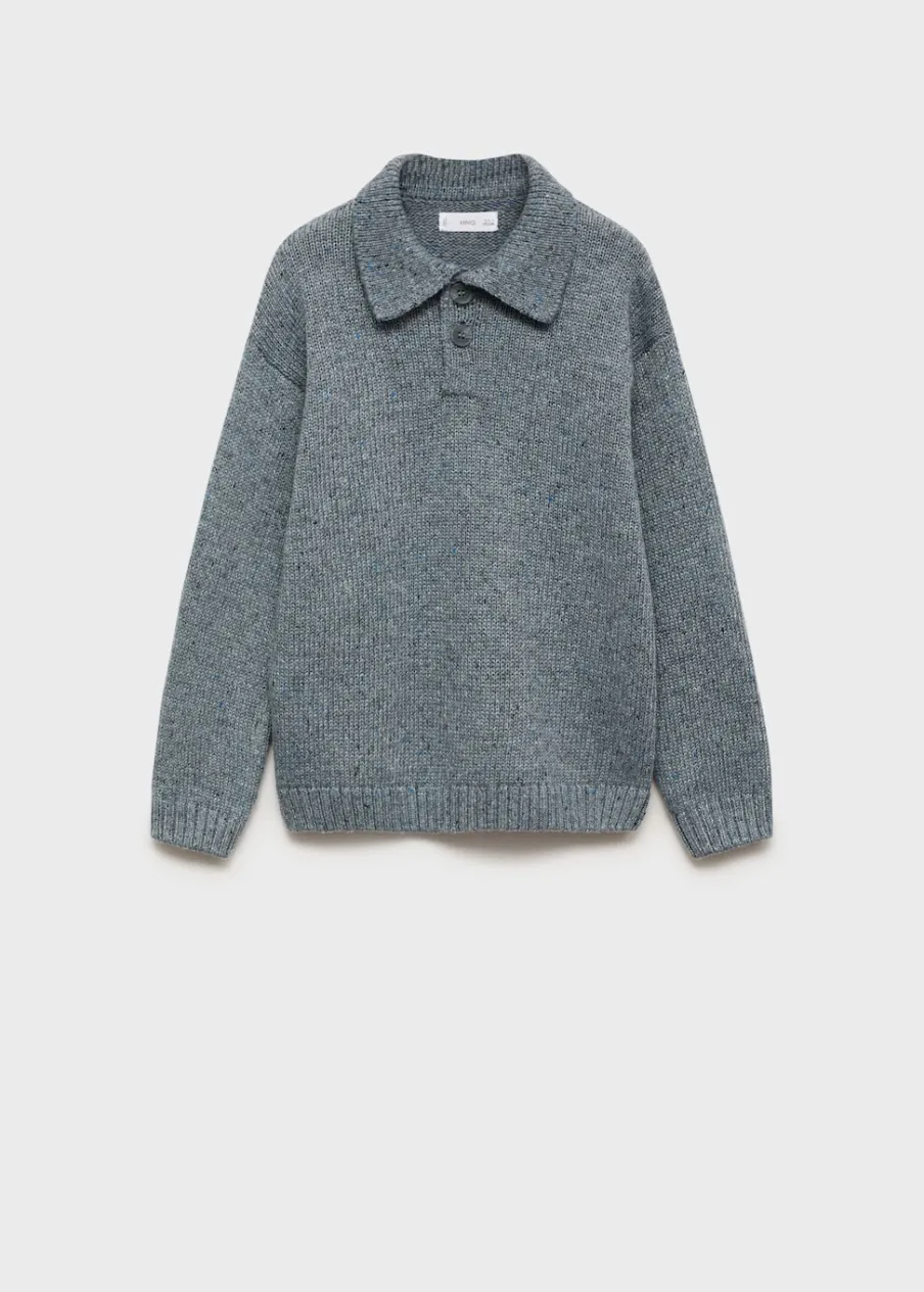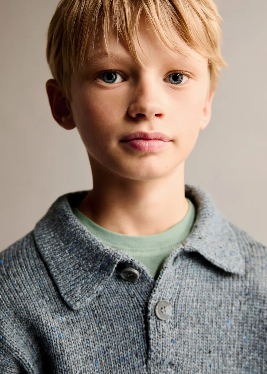 OpisTkanina z grubej dzianiny. Model prosty. Kołnierzyk polo. Długi rękaw. Zapięcie na guziki.