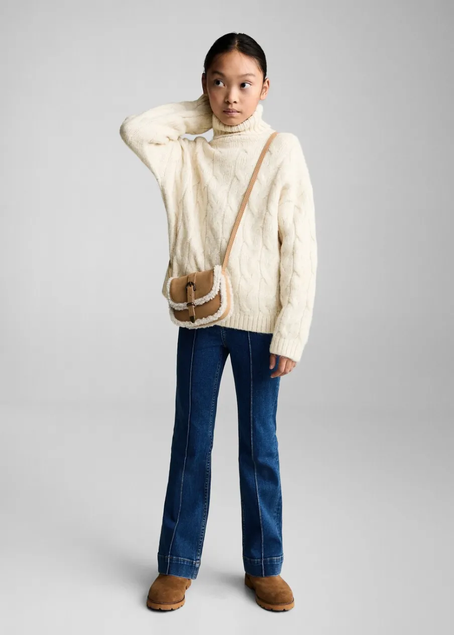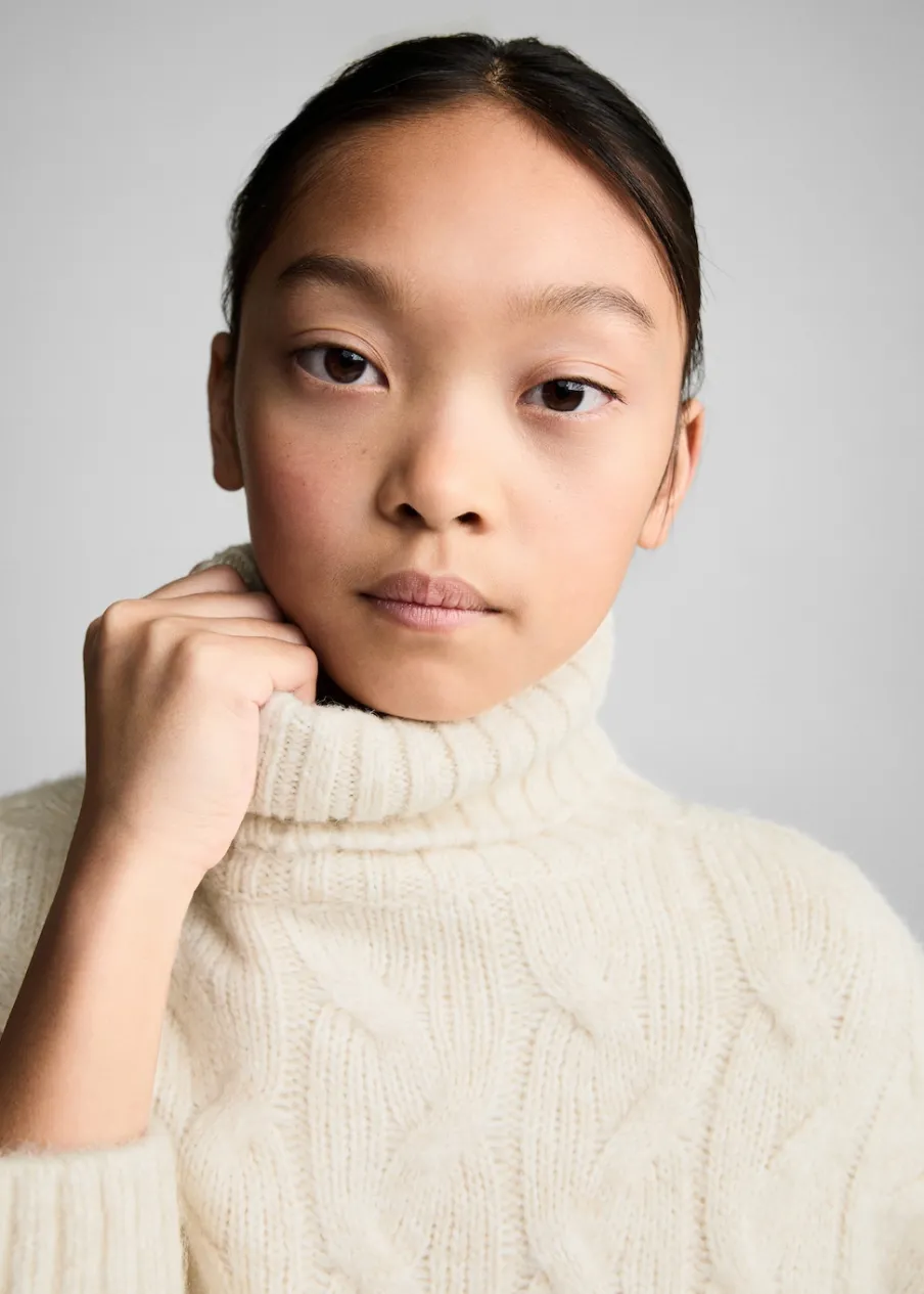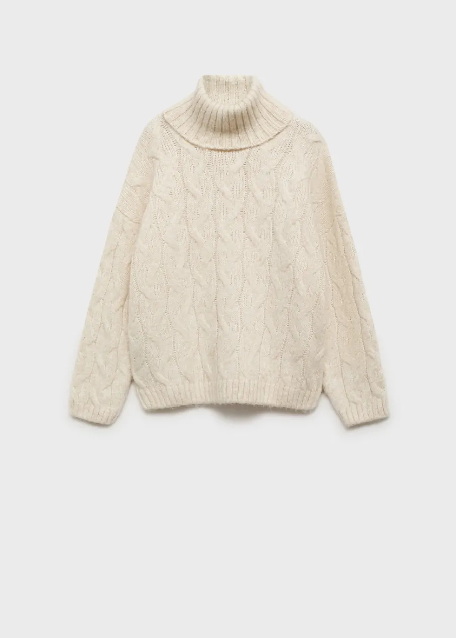 OpisTkanina z grubej dzianiny. Model prosty. Model pleciony. Długi rękaw. Wywinięty kołnierz.
