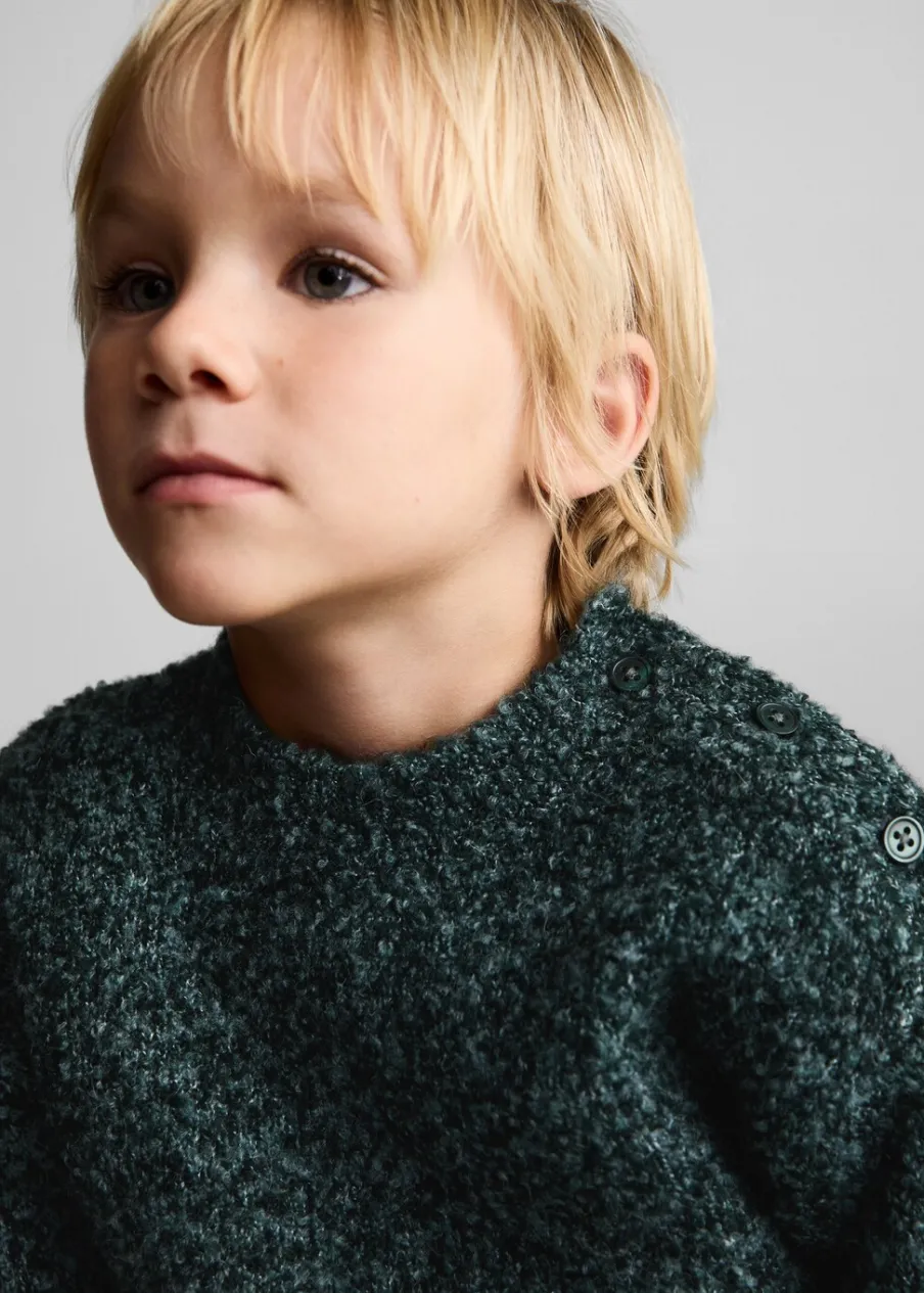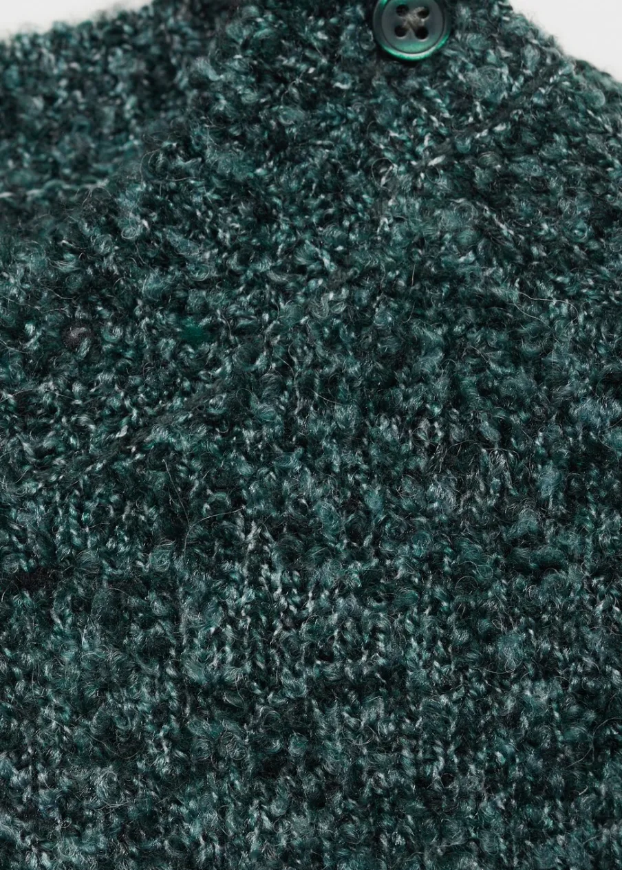 Tkanina z wełną. Dzianinowa tkanina. Model prosty. Okrągły dekolt. Długi rękaw. Zapięcie na guziki na ramionach.