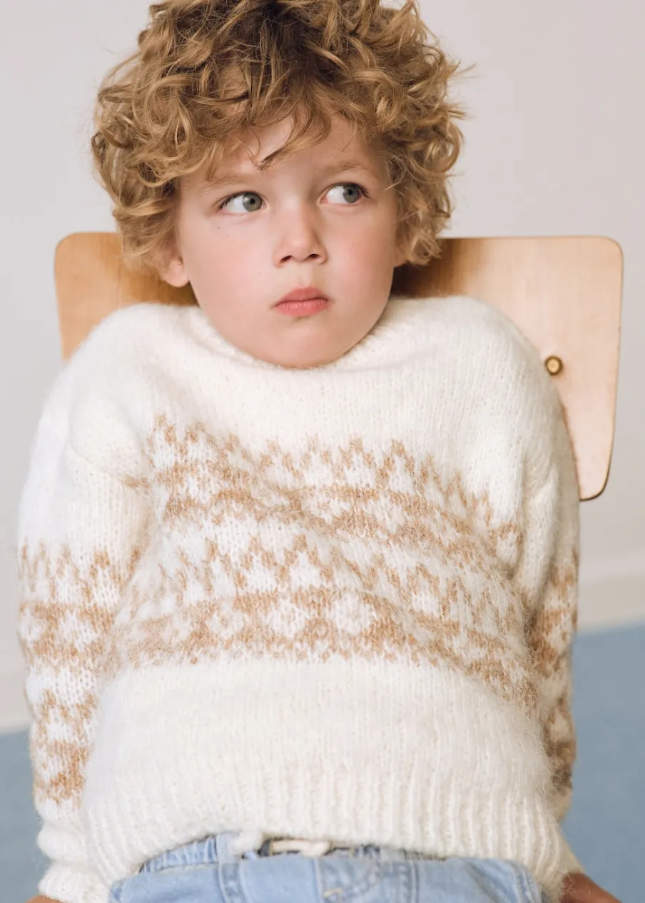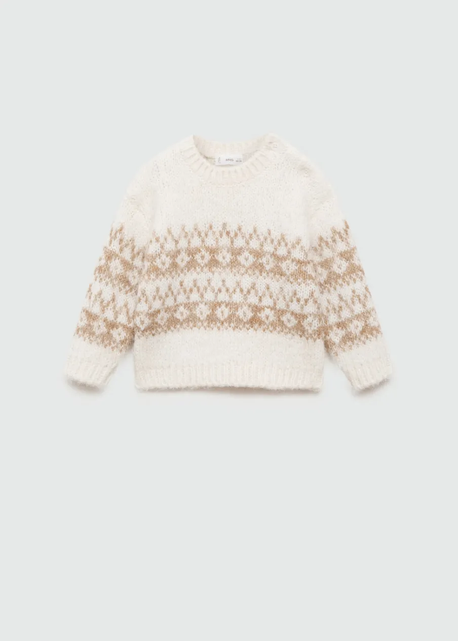 Powrót do szkoły. Model prosty. Zapięcie na boczne guziki. Długi rękaw. Żakardowy wzór. Okrągły dekolt.