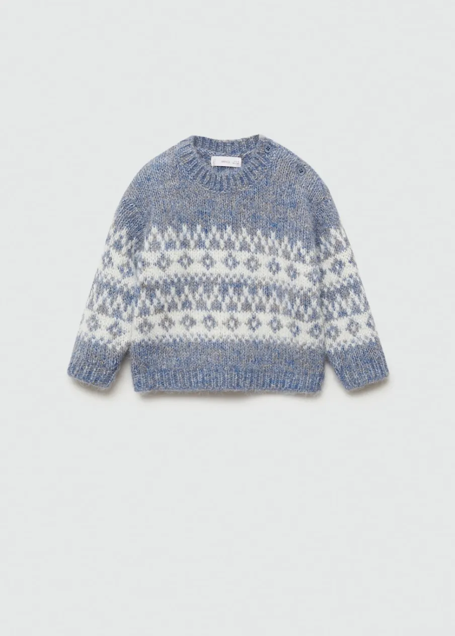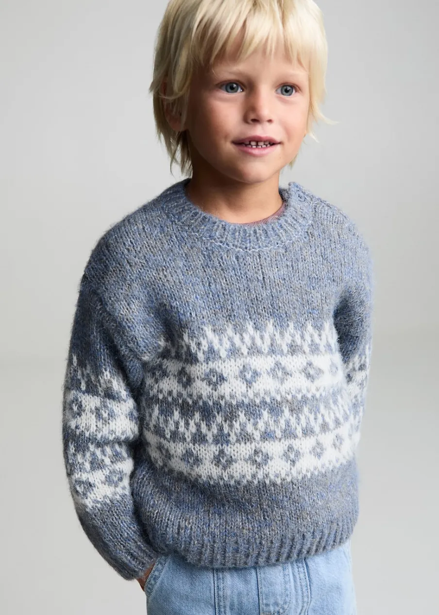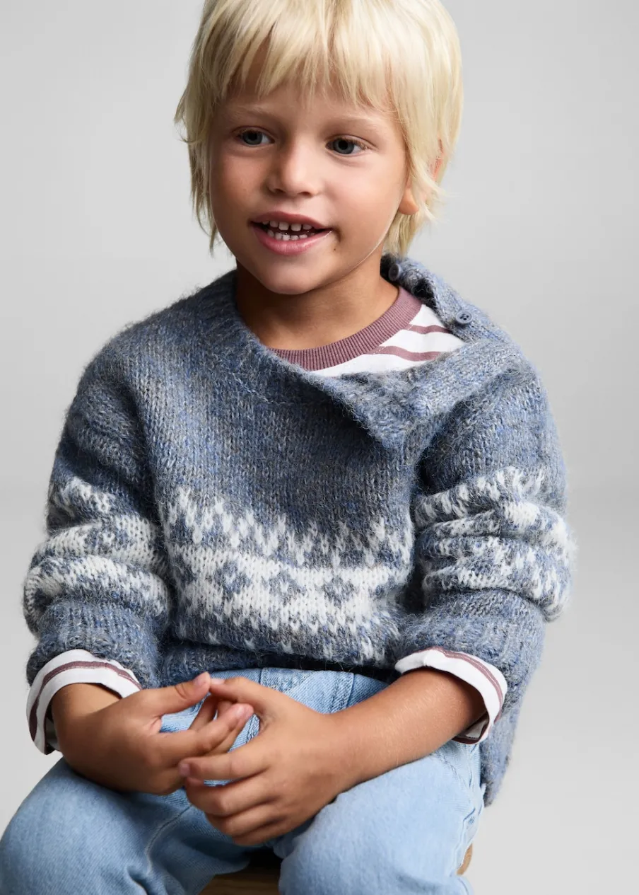 Powrót do szkoły. Model prosty. Żakardowy wzór. Okrągły dekolt. Długi rękaw. Zapięcie na boczne guziki.