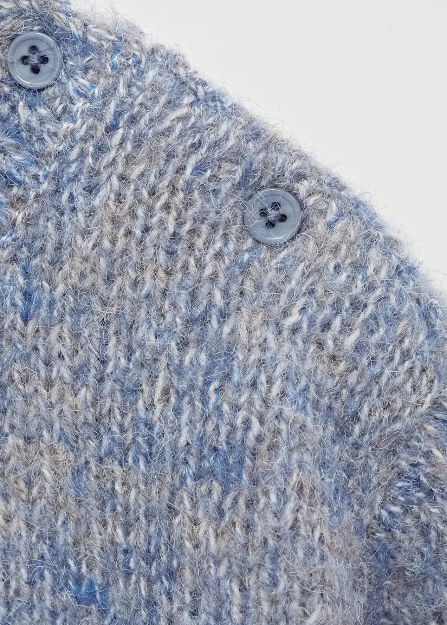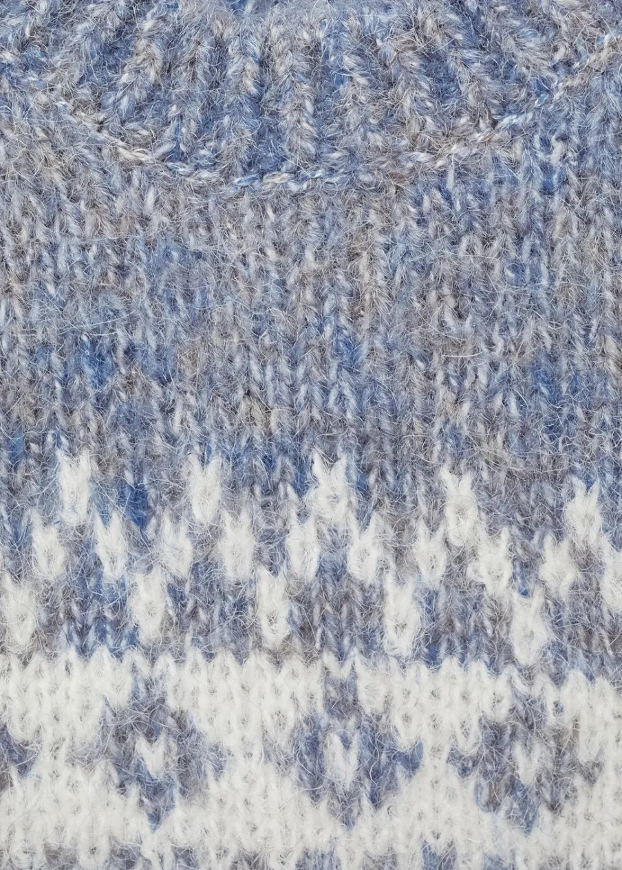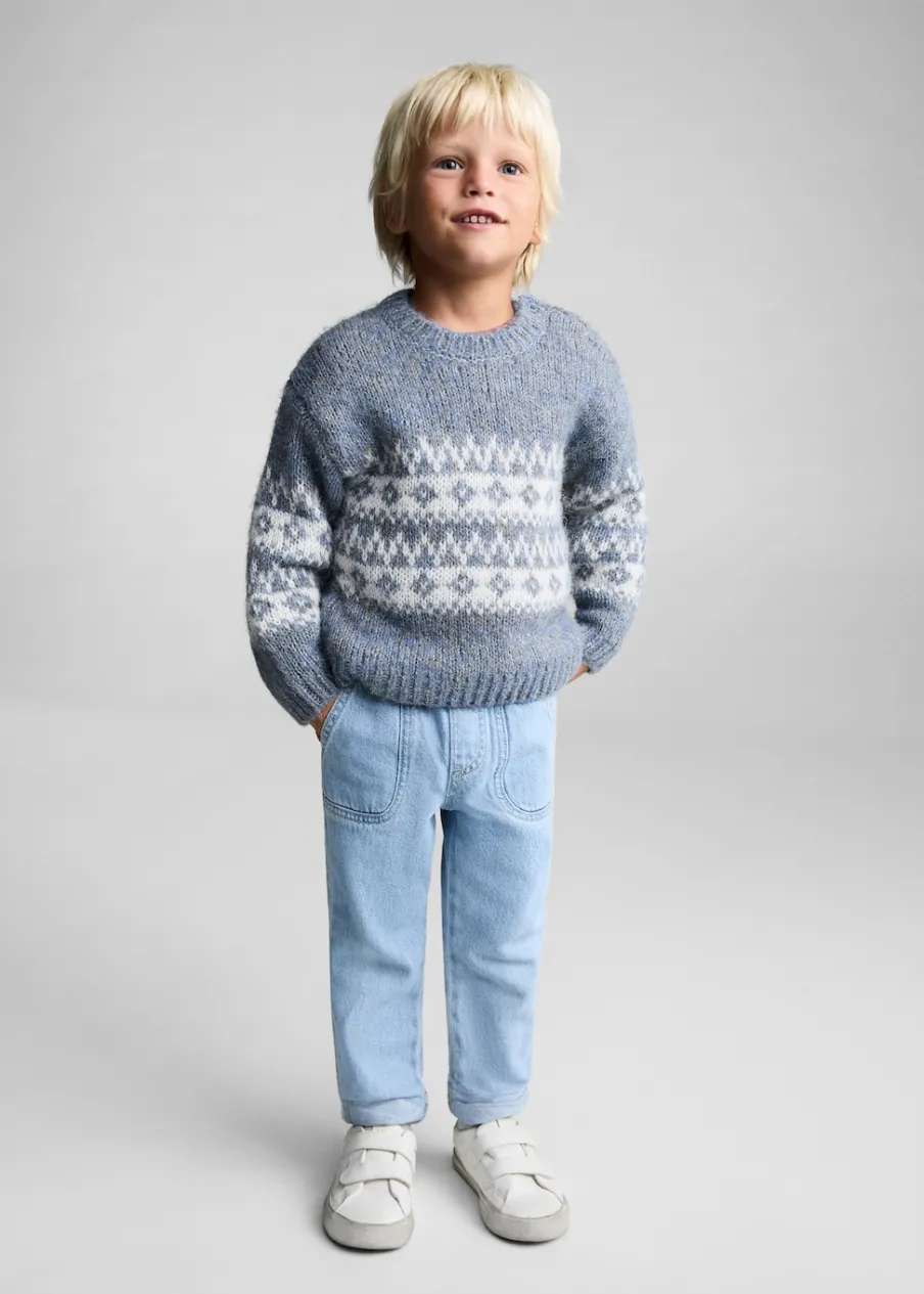 Powrót do szkoły. Model prosty. Żakardowy wzór. Okrągły dekolt. Długi rękaw. Zapięcie na boczne guziki.