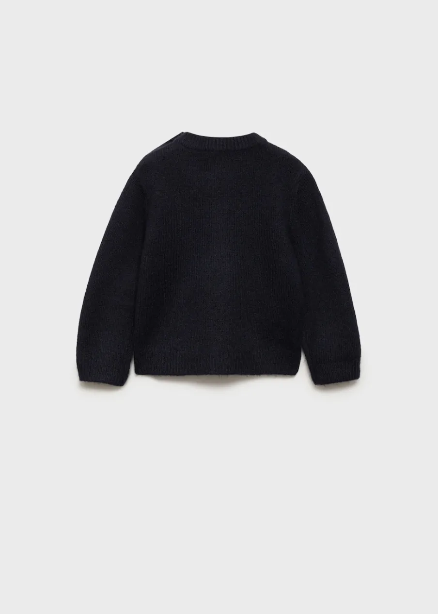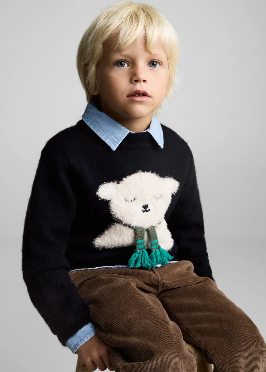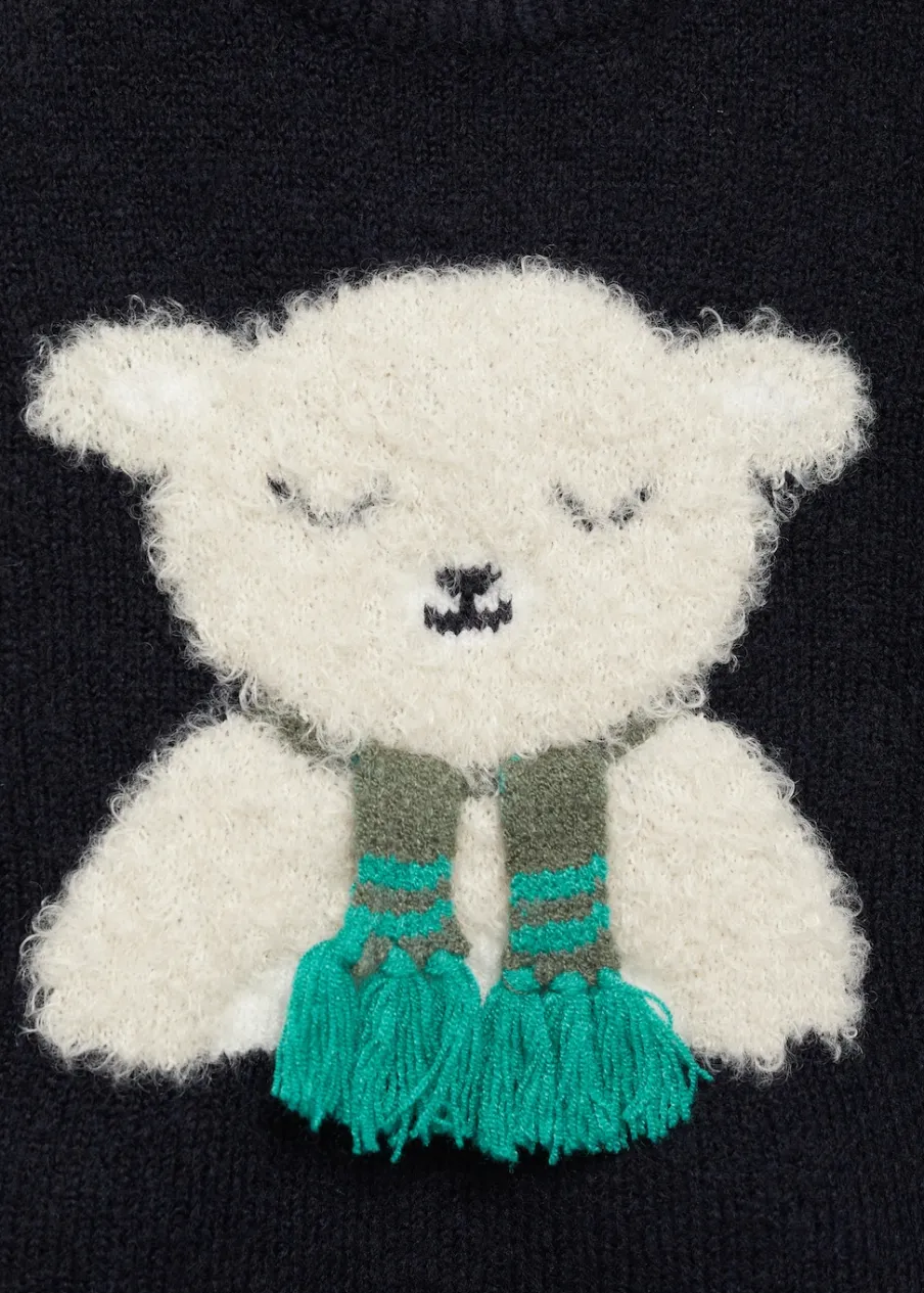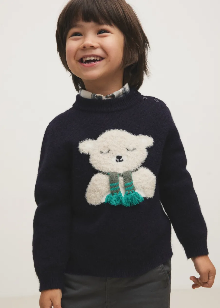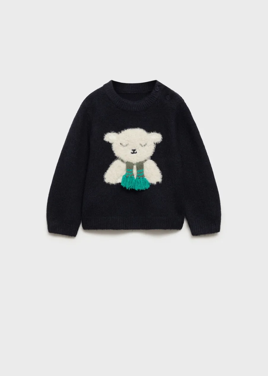 Dzianinowa tkanina. Model prosty. W kształcie misia. Okrągły dekolt. Długi rękaw. Zapięcie na ramieniu. Zapięcie na guziki na ramionach. Kolekcja Bożonarodzeniowa.