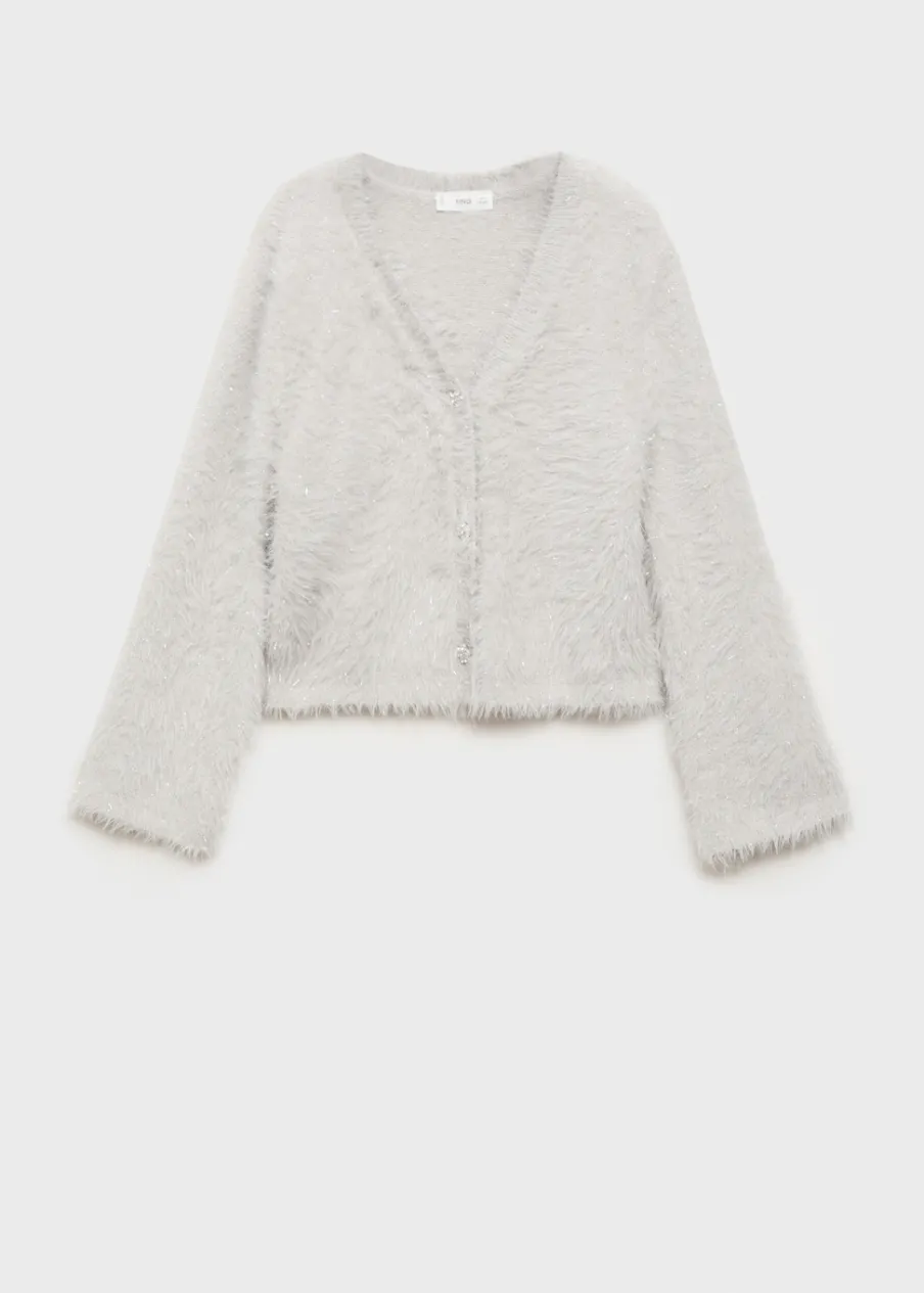Długi rękaw. Model prosty. Dekolt V. Włochata tekstura. Biżuteryjne guziki. Kolekcja wieczorowa i imprezowa.