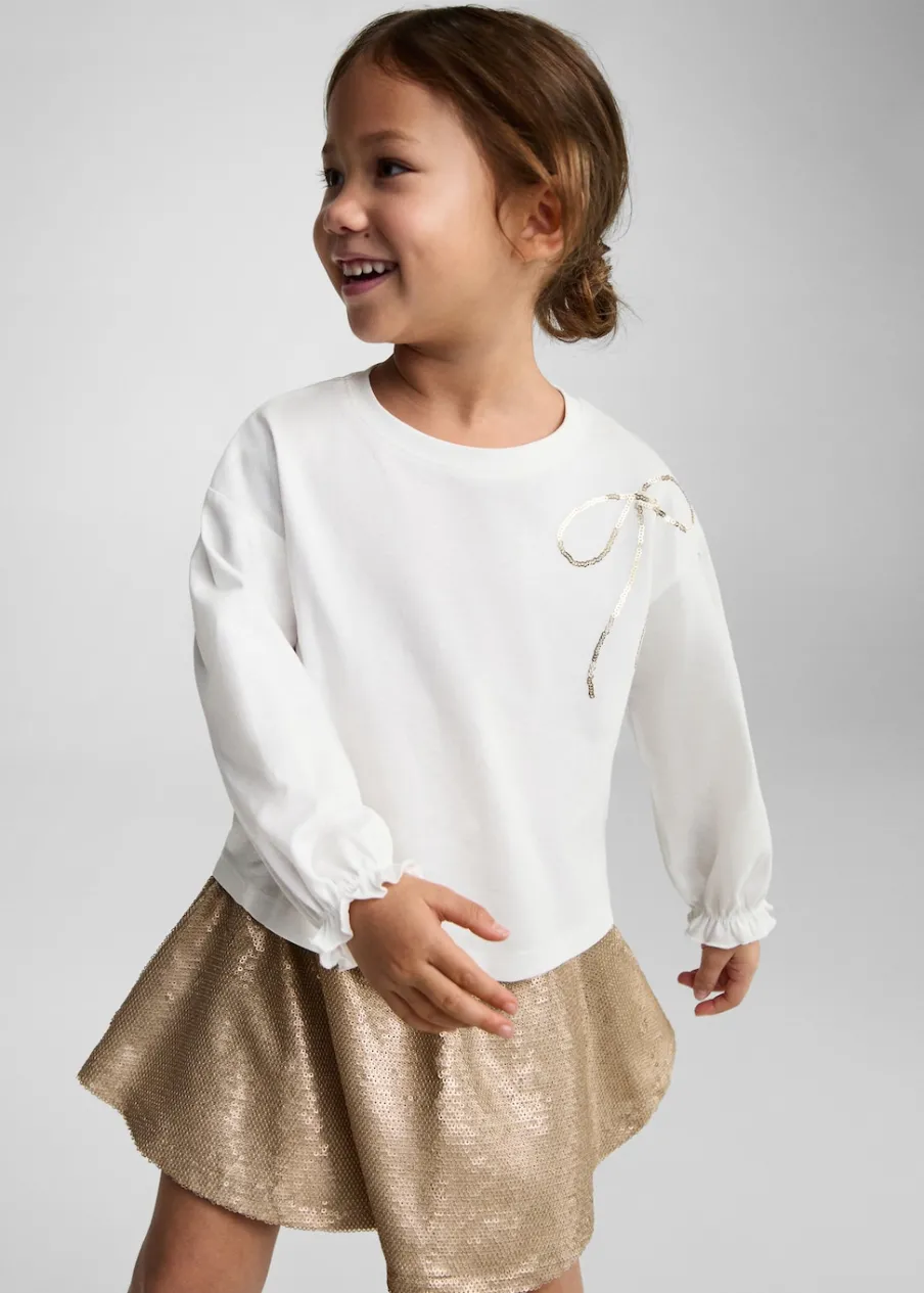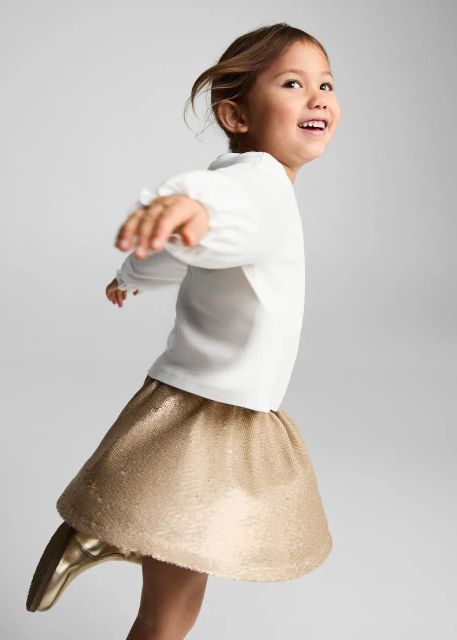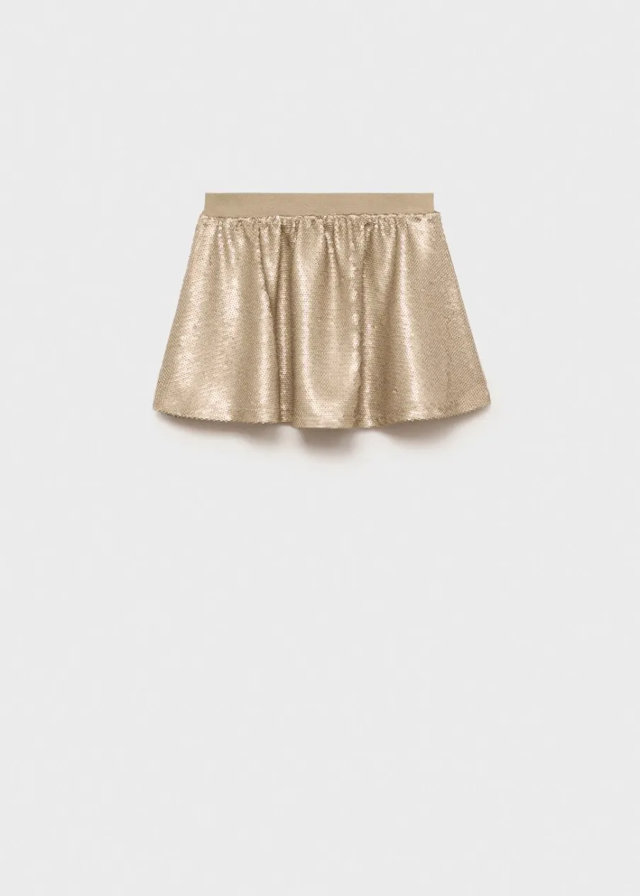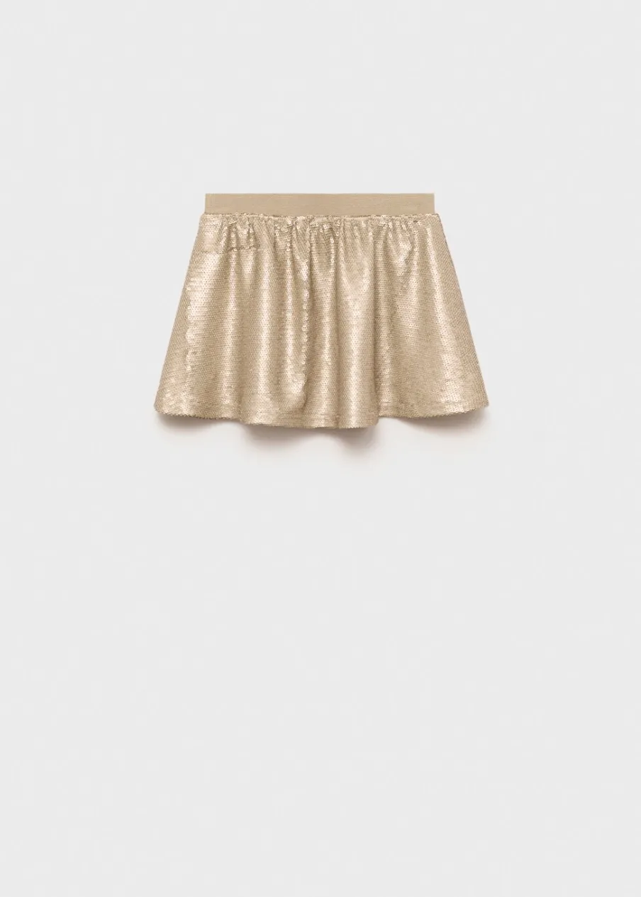 Cekinowa ozdoba. Model z falbankami. Krótki krój. Elastyczny pas. Bez zapięcia.