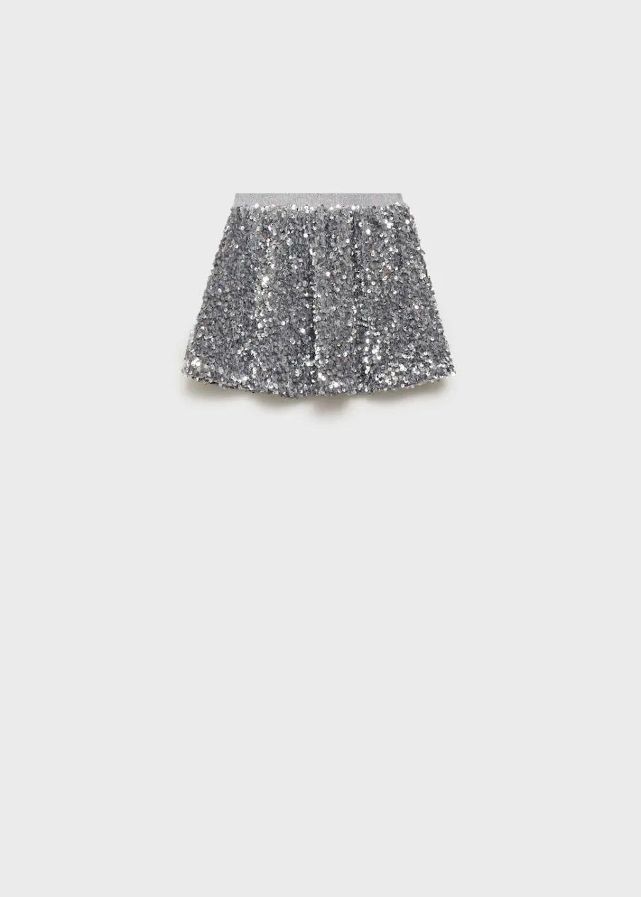 Cekinowa ozdoba. Krótki krój. Elastyczna gumka. Wewnętrzna podszewka. Elastyczny pas. Model evasé. Bez zapięcia.