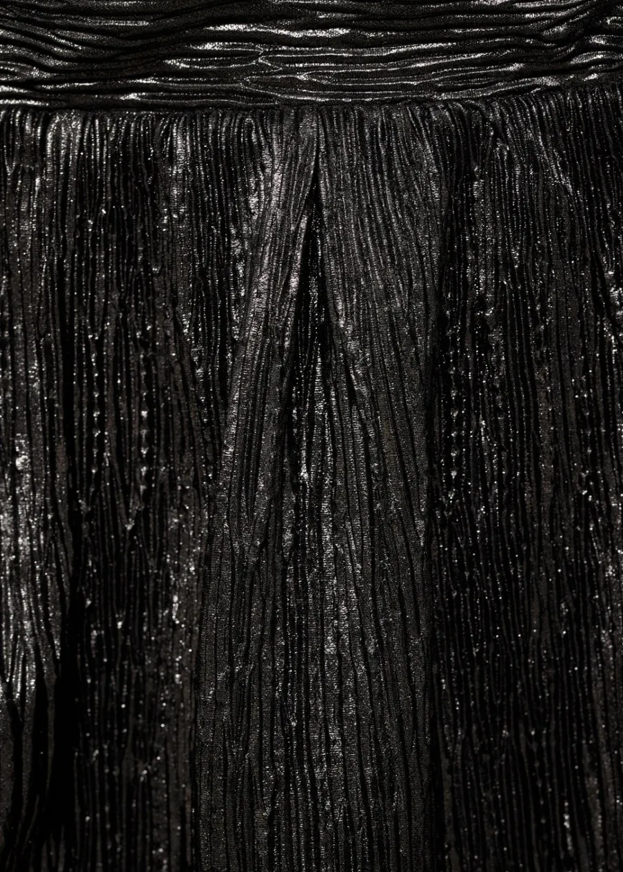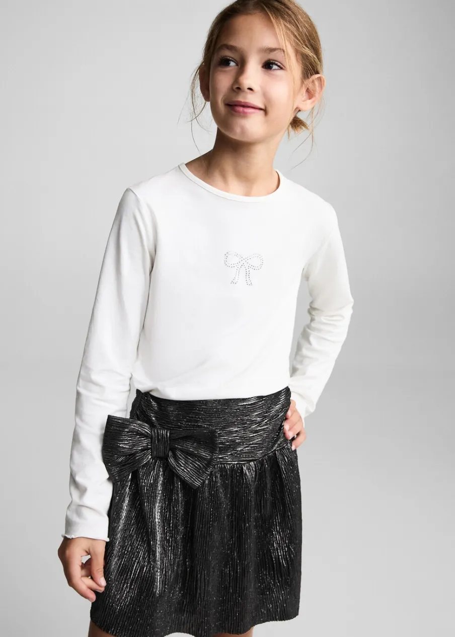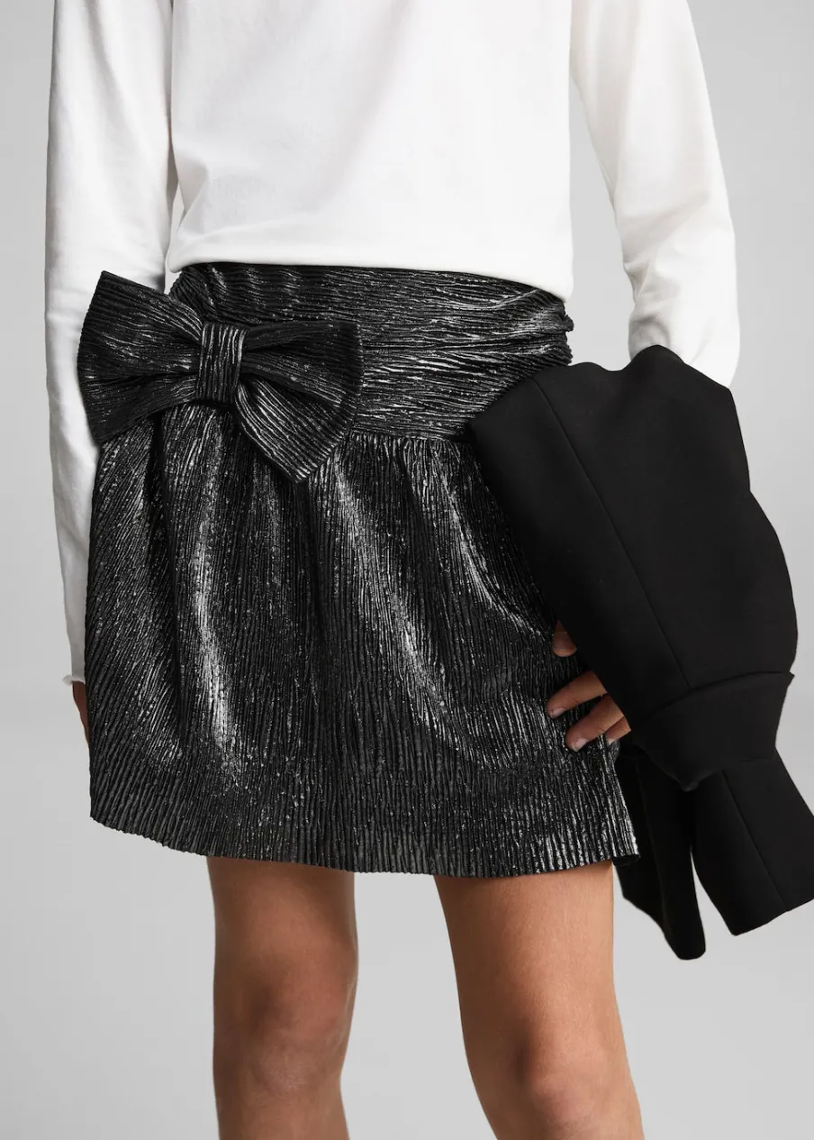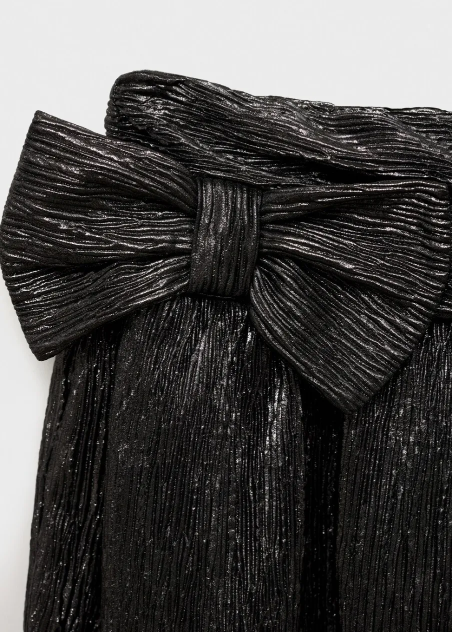 Teksturowana tkanina. Metaliczna tkanina. Krótki krój. Model prosty. Ozdobna kokardka. Bawełniana podszewka. Kolekcja wieczorowa i imprezowa. Kolekcja Bożonarodzeniowa.