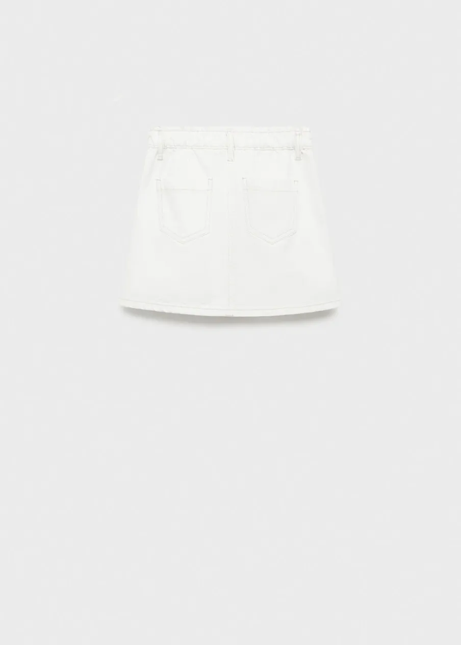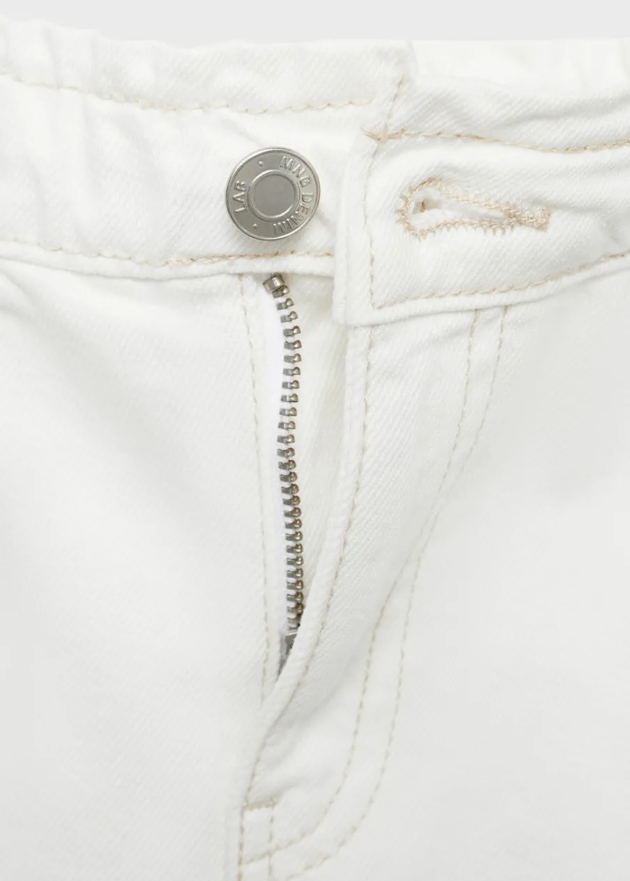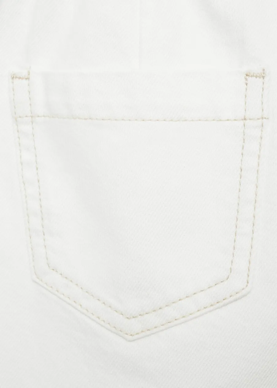 Tkanina bawełniana w dżinsowym stylu. Krótki krój. Elastyczny pas. Szlufki. Dwie kieszenie z przodu. Dwie kieszenie nakładane z tyłu. Zapięcie na suwak i guzik.