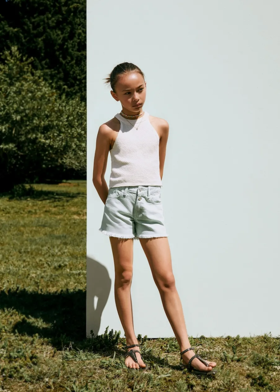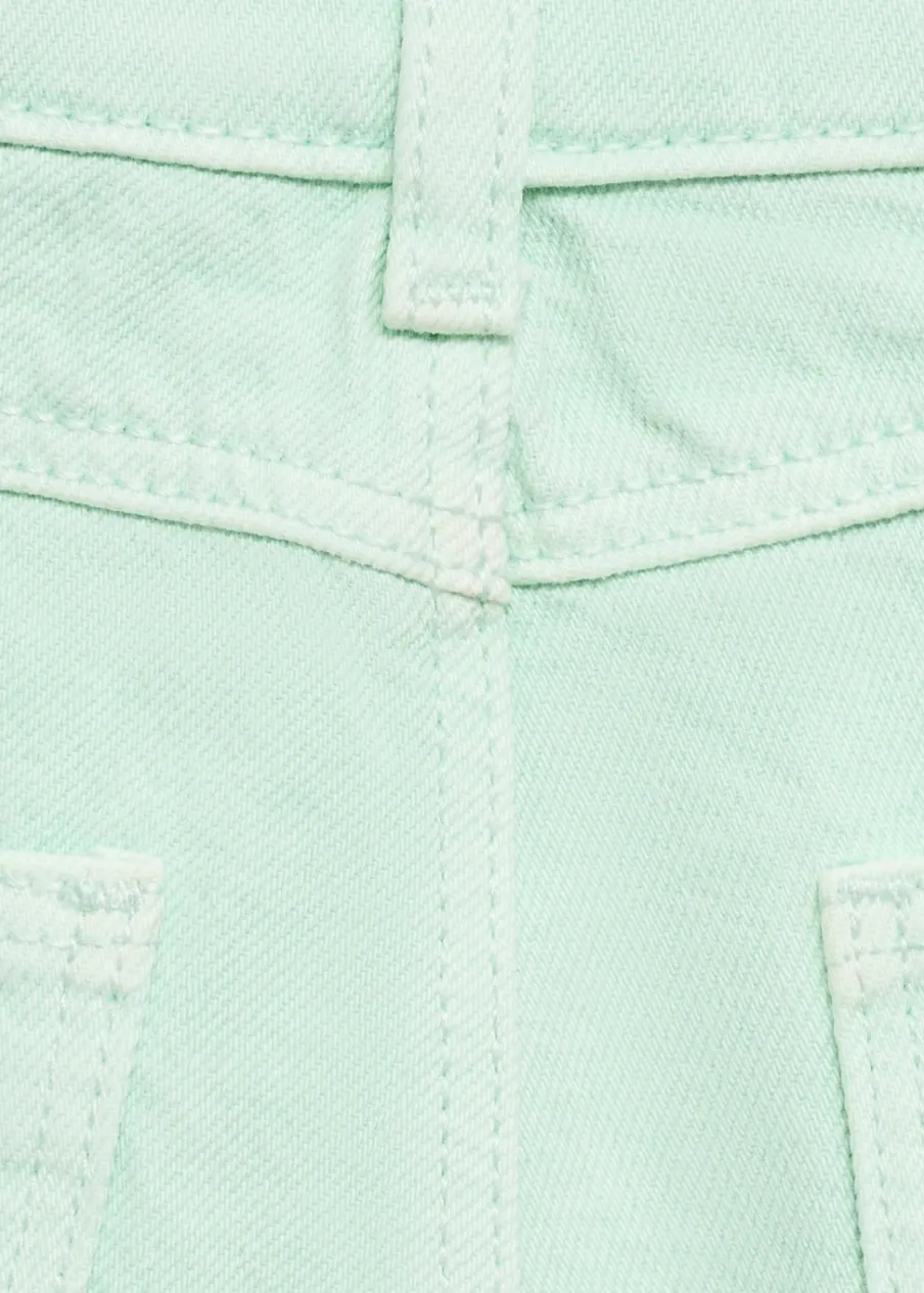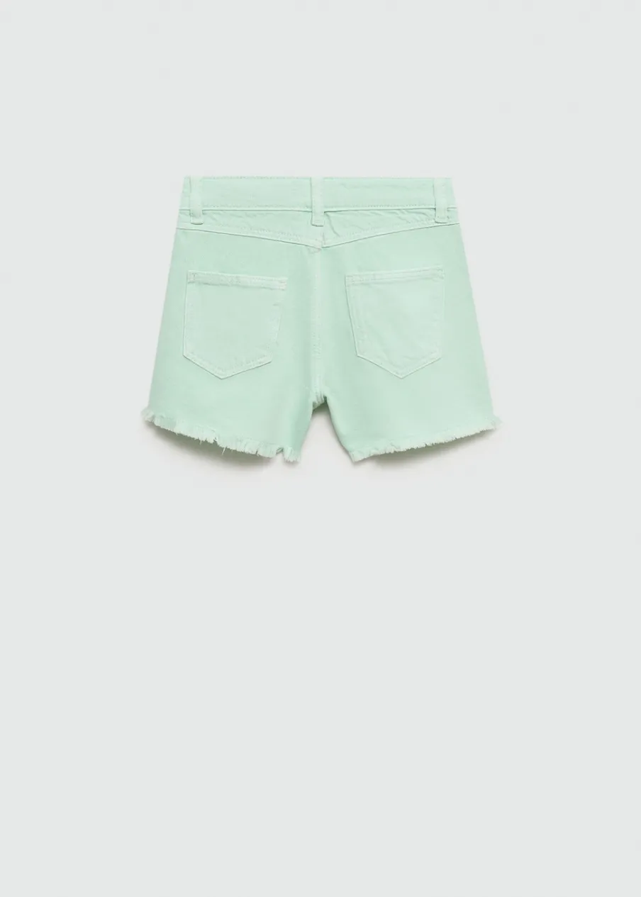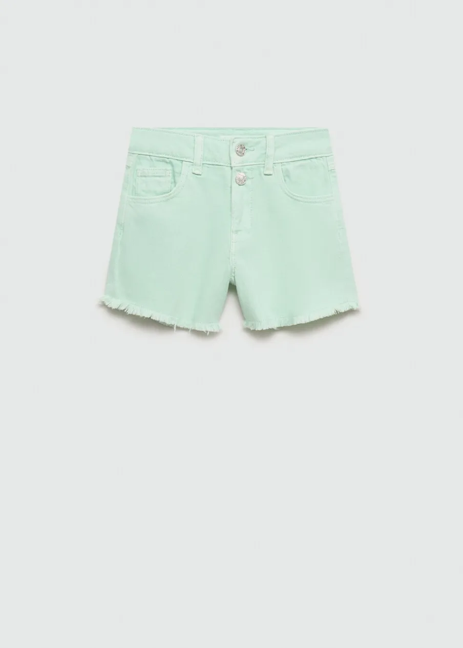 100% bomull. Tkanina bawełniana w dżinsowym stylu. Krótki krój. Model prosty. Postrzępione nogawki. Pięć kieszeni. Zapięcie na suwak i guziki.