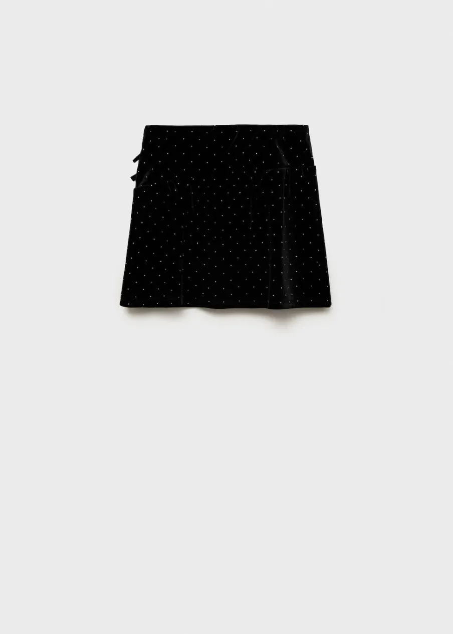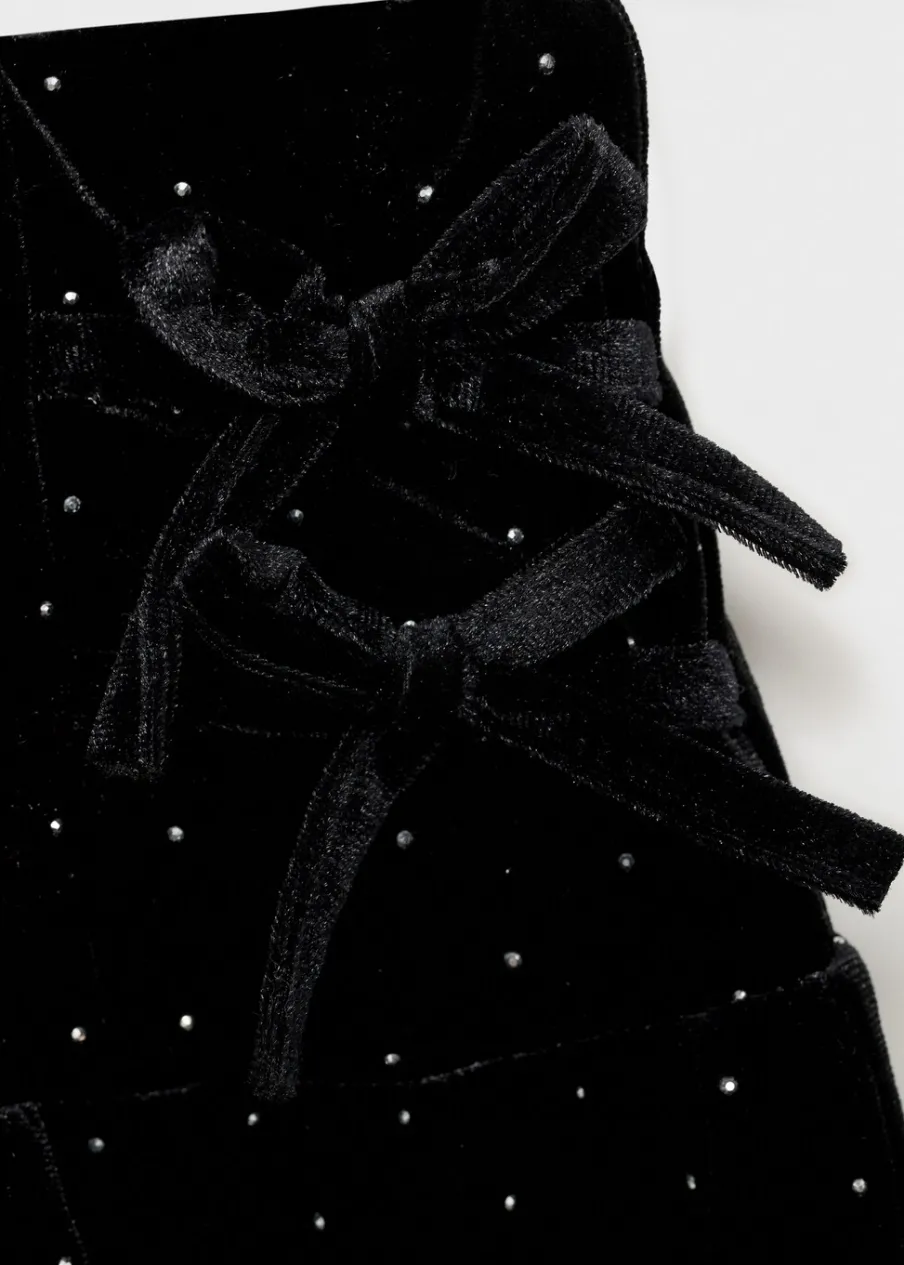 Aksamitna tkanina. Krótki krój. Ozdoba z kryształków strass. Ozdobna kokardka. Zapięcie na suwak. Kolekcja wieczorowa i imprezowa. Kolekcja Bożonarodzeniowa.
