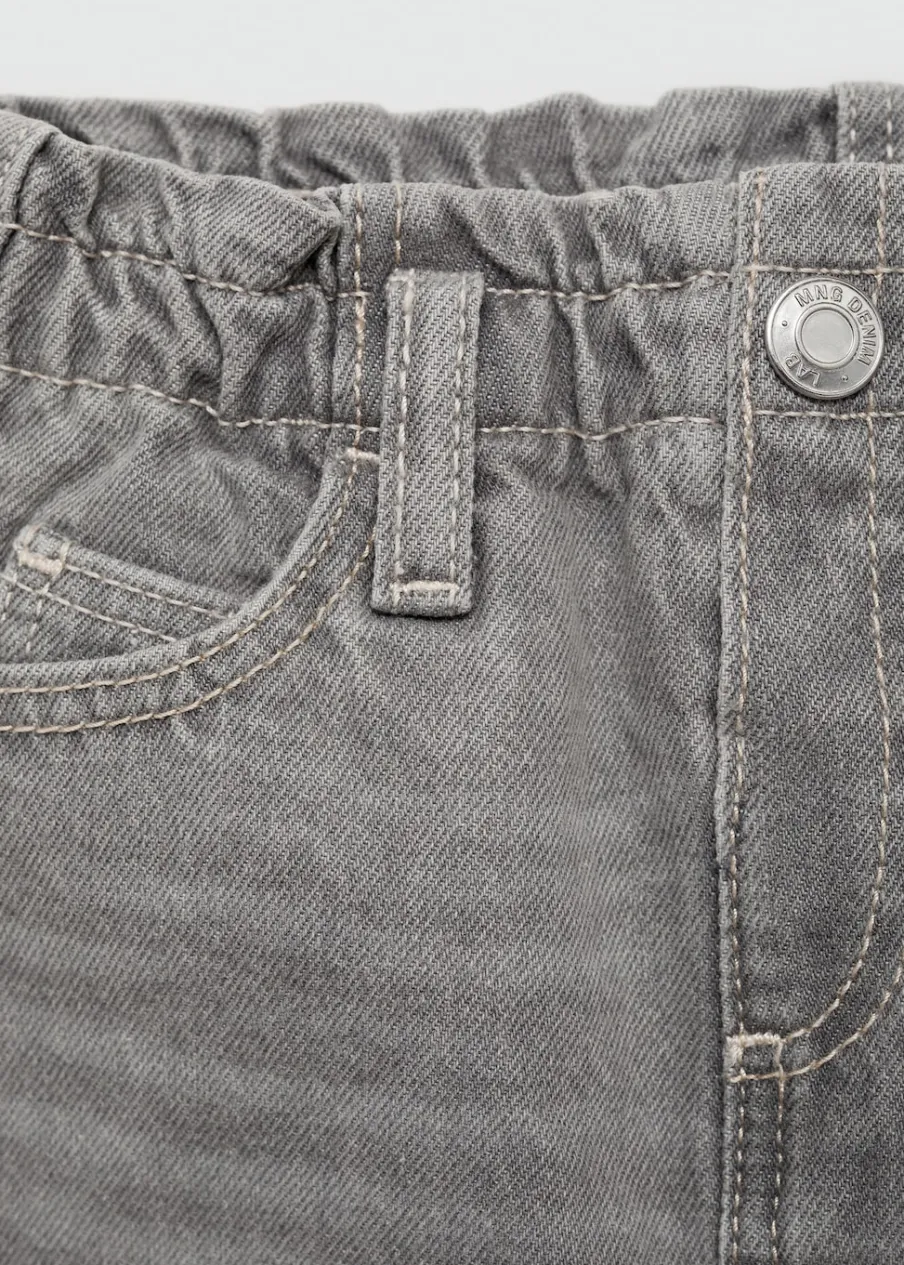 Tkanina bawełniana w dżinsowym stylu. Model prosty. Krótki krój. Elastyczny pas. Elastyczna talia typu paperbag. Pięć kieszeni. Zapięcie na zatrzaskowy guzik.