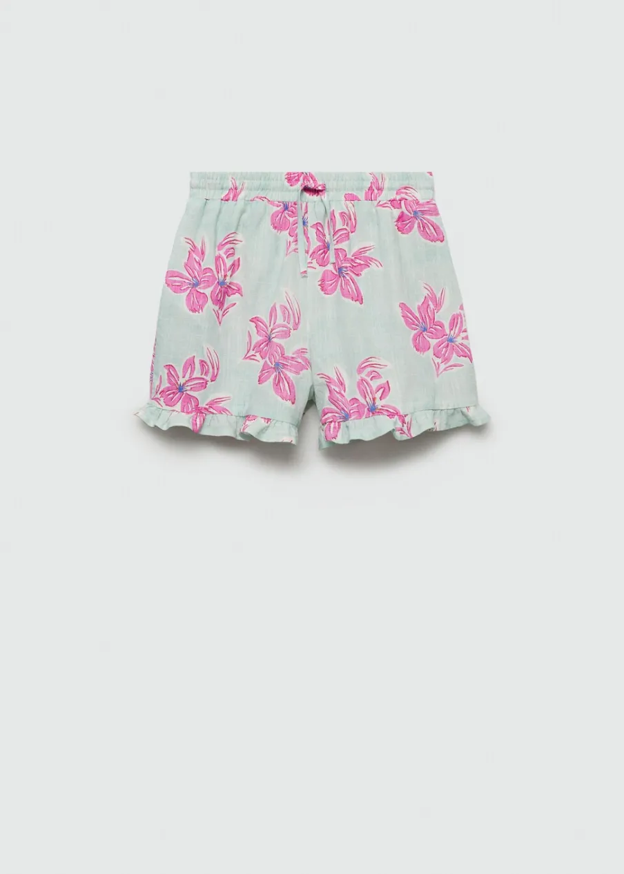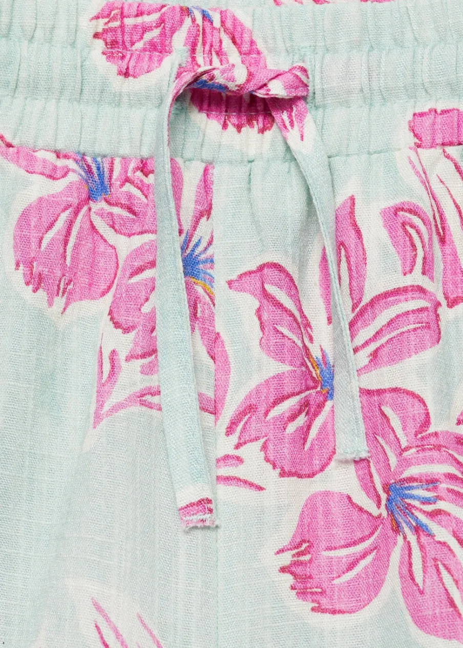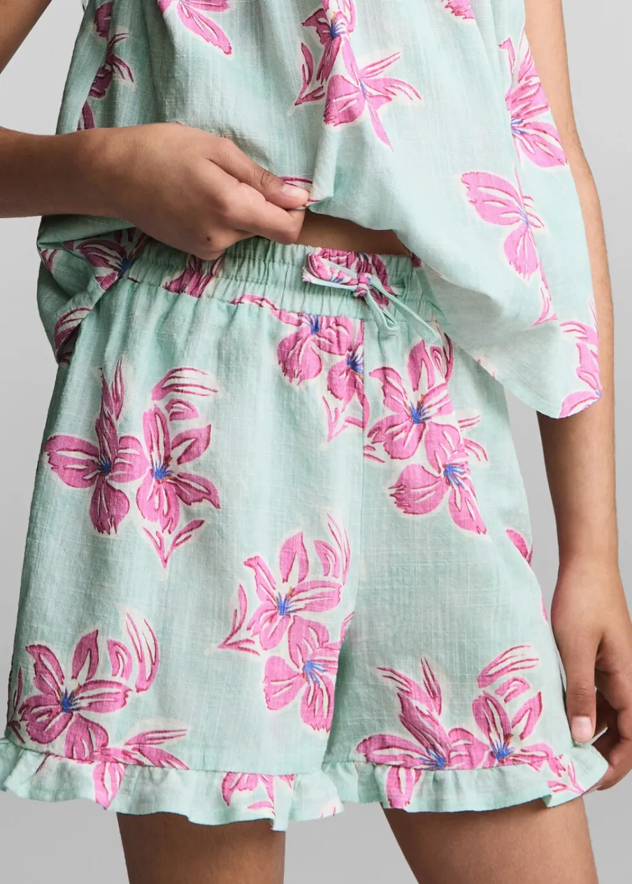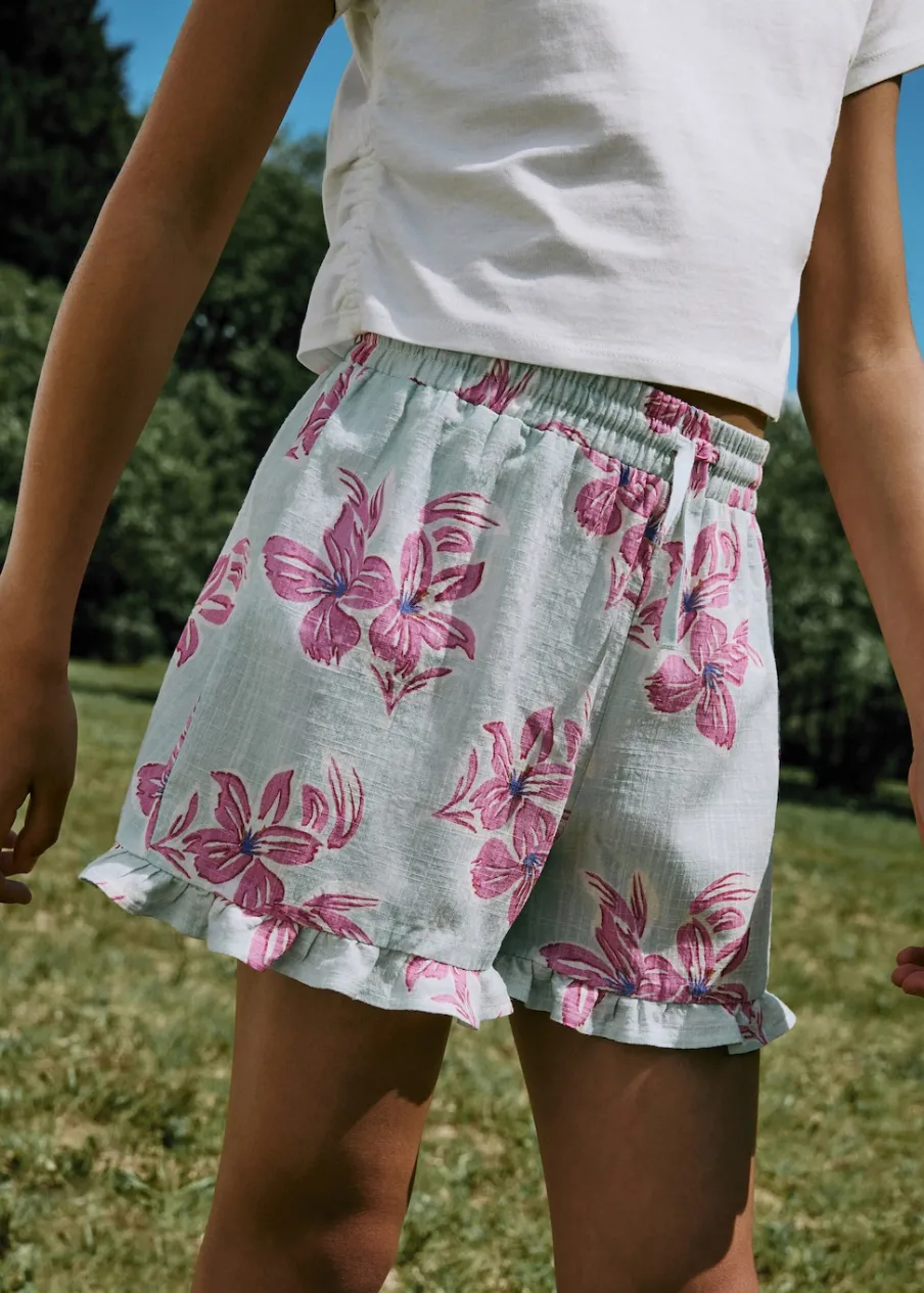 Tkanina bawełniana. Wzór w kwiaty. Model prosty. Krótki krój. Z falbanami. Elastyczny pas. Zapięcie ze sznurkiem do regulacji.