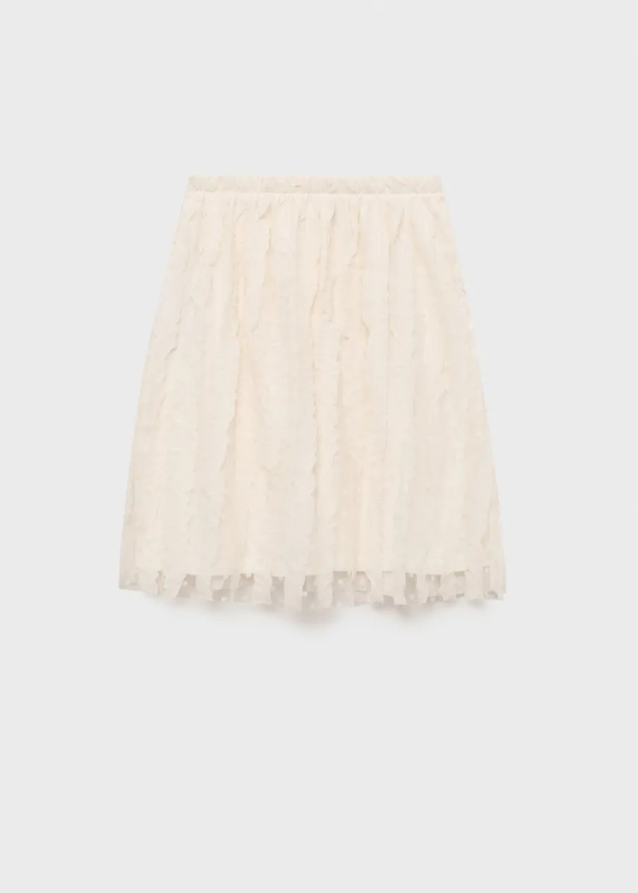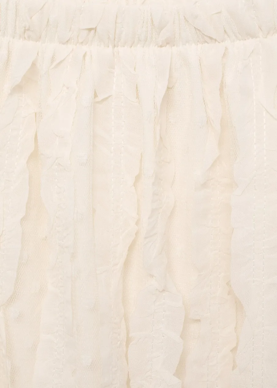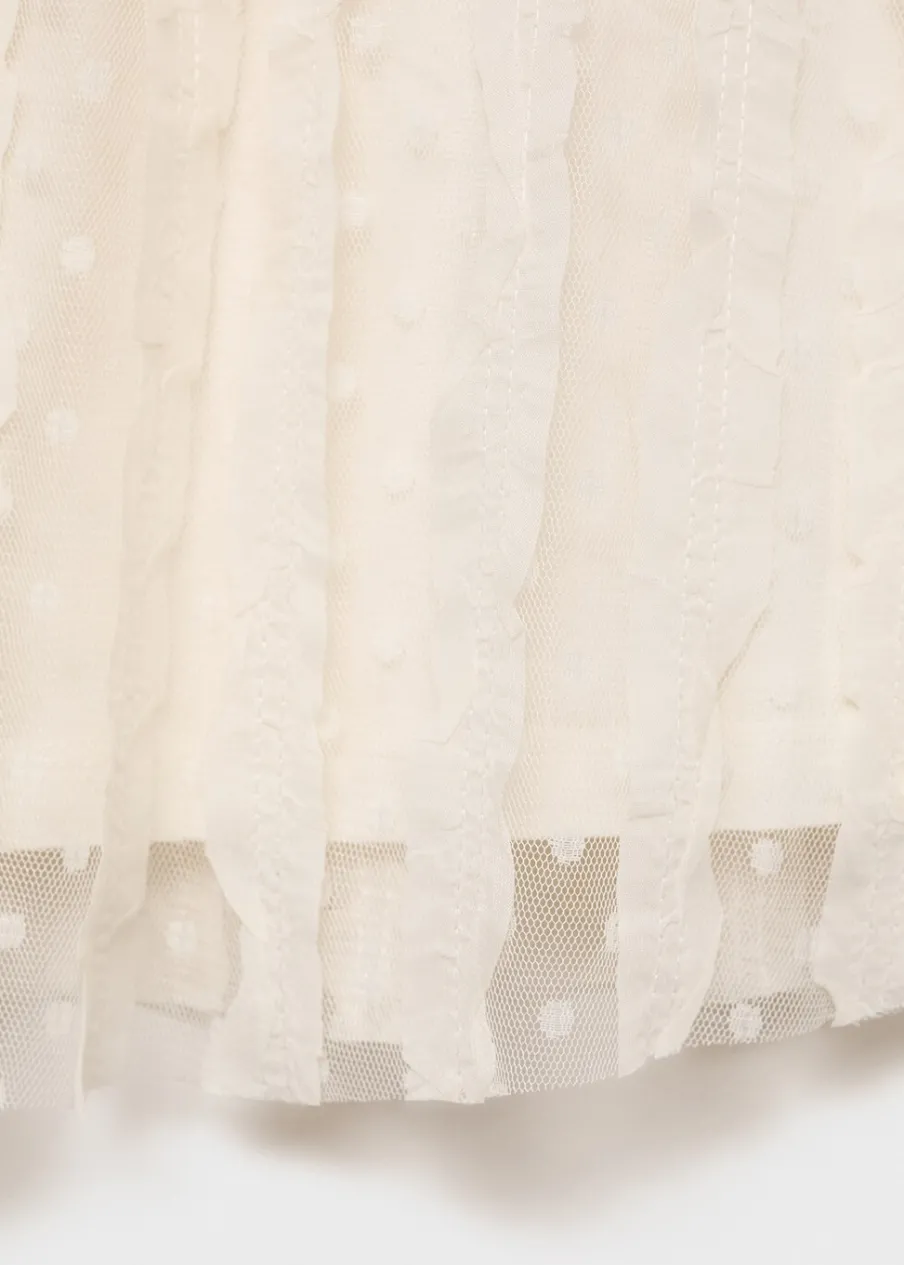 Tiulowa tkanina. Krótki krój. Marszczona tekstura. Haftowane grochy. Elastyczny pas. Kolekcja Ramadan.