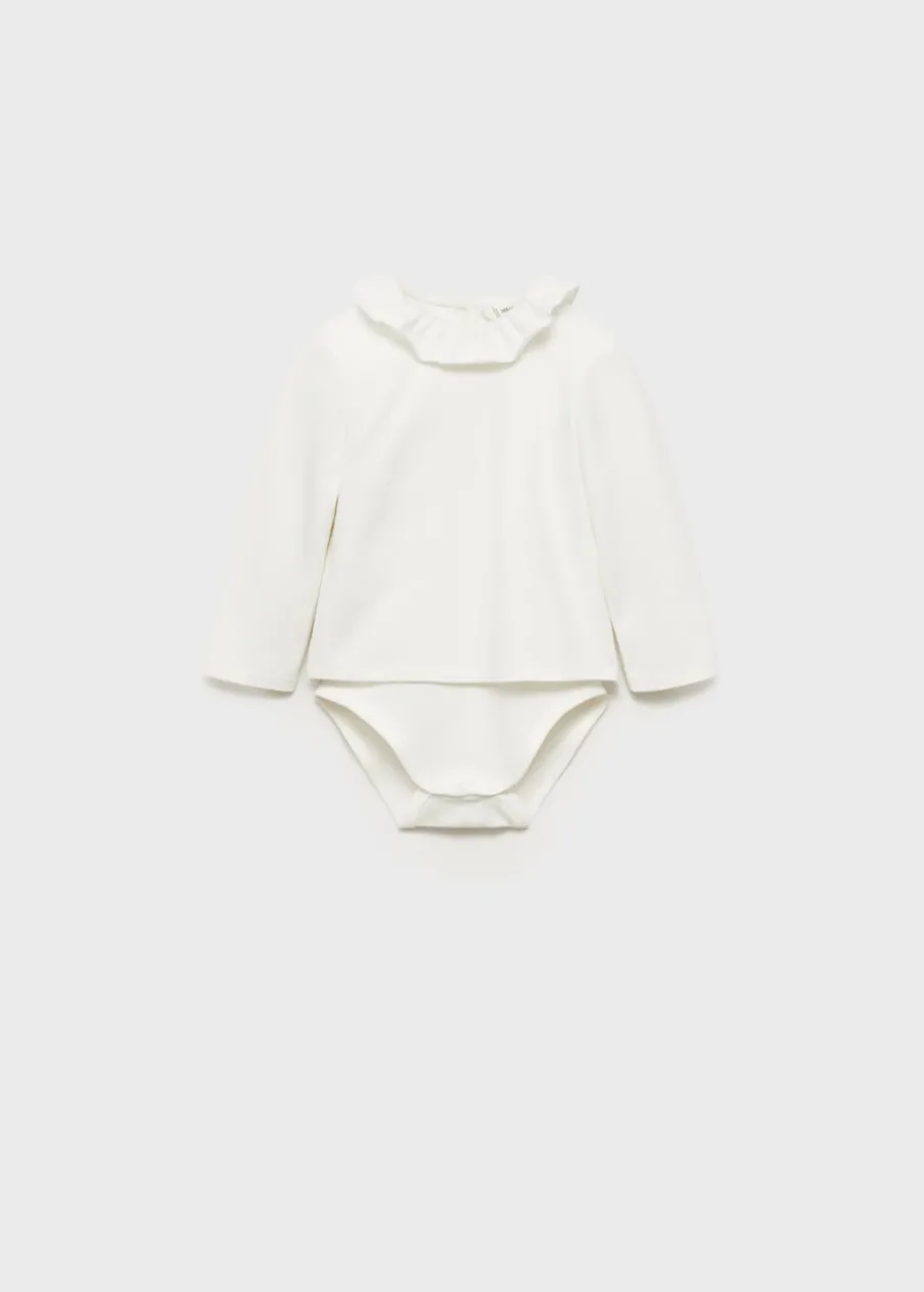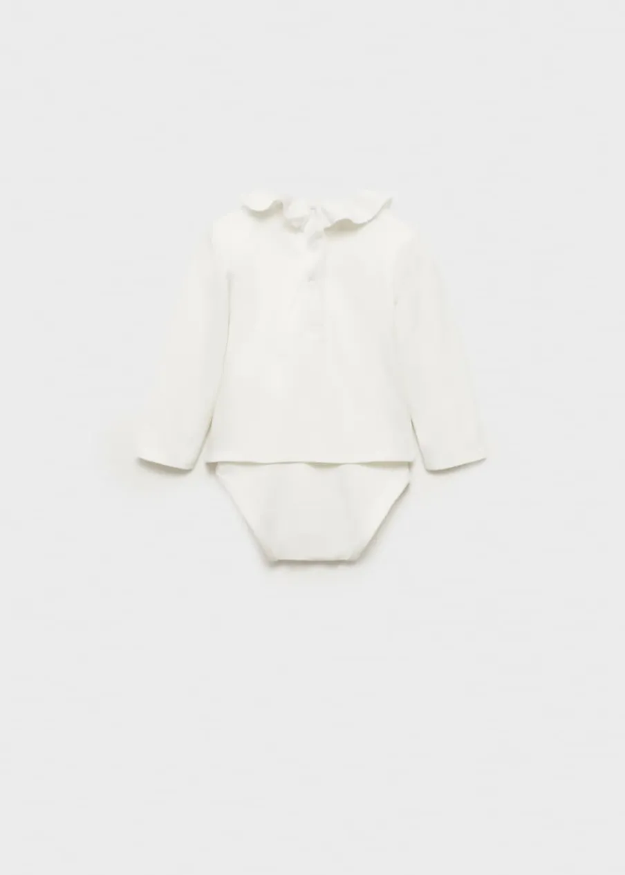 OpisTkanina z bawełną. Model prosty. Body z kołnierzykiem falbanką. Długi rękaw. Zapięcie na zatrzaskowe guziki. …
