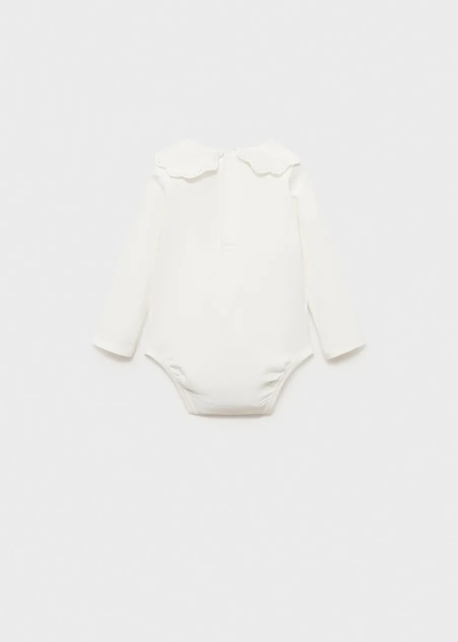 OpisTkanina z bawełną. Model prosty. Kołnierzyk bebe. Ozdobny haft na kołnierzyku. Długi rękaw. Zapięcie z tyłu …
