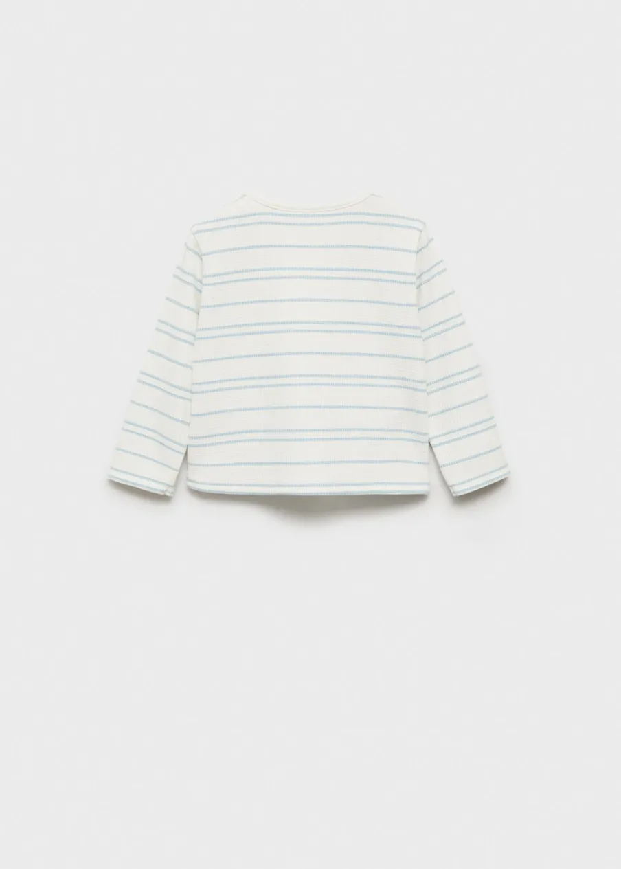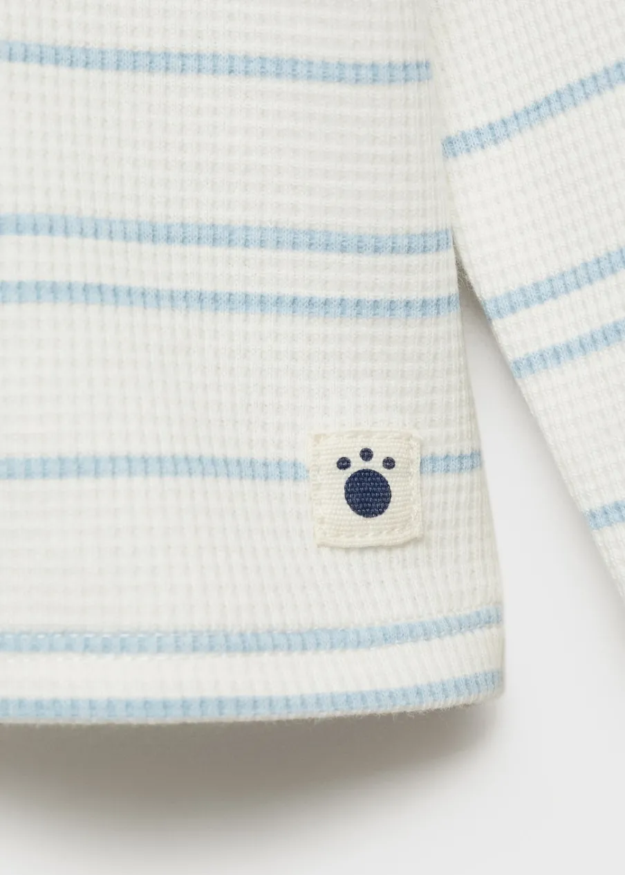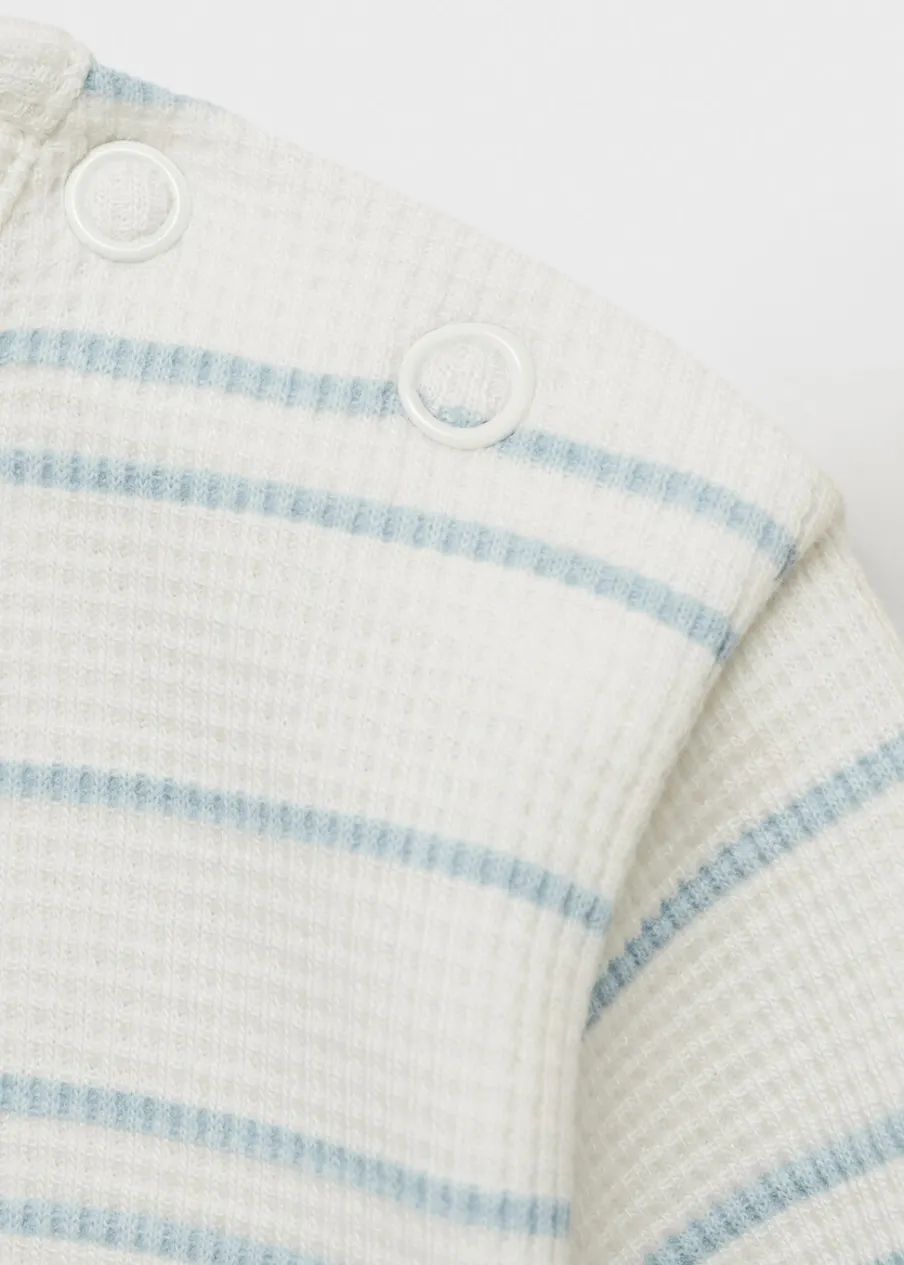 Tkanina z bawełną. Tkanina w paski. Gofrowa tekstura „waffle”. Model prosty. Długi rękaw. Okrągły dekolt. Zapięcie na guziki na ramieniu.
