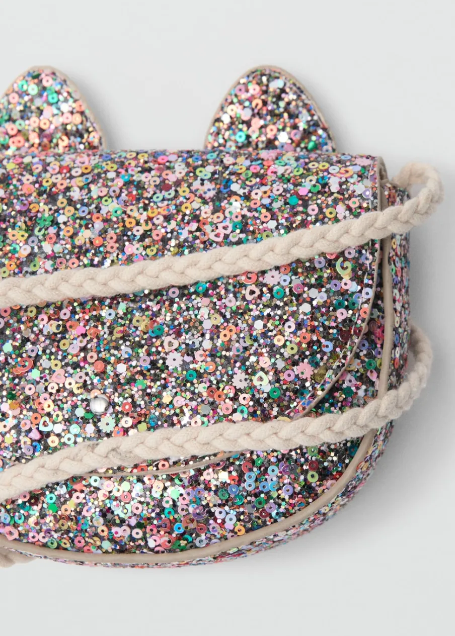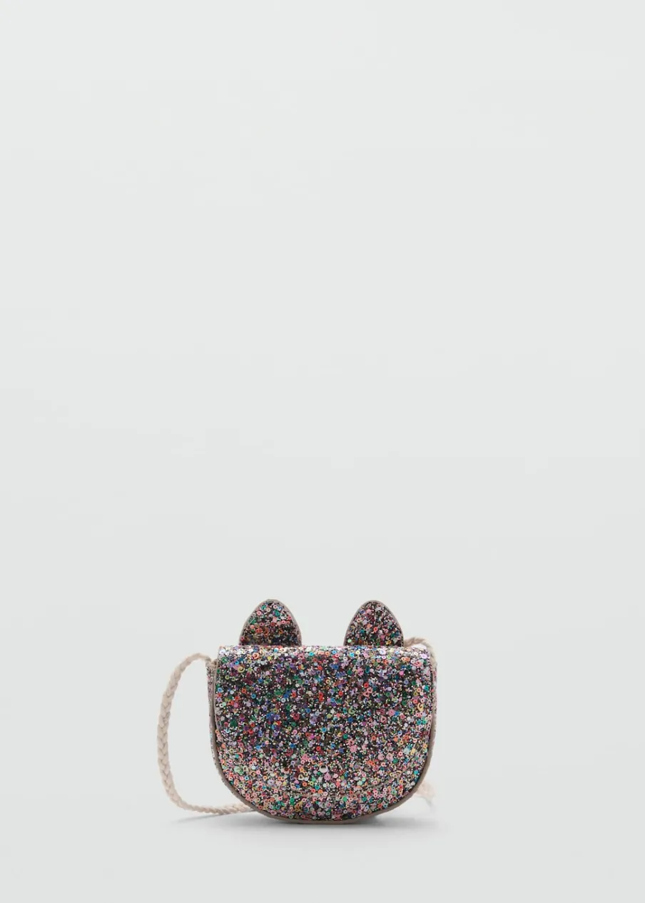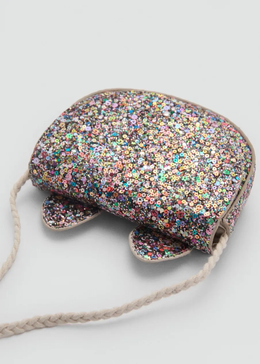 Ozdobny brokat. Długi uchwyt. Wystające uszy misia. Metalowe zapięcie.