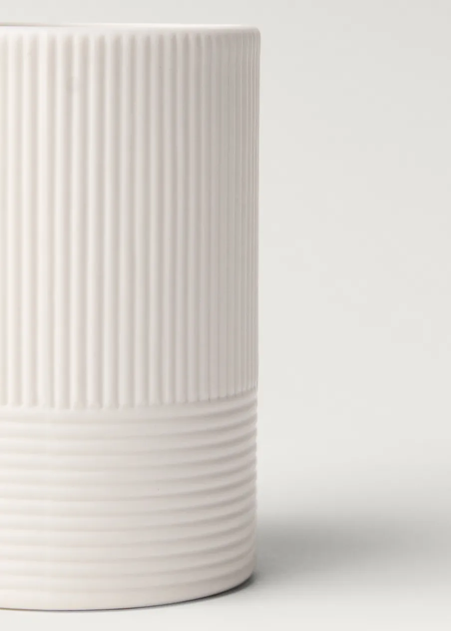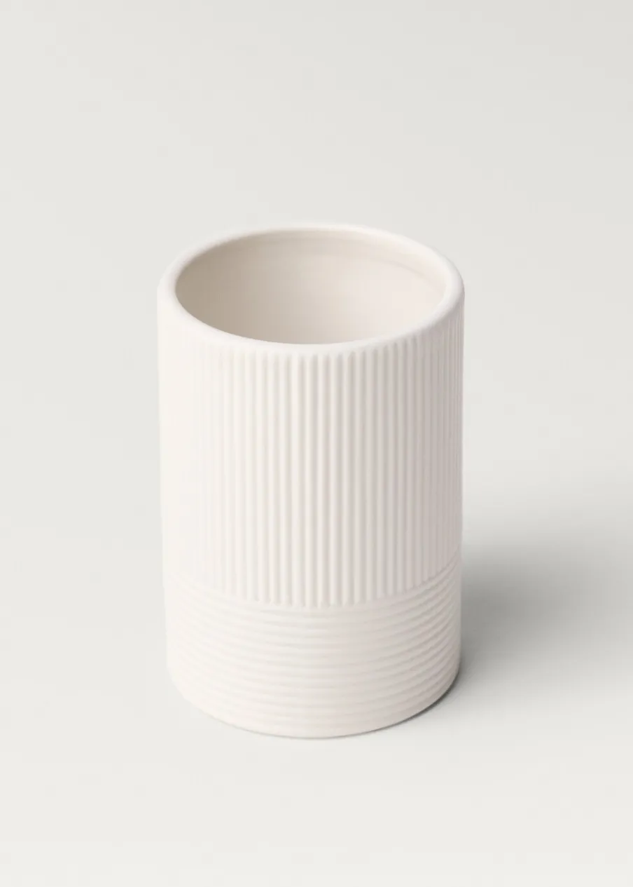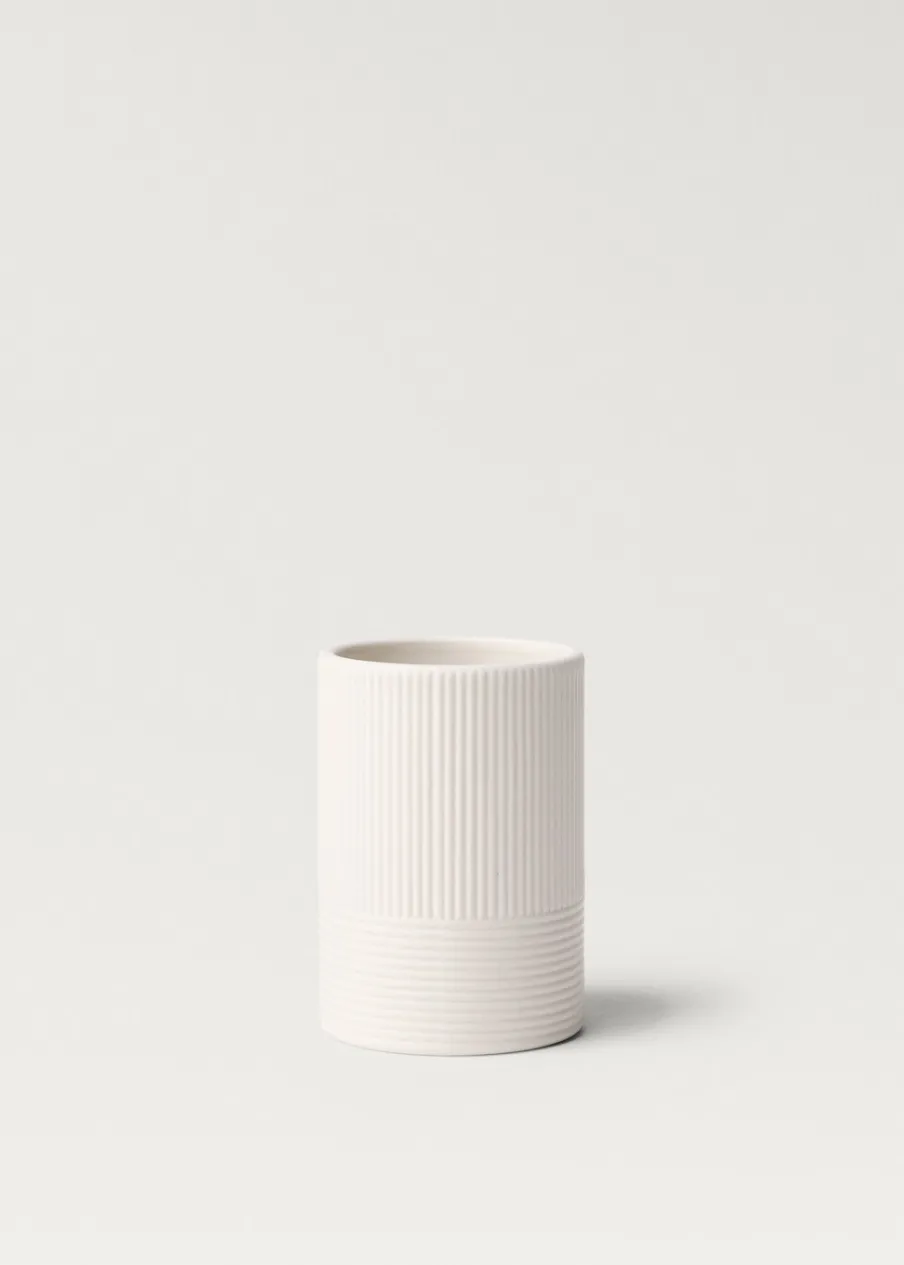 Pojemnik na szczoteczki do łazienki. 100% kamionka. Model wypukły. Tworzy ciepłą i przyjemną atmosferę. Pasuje do innych artykułów z kolekcji.