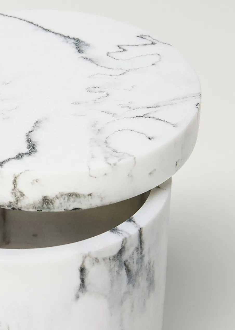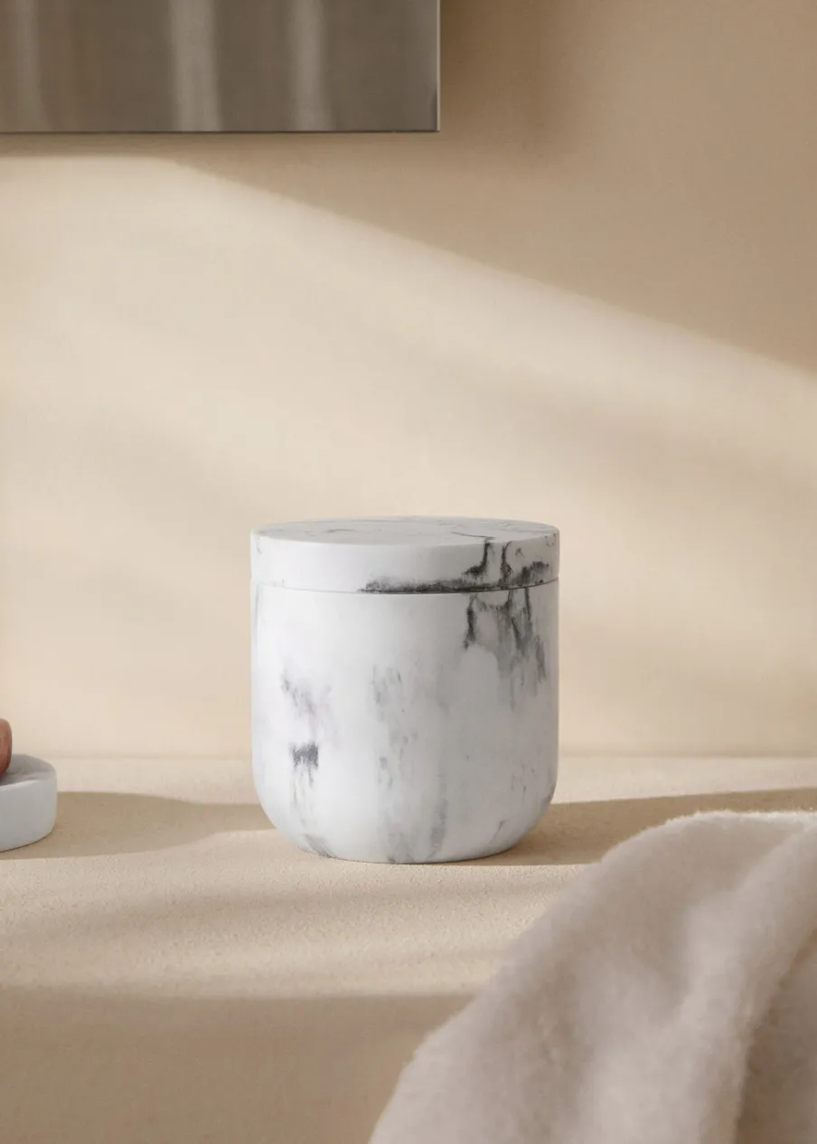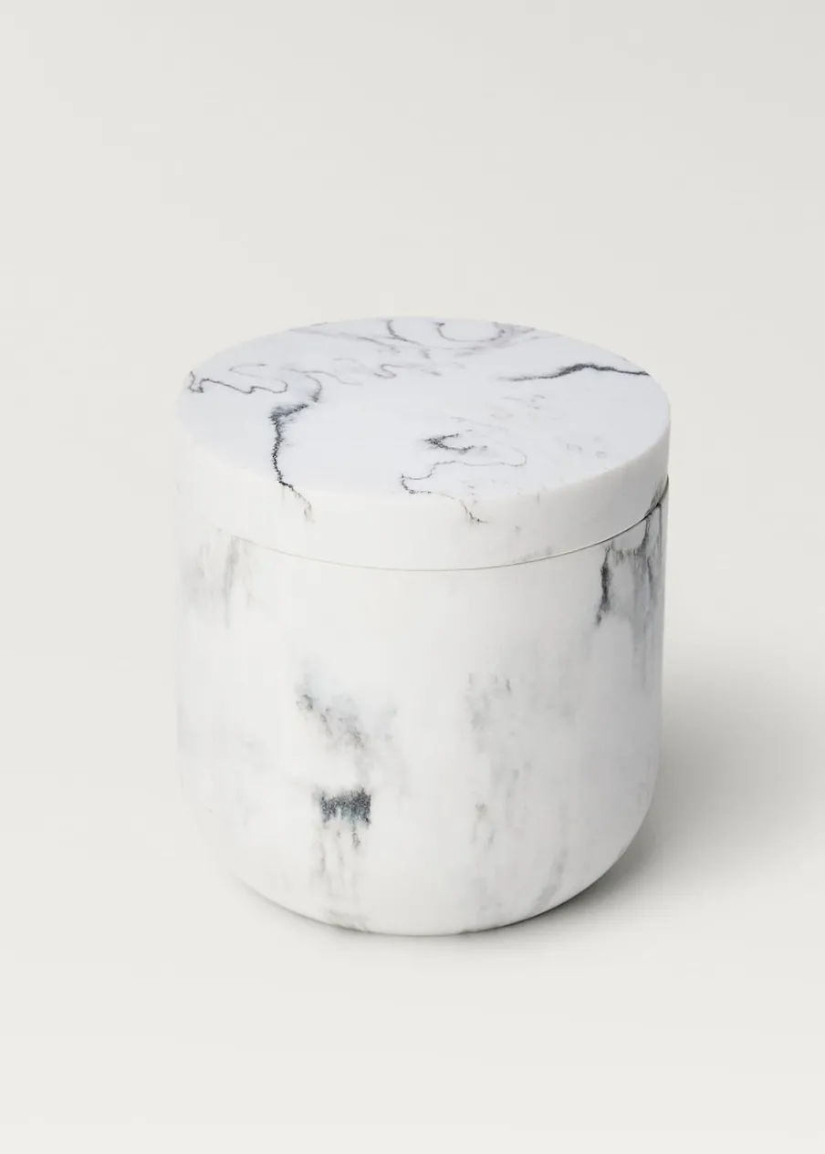 100% żywica. Marmurkowy wzór. Wymiary: 10,4 x 10,9 cm. Z pokrywą. Do przechowywania drobnych przedmiotów. Doda przytulny i ciepły akcent. Pasuje do innych artykułów z kolekcji.
