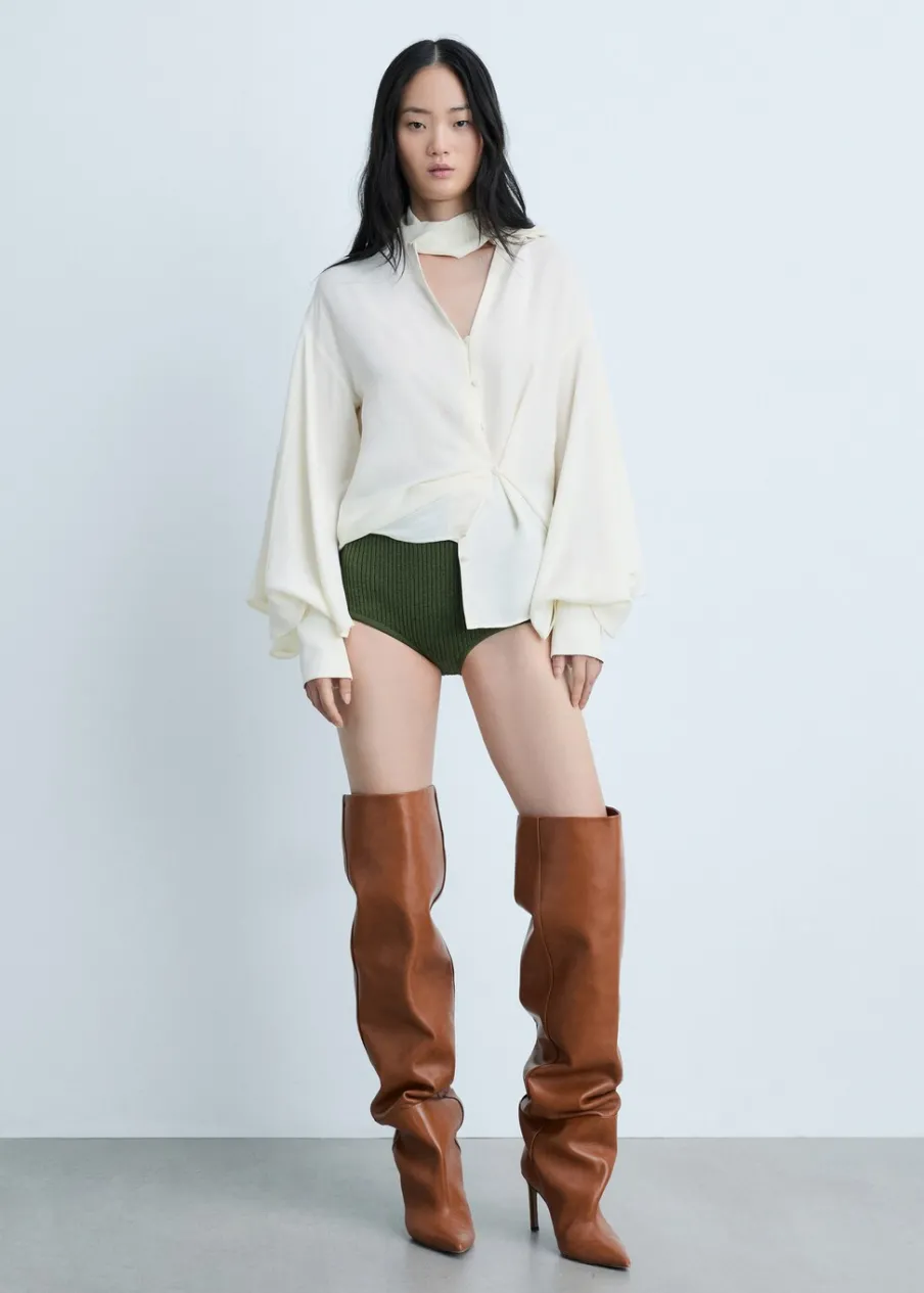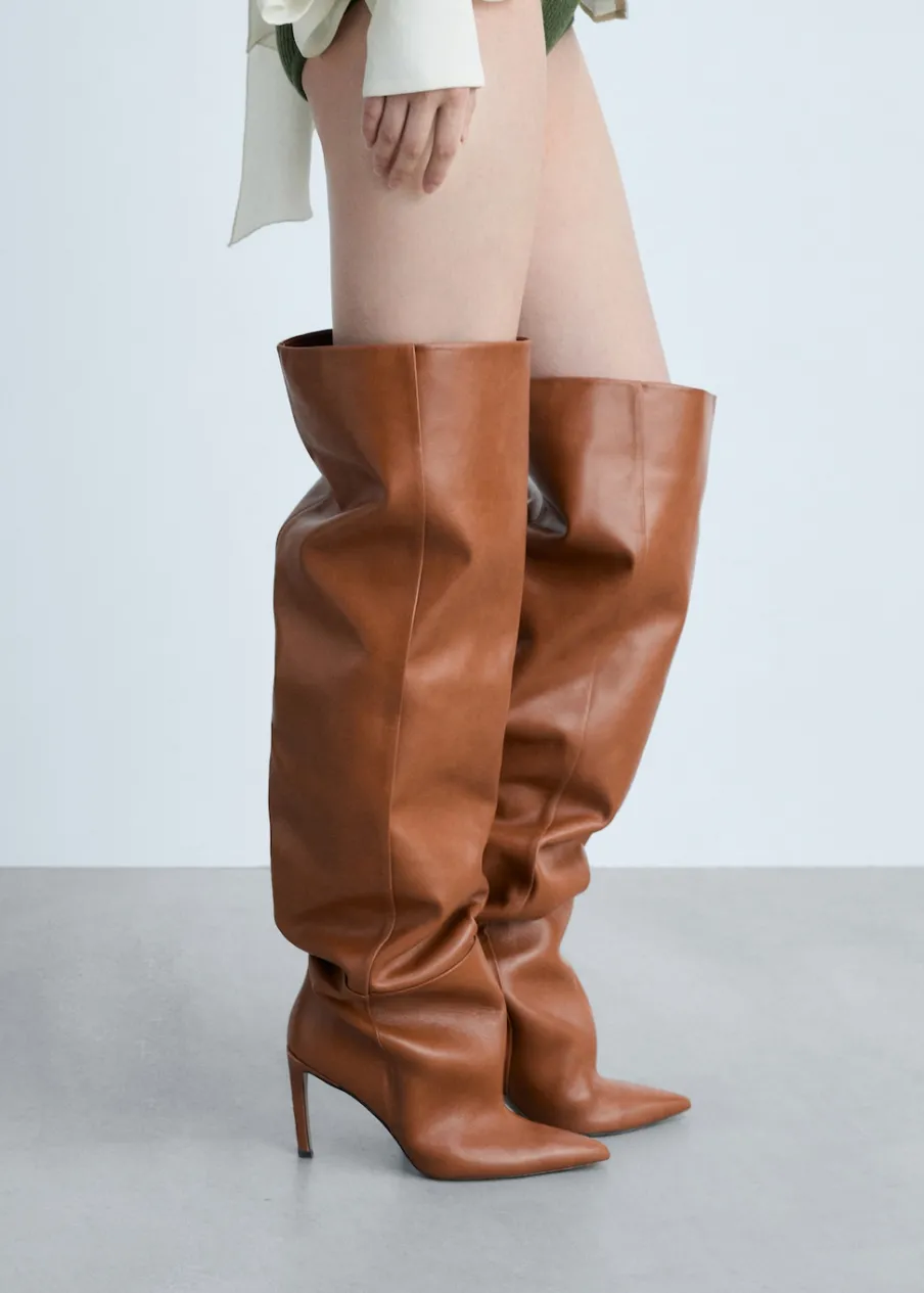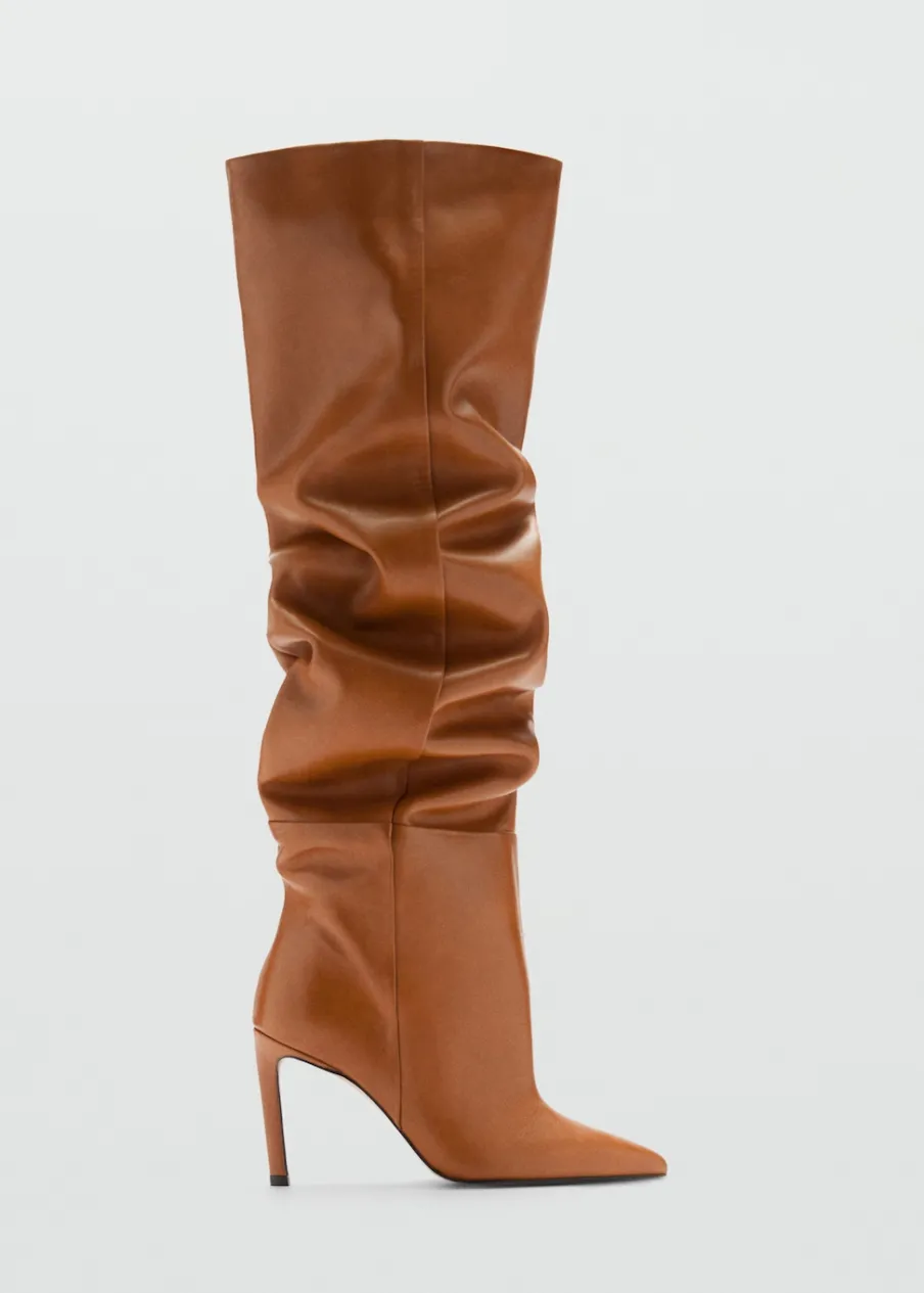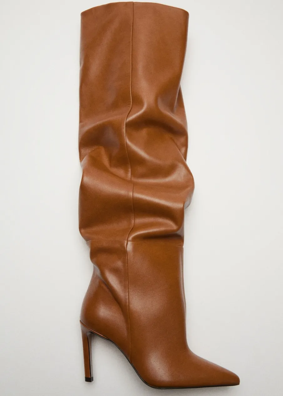 100% skóra bydlęca. Wysoka cholewka. Obcas szpilka. Spiczaste zakończenie. Obcas mierzy 7 cm. Bez zapięcia. Marszczony detal. Wyłącznie online.