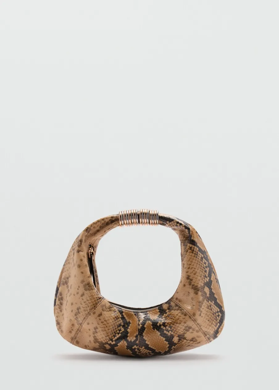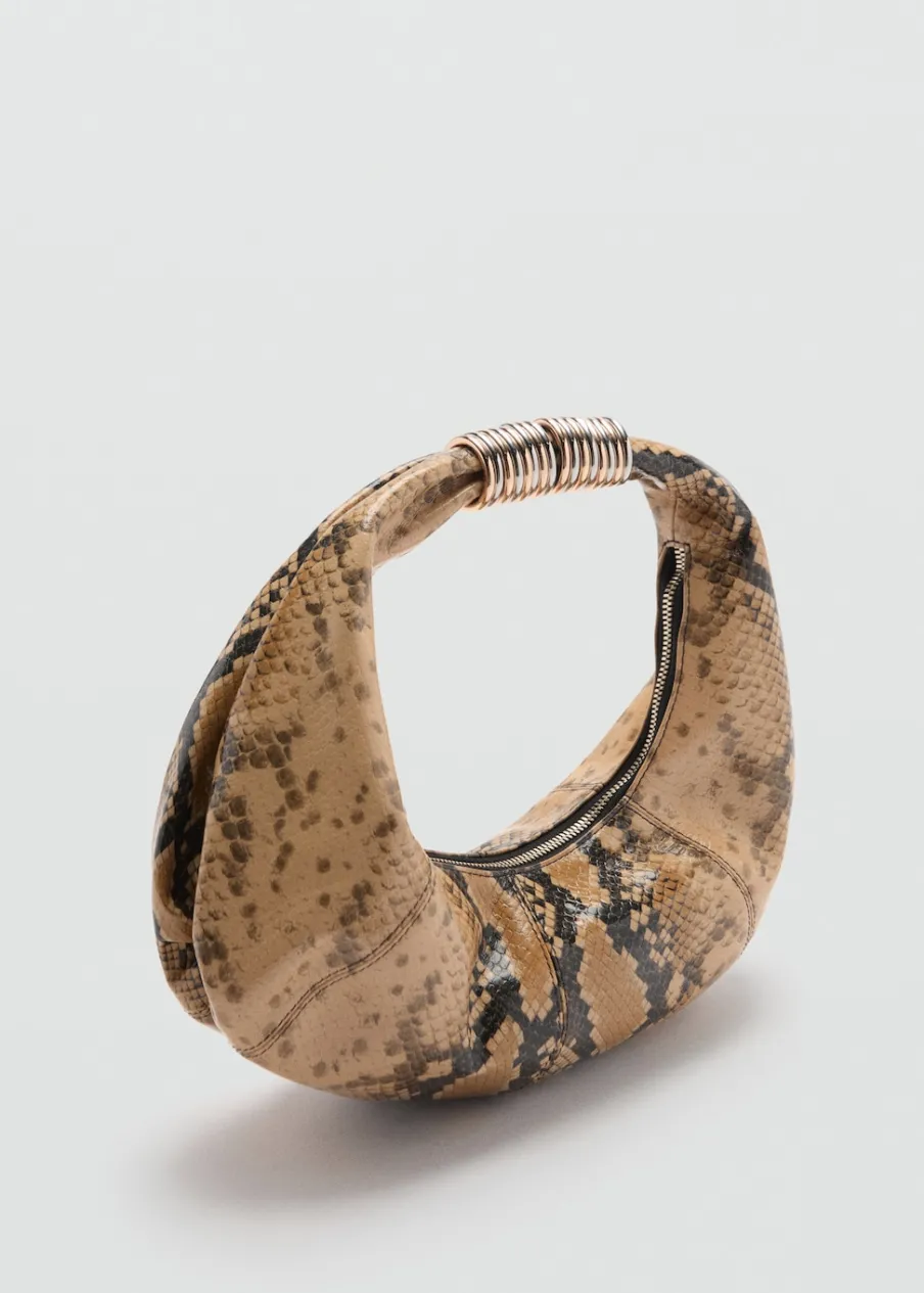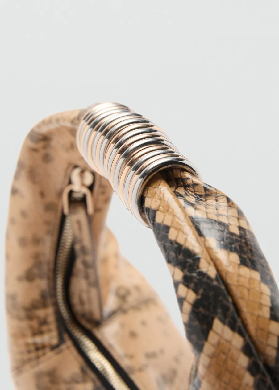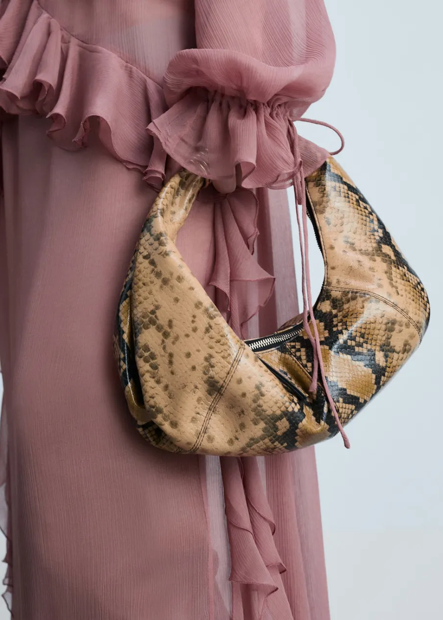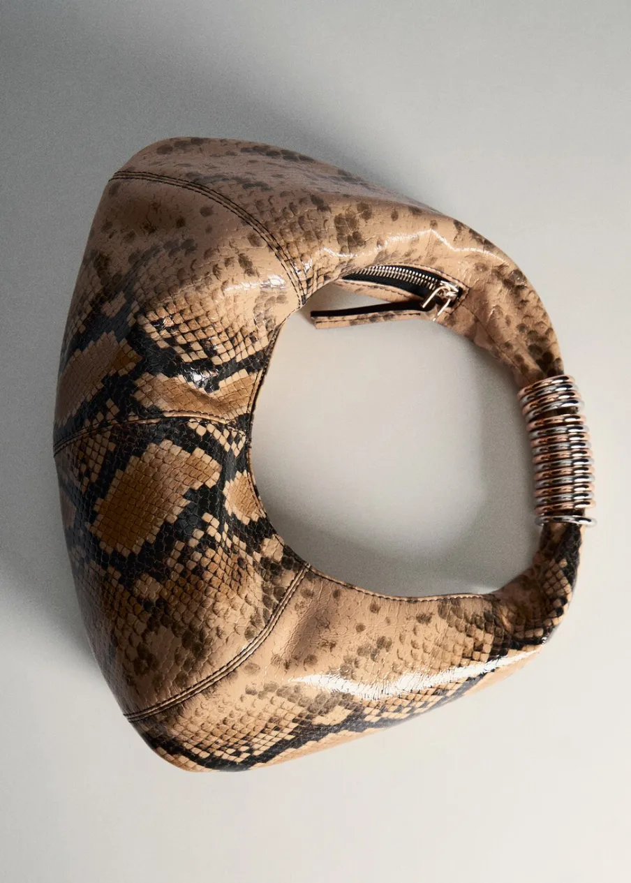 Skóra owcza 100%. Mała wielkość. Wzór wężowej skóry. Pasek na ramię. Z uchwytem. Zapięcie na suwak. Metalowy element. Zwierzęcy wzór.