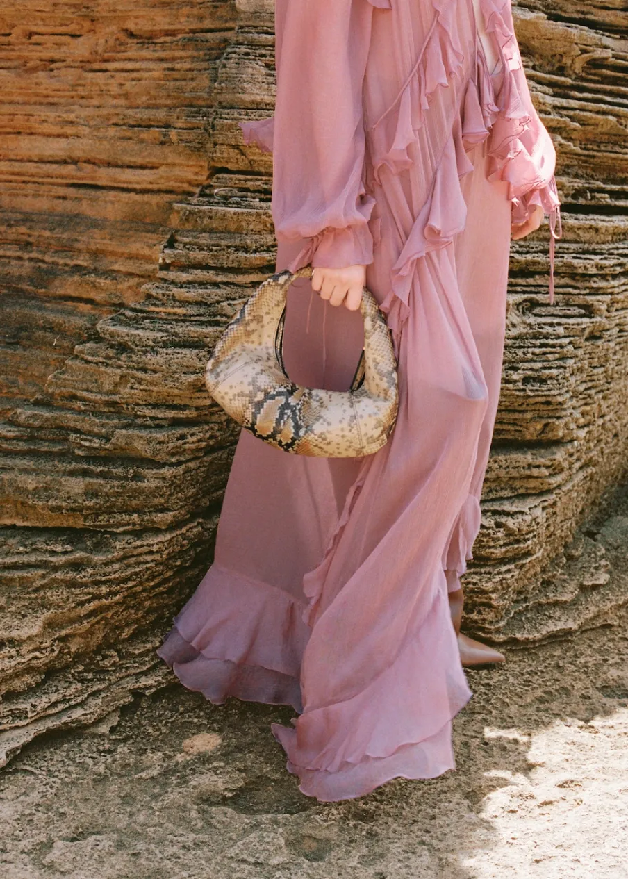 OpisSkóra owcza 100%. Mała wielkość. Wzór wężowej skóry. Pasek na ramię. Z uchwytem. Zapięcie na suwak. Metalo…