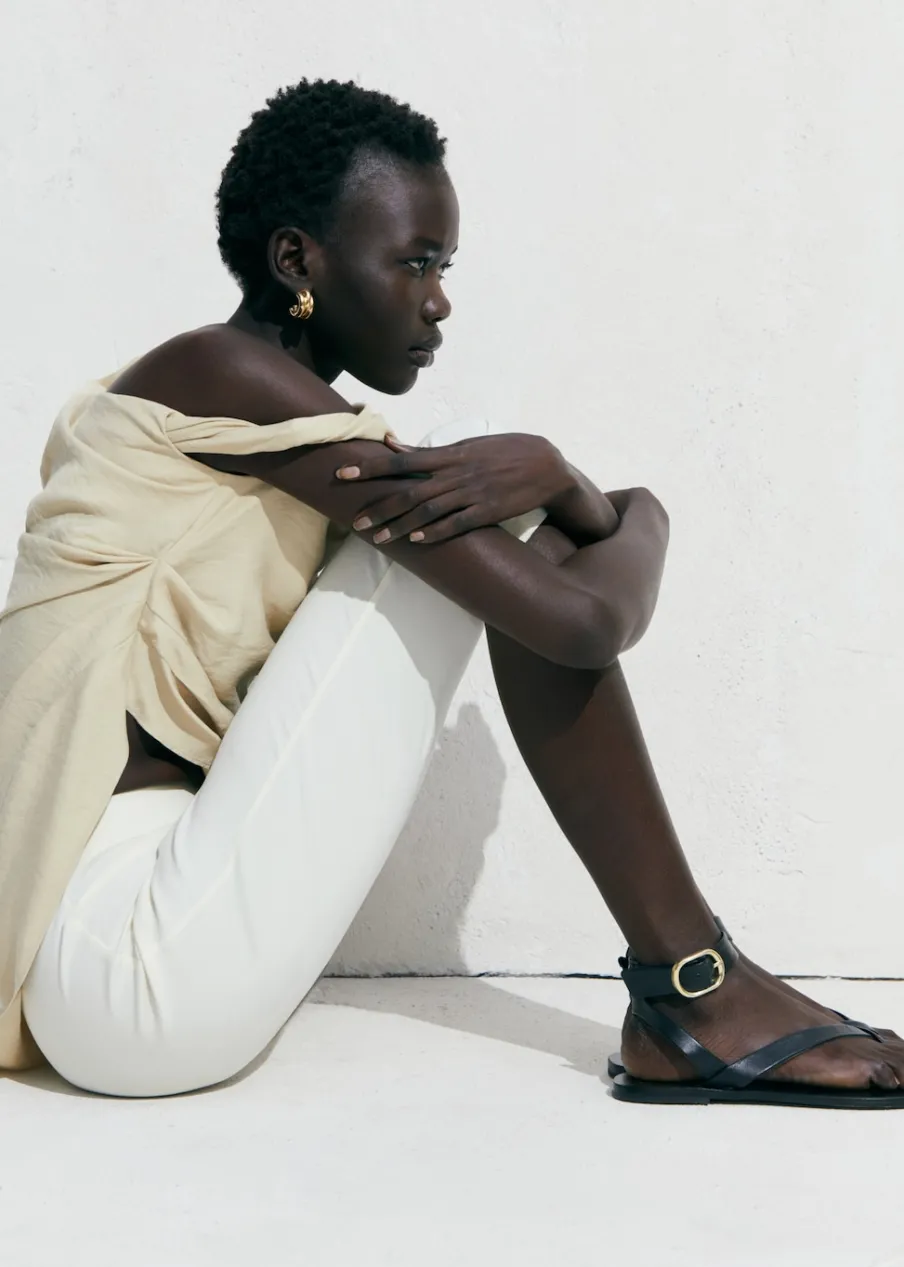 Skóra owcza 100%. Płaska podeszwa. Model z paskami. Zapięcie na klamrę. Sezon festiwalowy. Model z paskiem między palcami.
