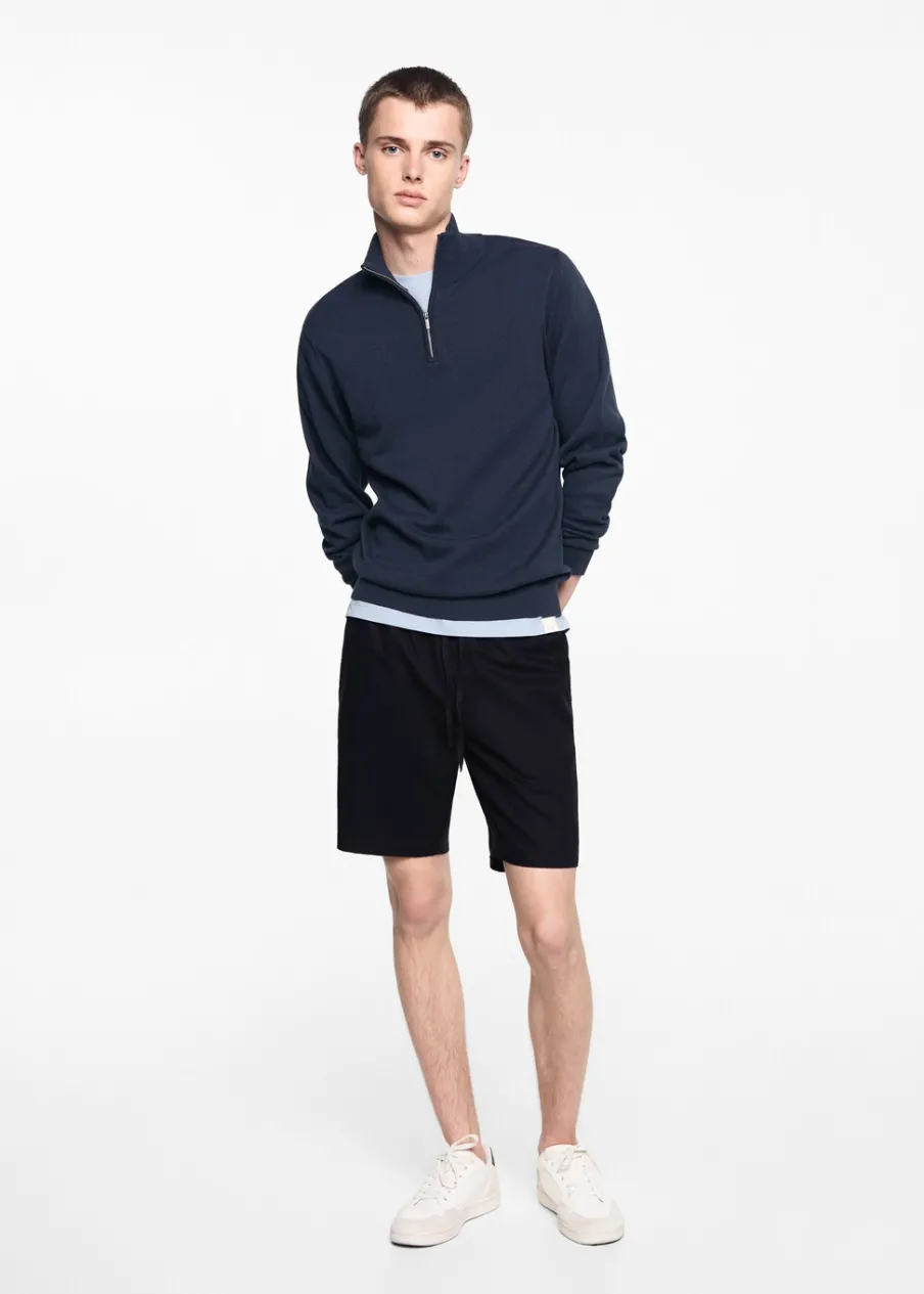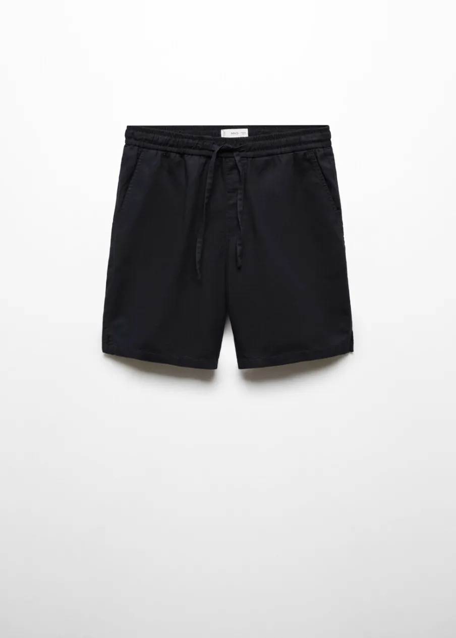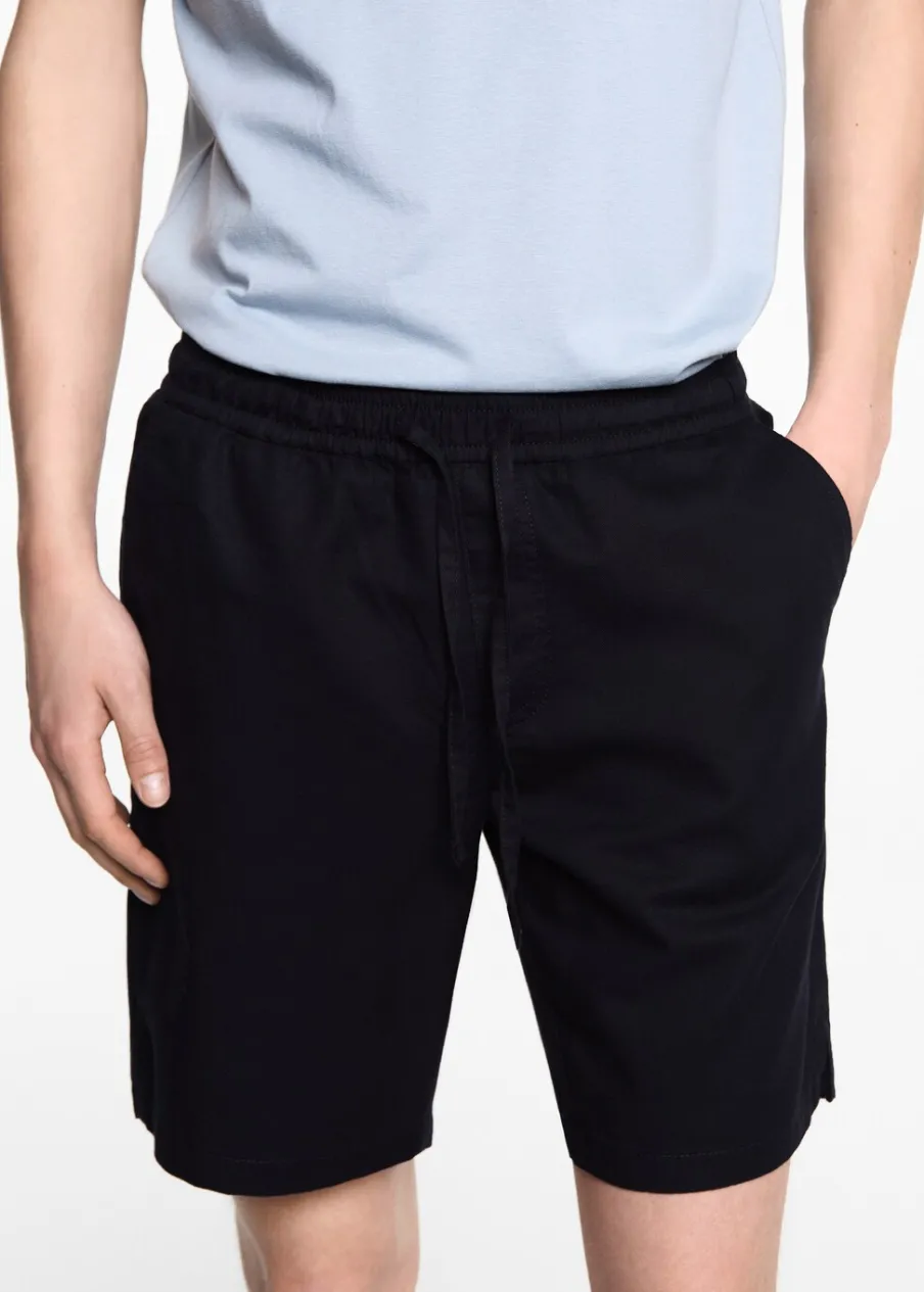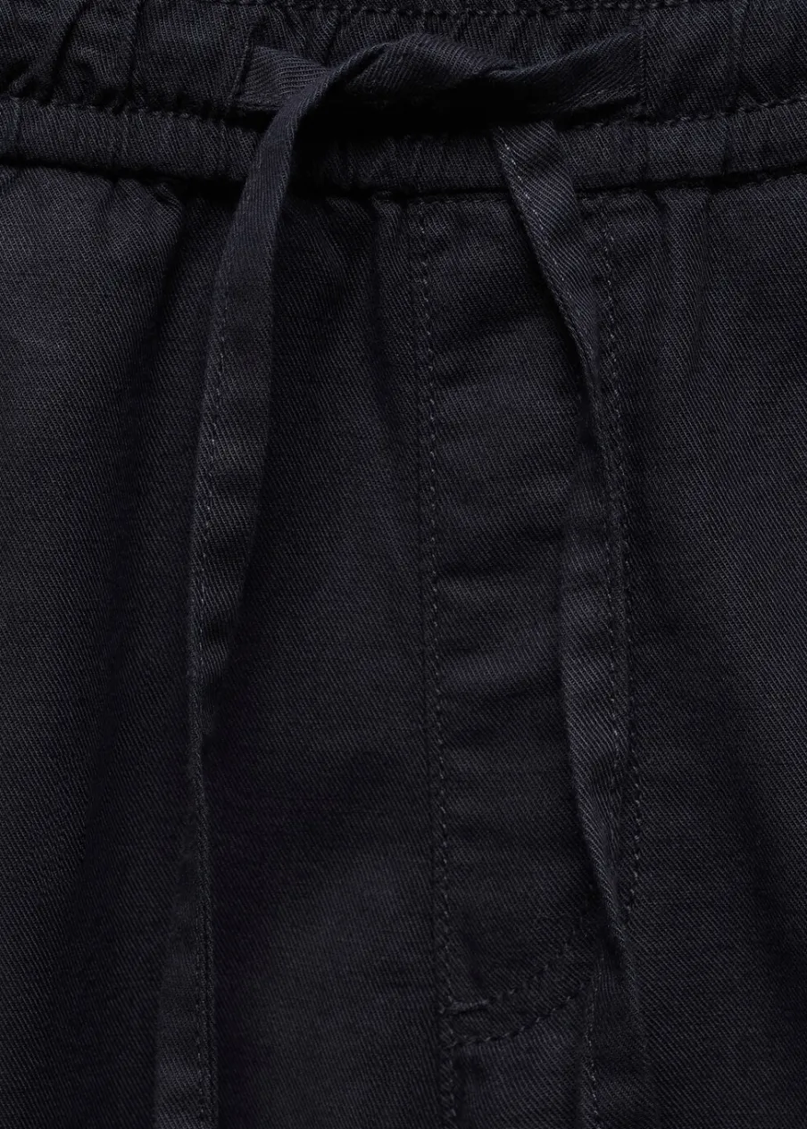Tkanina mieszanka bawełny i lnu. Krótki krój. Model prosty. Elastyczny pas. Dwie kieszenie z patką. Nakładana kieszeń z tyłu. Wiązanie na sznurek. Średni stan. Średnia wielkość.