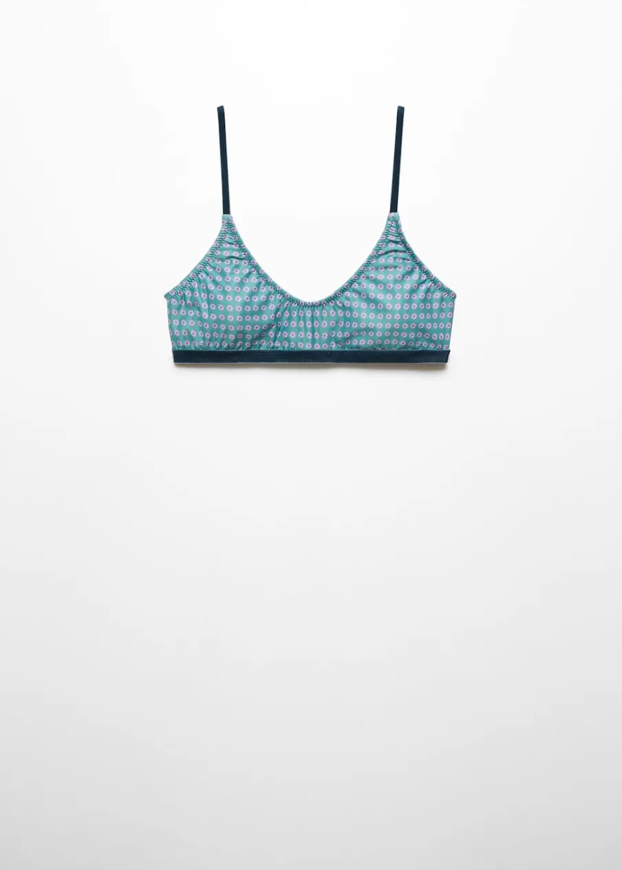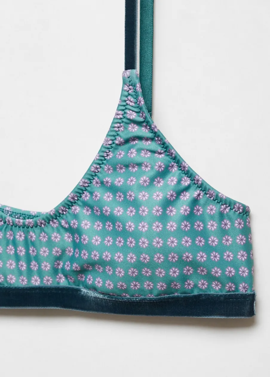 OpisRegulowane ramiączka. Aksamitne elementy. Wzorzysty. Piankowe wypełnienie. Bez zapięcia.