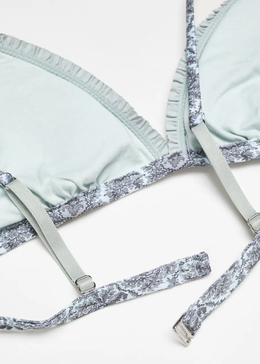 Wzorzysty. Bawełniana podszewka. Model trójkątny. Piankowe wypełnienie. Zapięcie z tyłu.