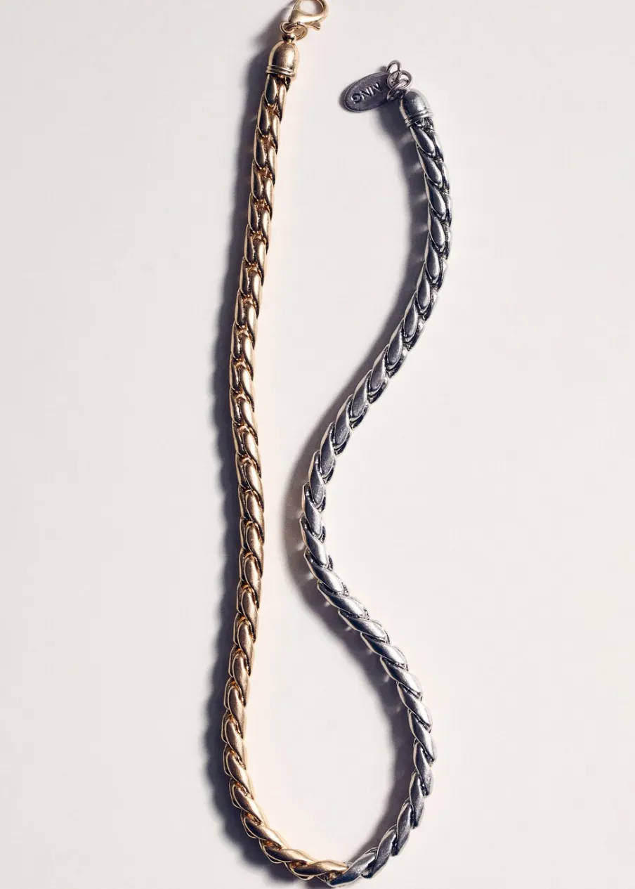 W formie łańcucha. Dwukolorowy deseń. Zapięcie na łańcuszek i karabińczyk.