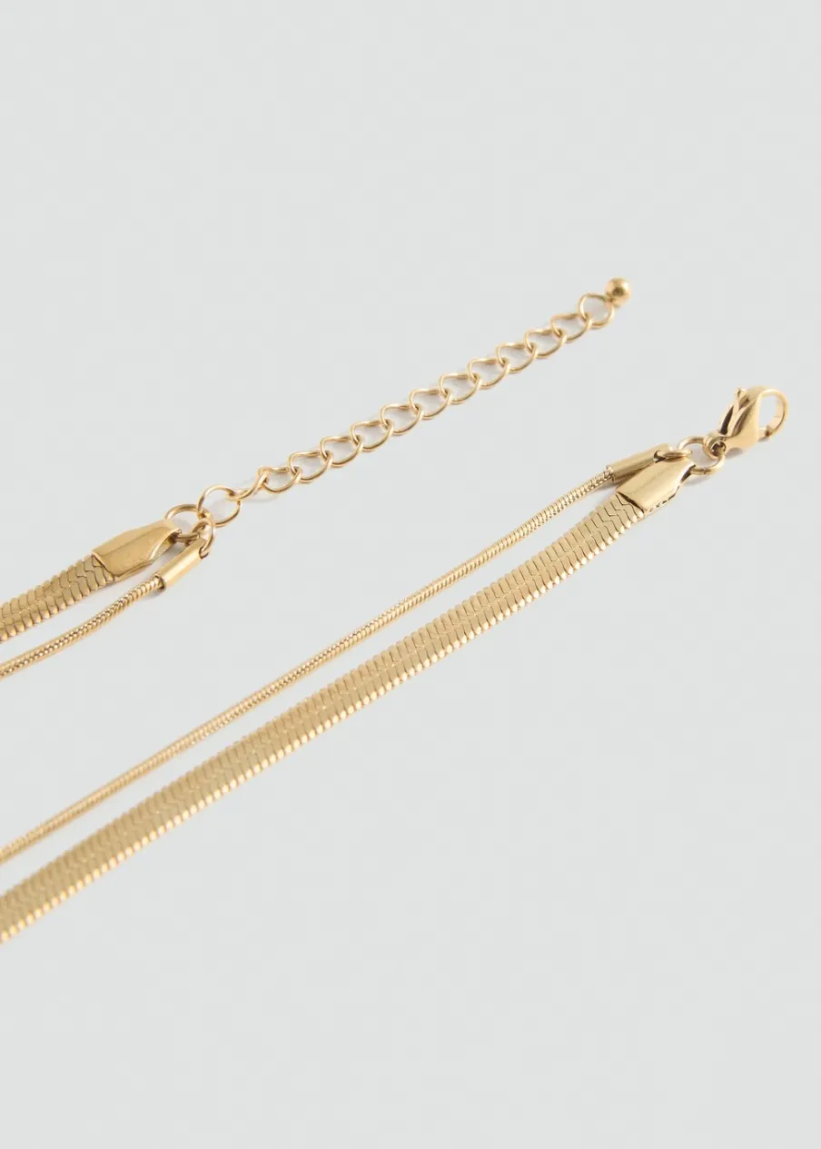 W formie łańcucha. Płaski łańcuszek. Zapięcie na haftkę.