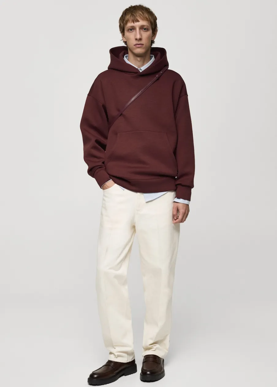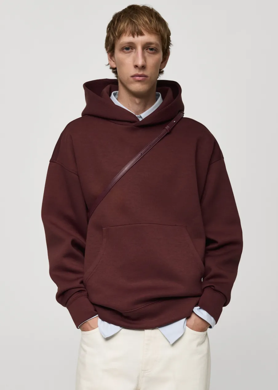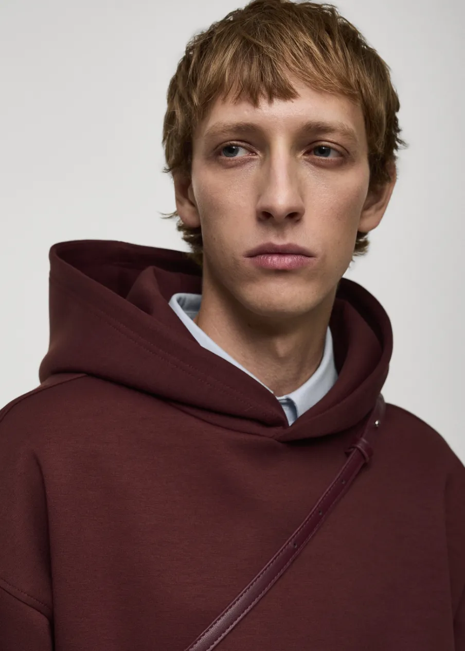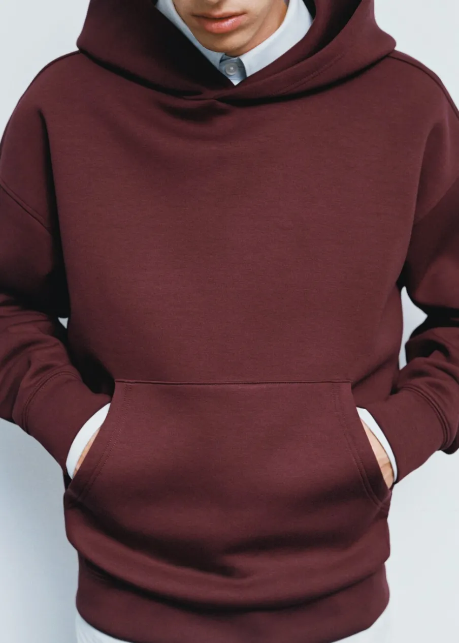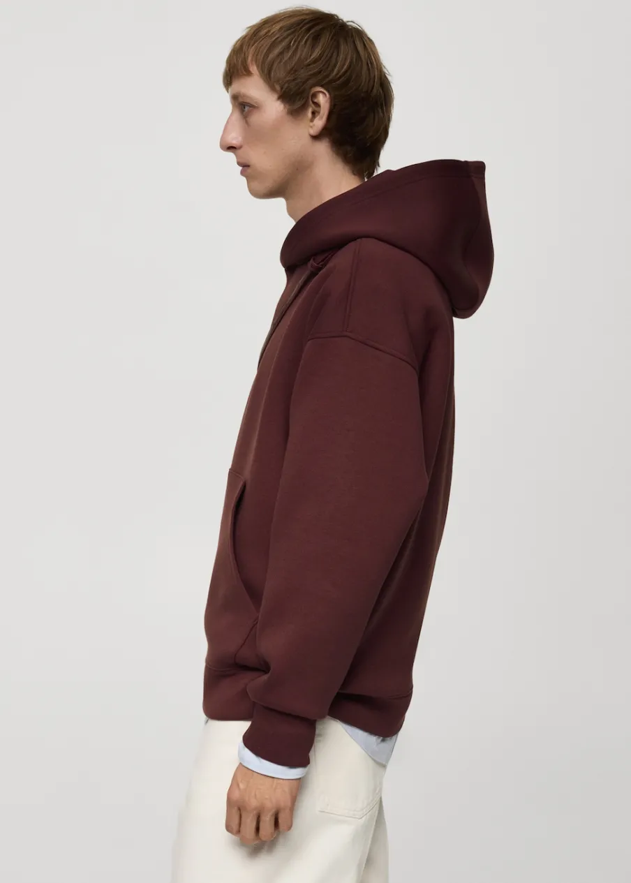 Z kapturem. Kieszeń kangurka. Model ma 190 cm wzrostu i nosi rozmiar M. Relaxed fit. Materiały z recyklingu. Długi rękaw wykończony ściągaczem.