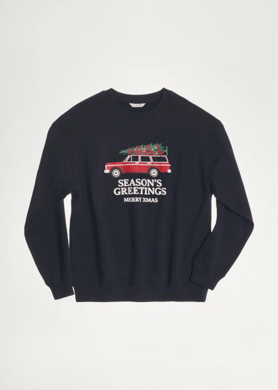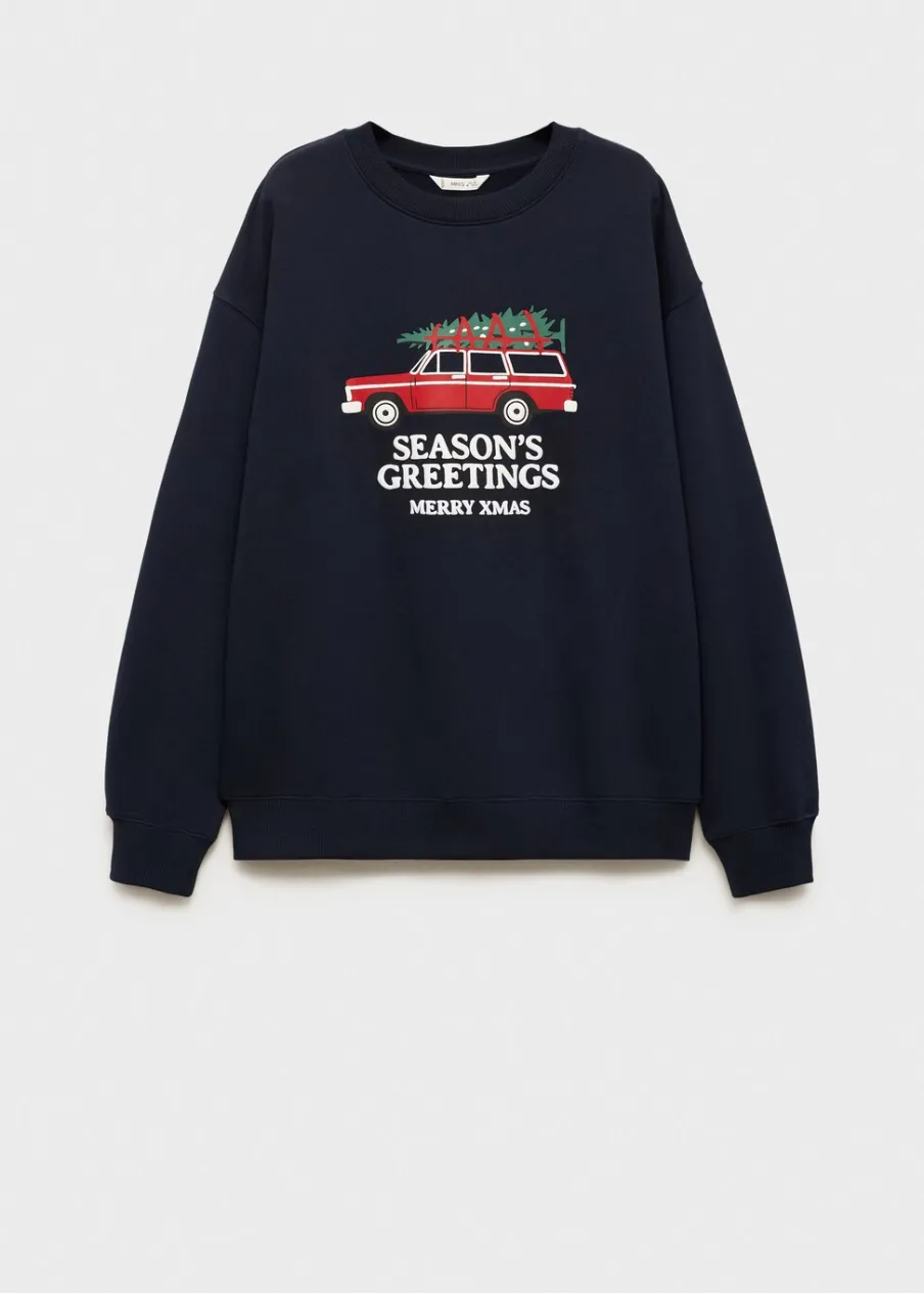 Bawełna 100%. Wzór świąteczne motywy. Model oversize. Długi rękaw. Okrągły dekolt. Ściągaczowe wykończenia. Kolekcja Bożonarodzeniowa.