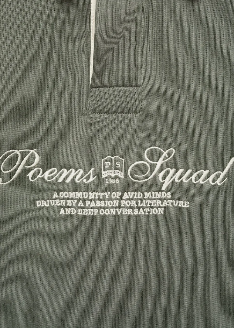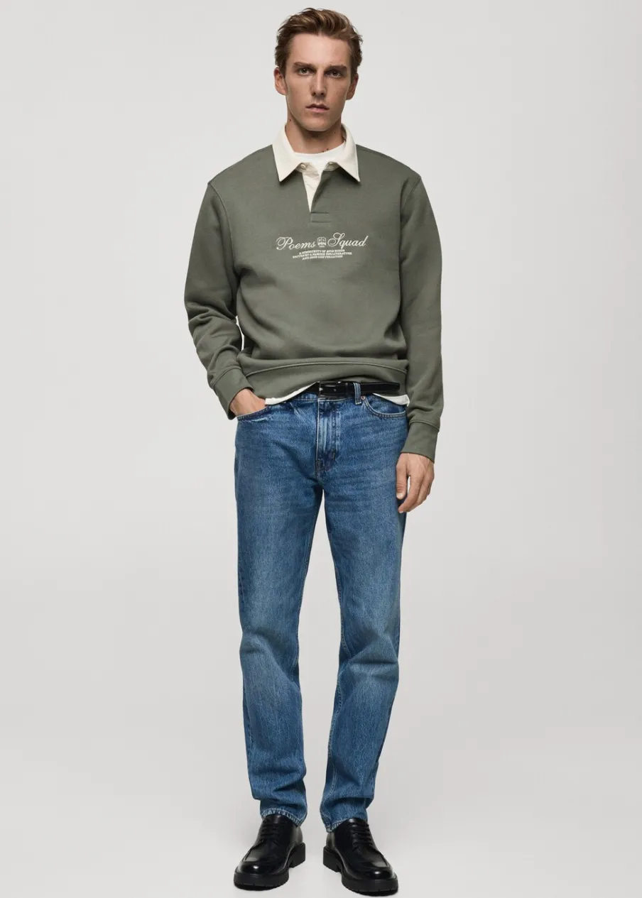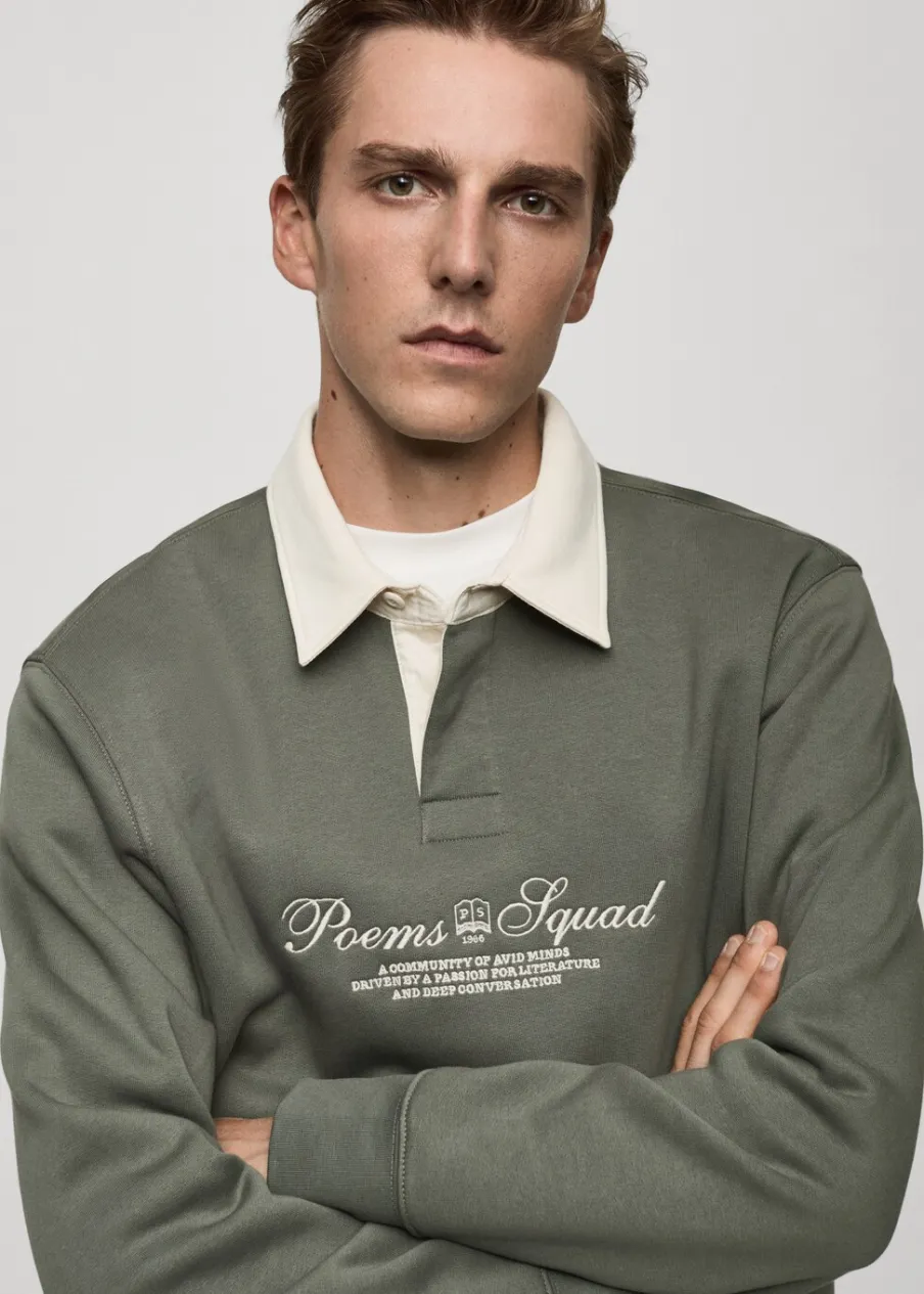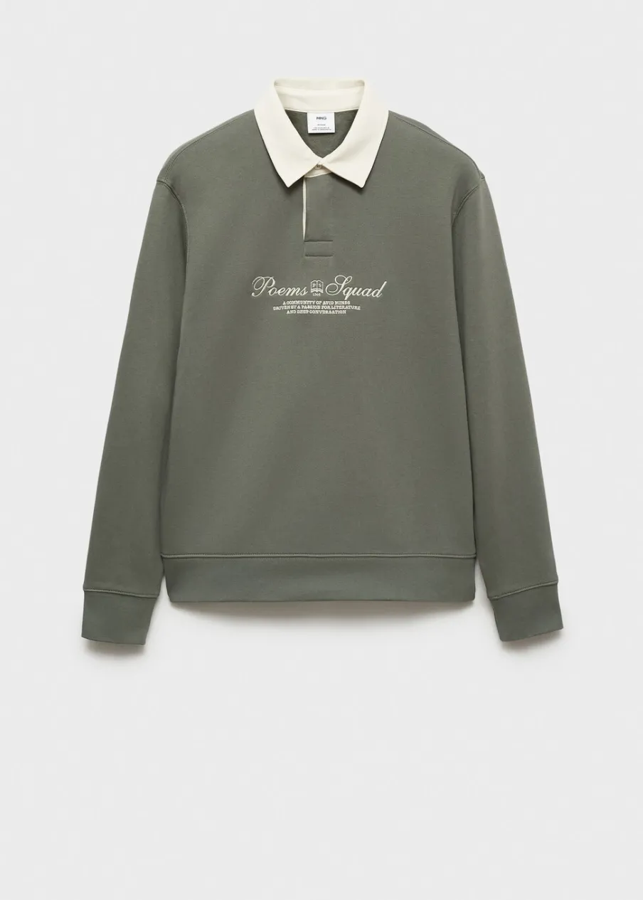 Krój regular. Bawełna 100%. Dzianina dresowa. Kołnierzyk polo. Nadruk tekstu z przodu. Mankiety i dół wykończone ściągaczem. Model ma 185 cm wzrostu i nosi rozmiar M.