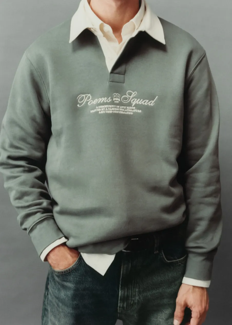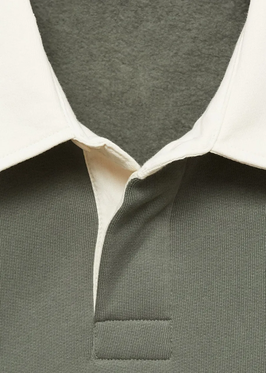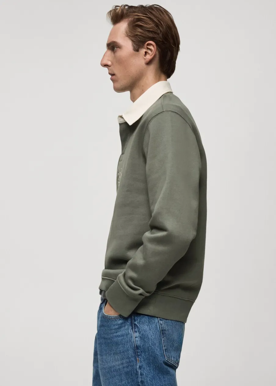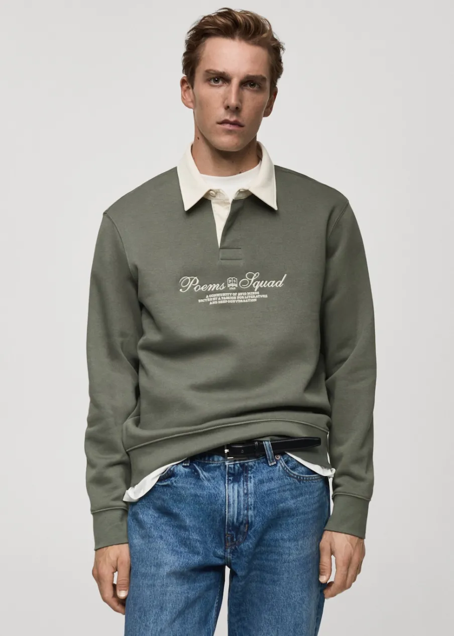 Krój regular. Bawełna 100%. Dzianina dresowa. Kołnierzyk polo. Nadruk tekstu z przodu. Mankiety i dół wykończone ściągaczem. Model ma 185 cm wzrostu i nosi rozmiar M.